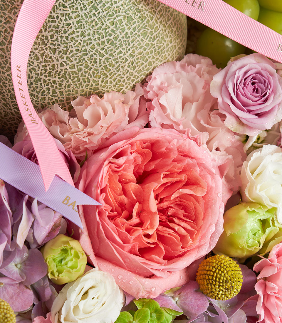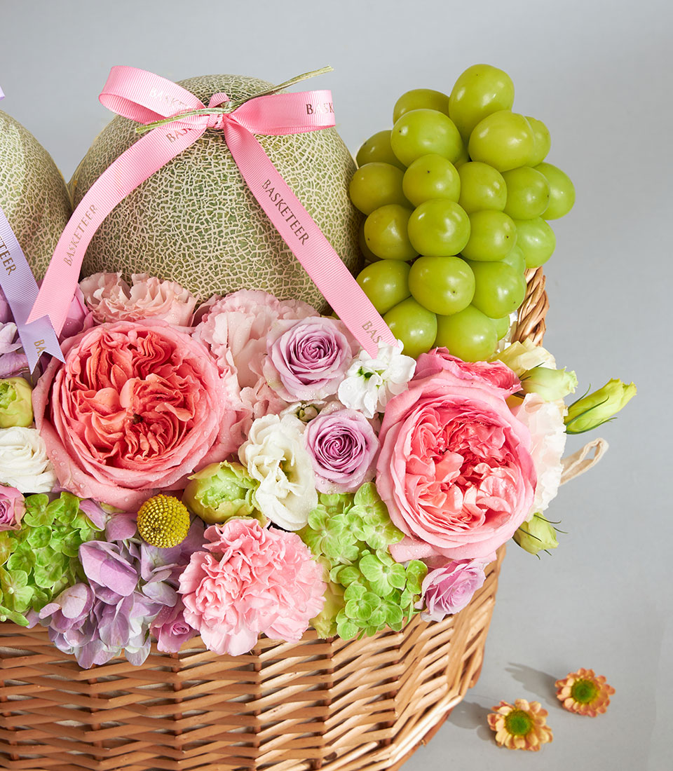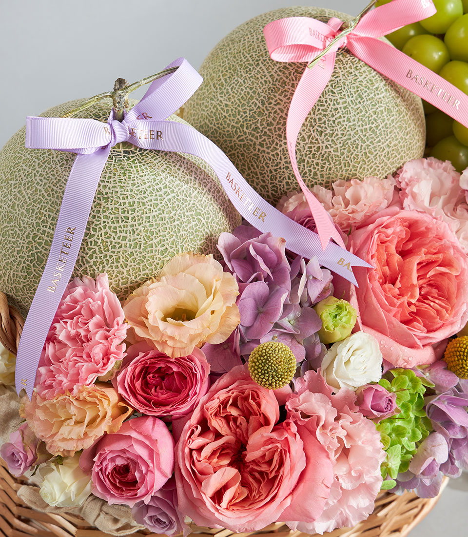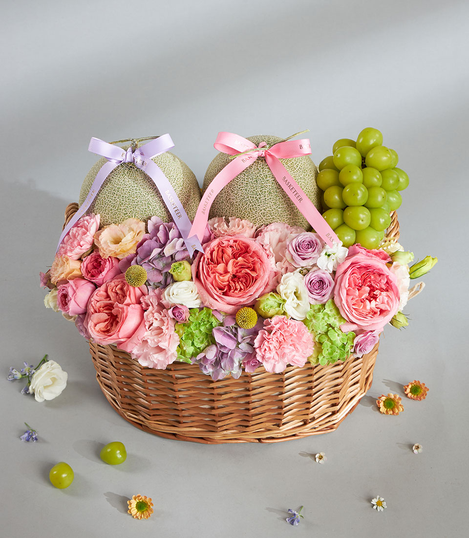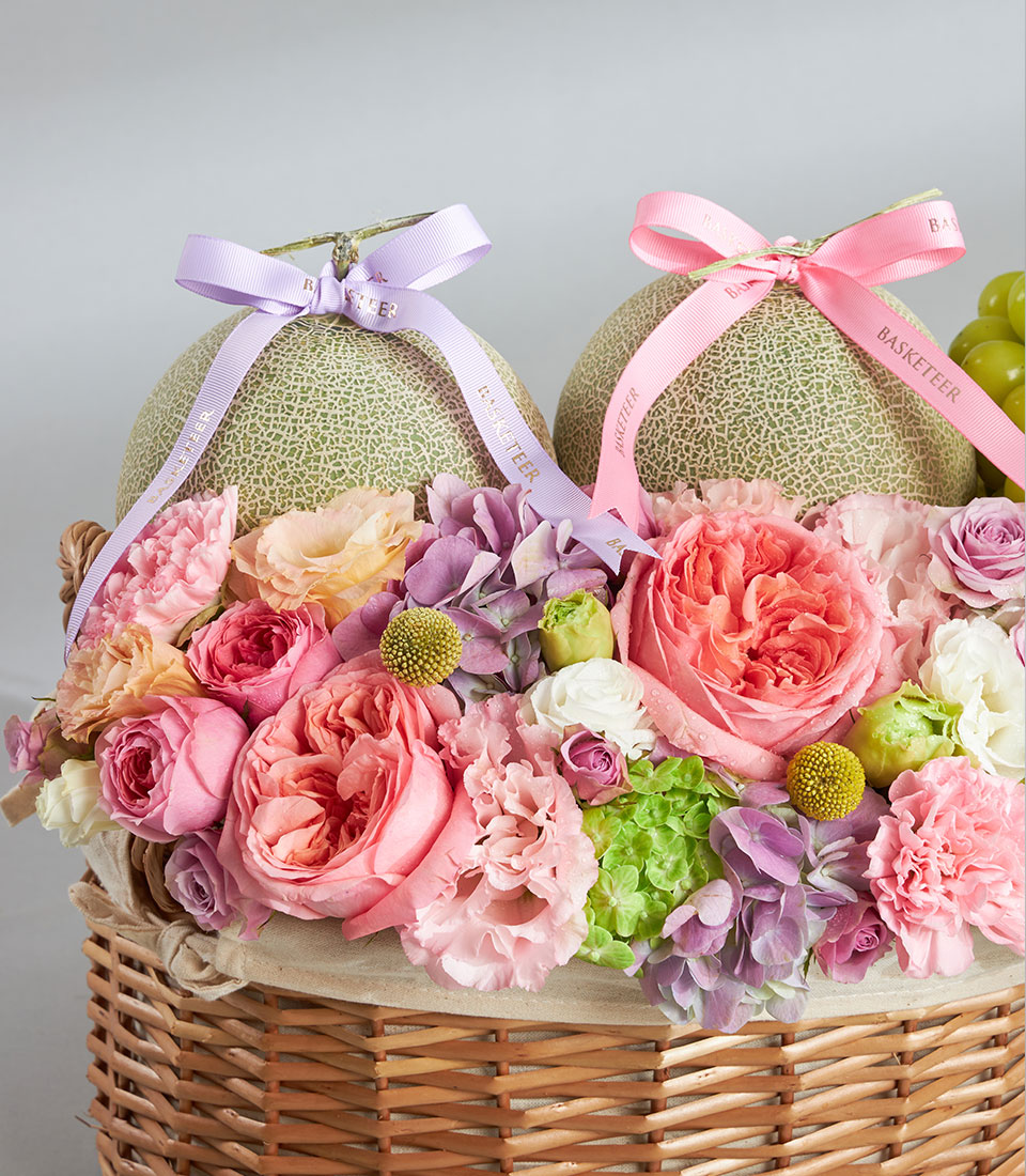 Japanese Melon & Shine Muscat Pastel Flower Basket A luxurious twin-melon gift basket featuring premium Japanese Jie Tai melons and sweet Shine Muscat grapes, styled with romantic pastel blooms in a handwoven basket. This elegant design is perfect for sending heartfelt blessings, combining refreshing fruits with a soft, garden-inspired floral arrangement.