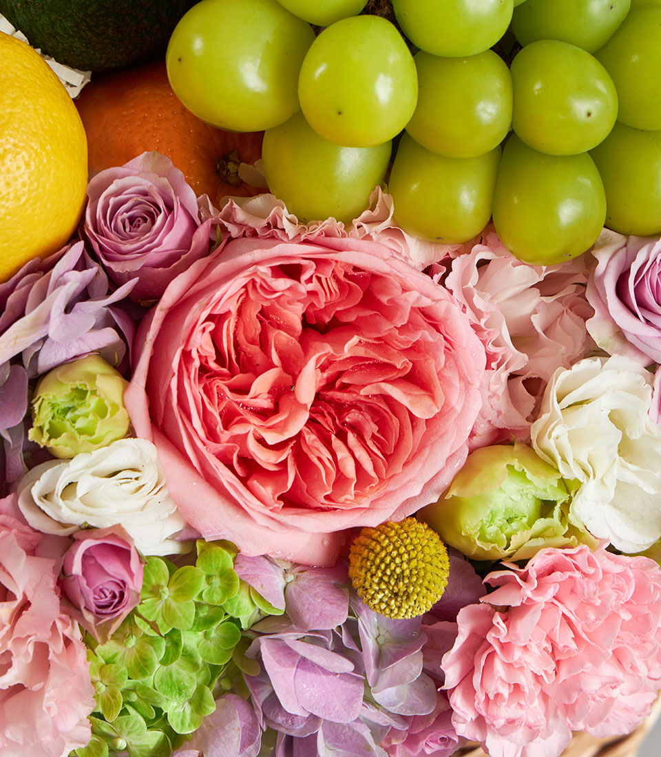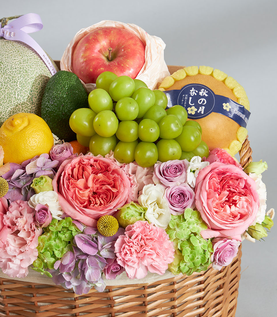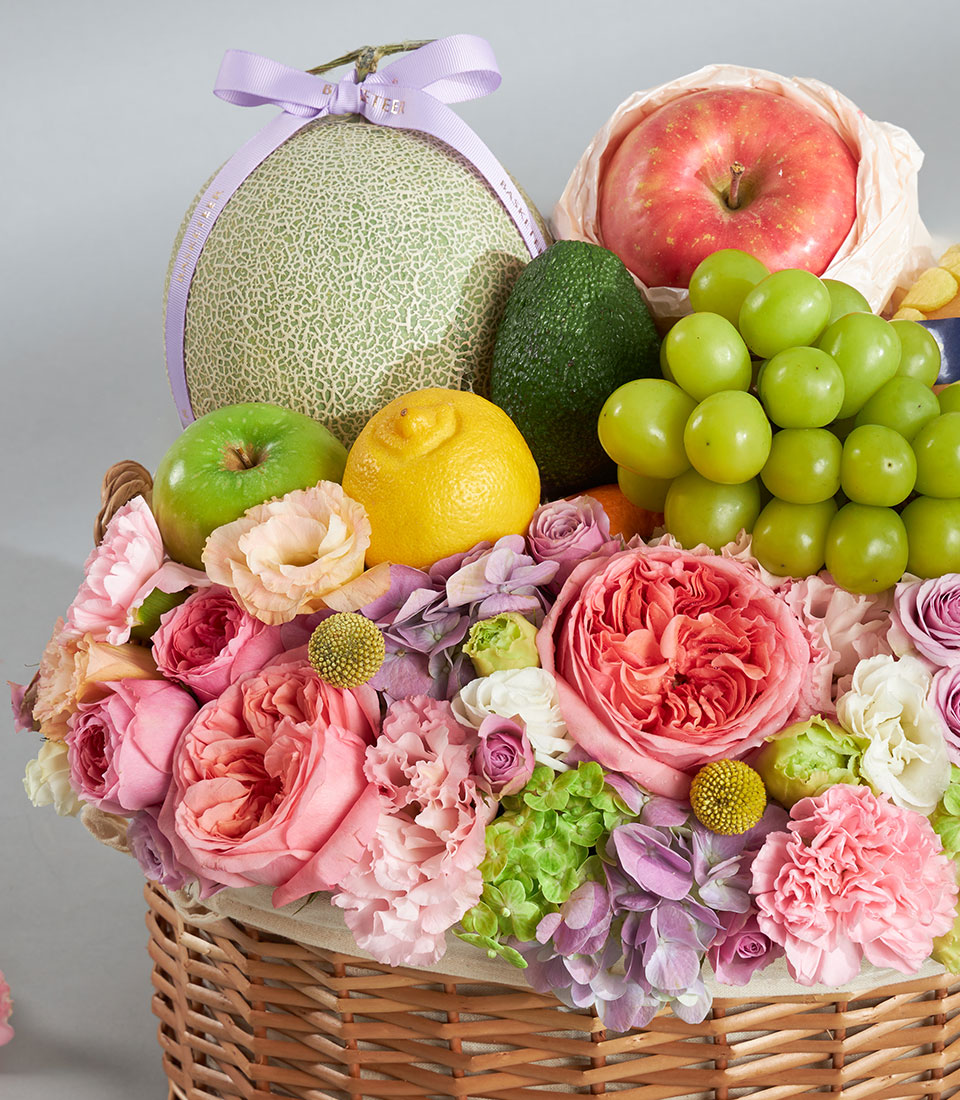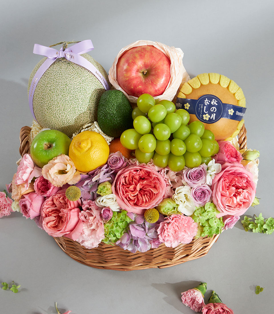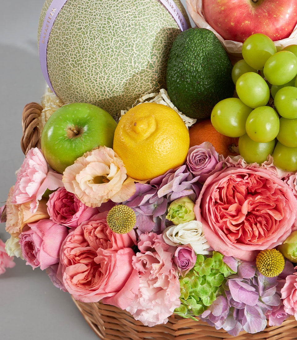 Pastel Romance Imported Fruit & Flower Basket A softly romantic pastel fruit and flower basket filled with premium imported apples, citrus and Japanese melon, paired with Shine Muscat grapes and lush seasonal flowers. Presented in a woven basket with blush pink tones, this design delivers a gentle, graceful expression of care and affection.