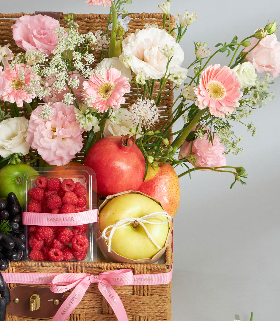 Premium Imported Fruit & Flower Basket – Rosy Meadow Garden Edition A romantic premium fruit and flower basket featuring an elegant mix of imported fruits and soft pink garden blooms. Arranged in a handwoven rectangular basket with Basketeer’s signature ribbon, this design delivers a feeling of tender care, freshness and refined celebration.