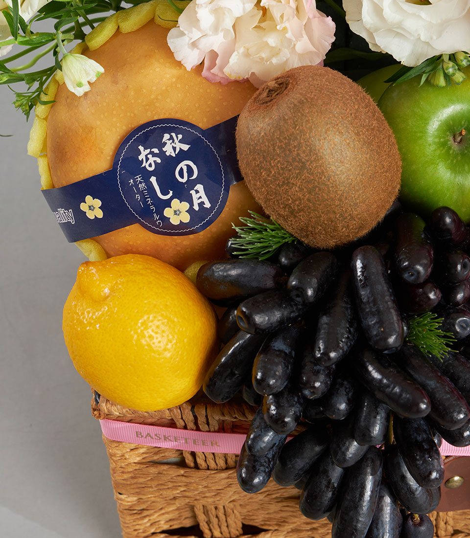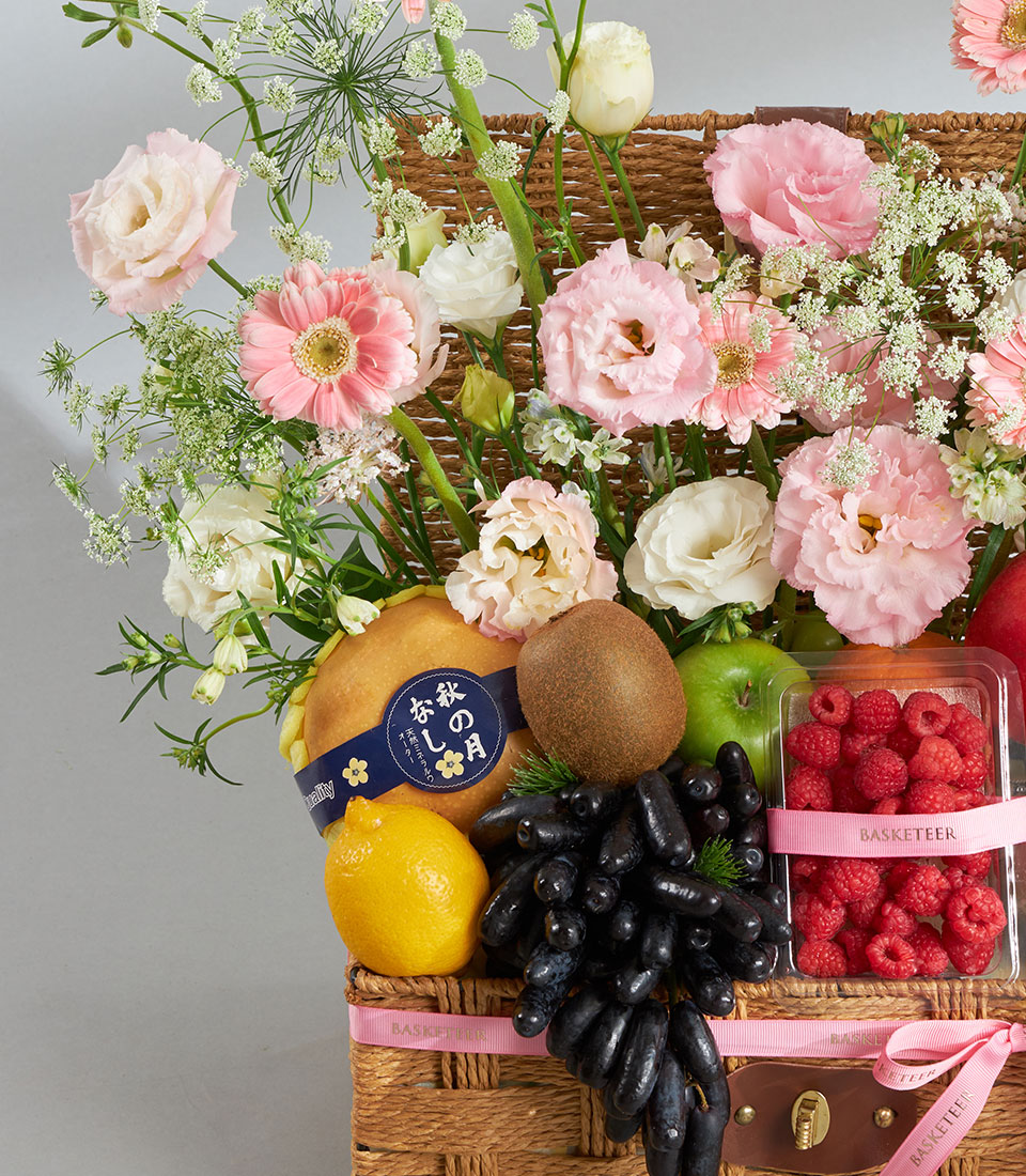 A beautifully curated premium fruit and floral basket featuring Moon Drop grapes, raspberries, Toki apple, Granny Smith, pomegranate, mixed pears, kiwi, lemon, and Sunkist orange. Paired with a charming pink pastel floral arrangement of roses, lisianthus, and seasonal blooms, this elegant gift delivers warmth, care, and a refined touch. Ideal for celebrations, get-well wishes, appreciation, and heartfelt gifting with same-day delivery in Bangkok.