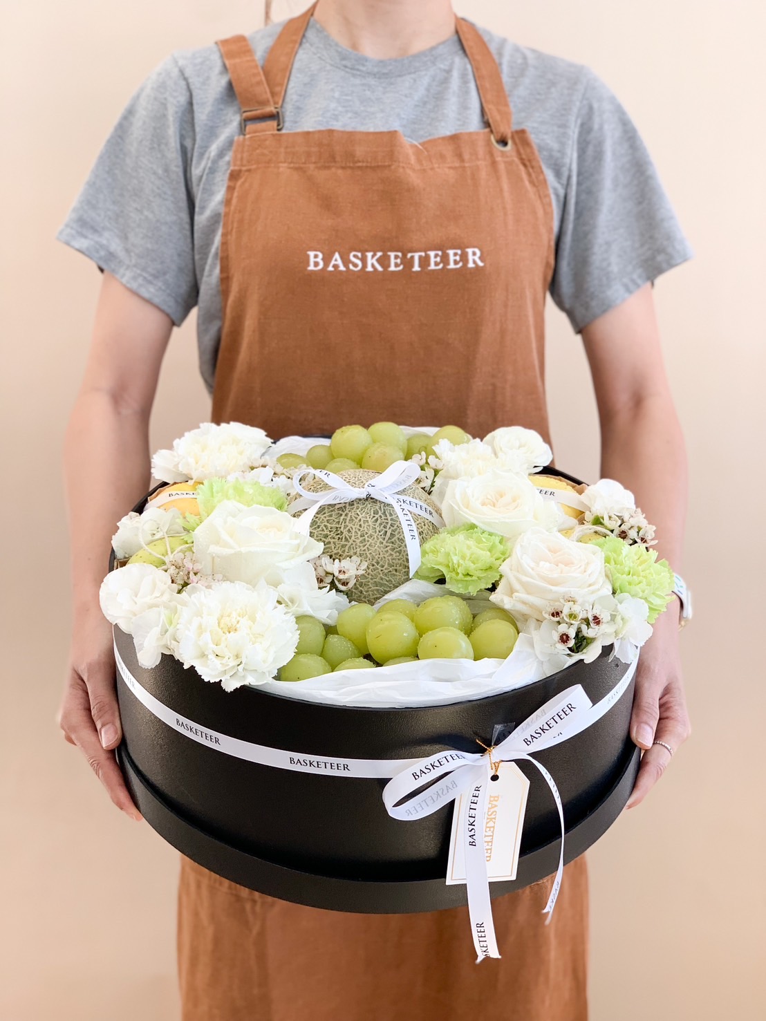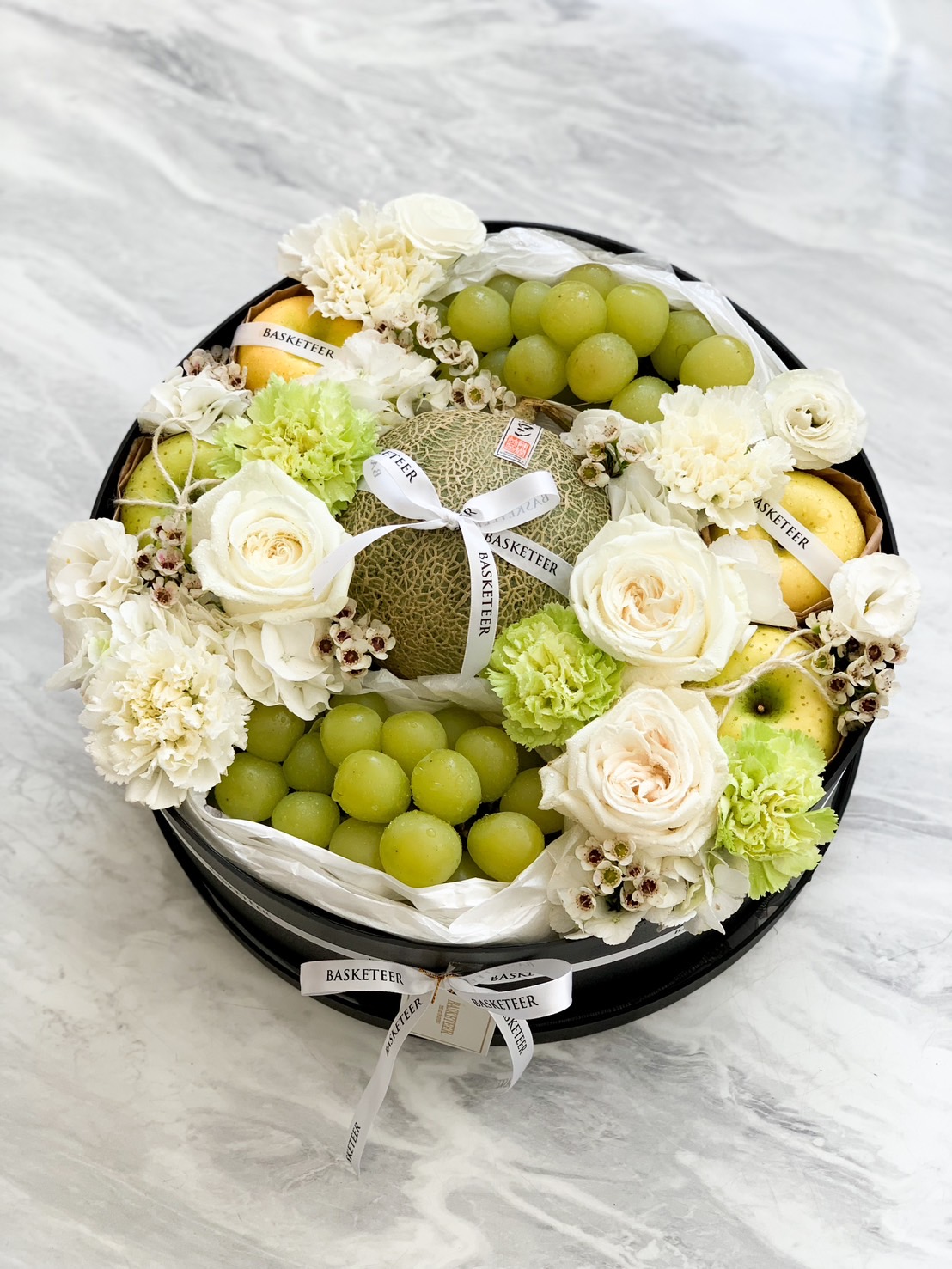 Premium fruit basket with Japanese melon, green grapes, golden apples, and white florals. A thoughtful and elegant gift for any celebration.