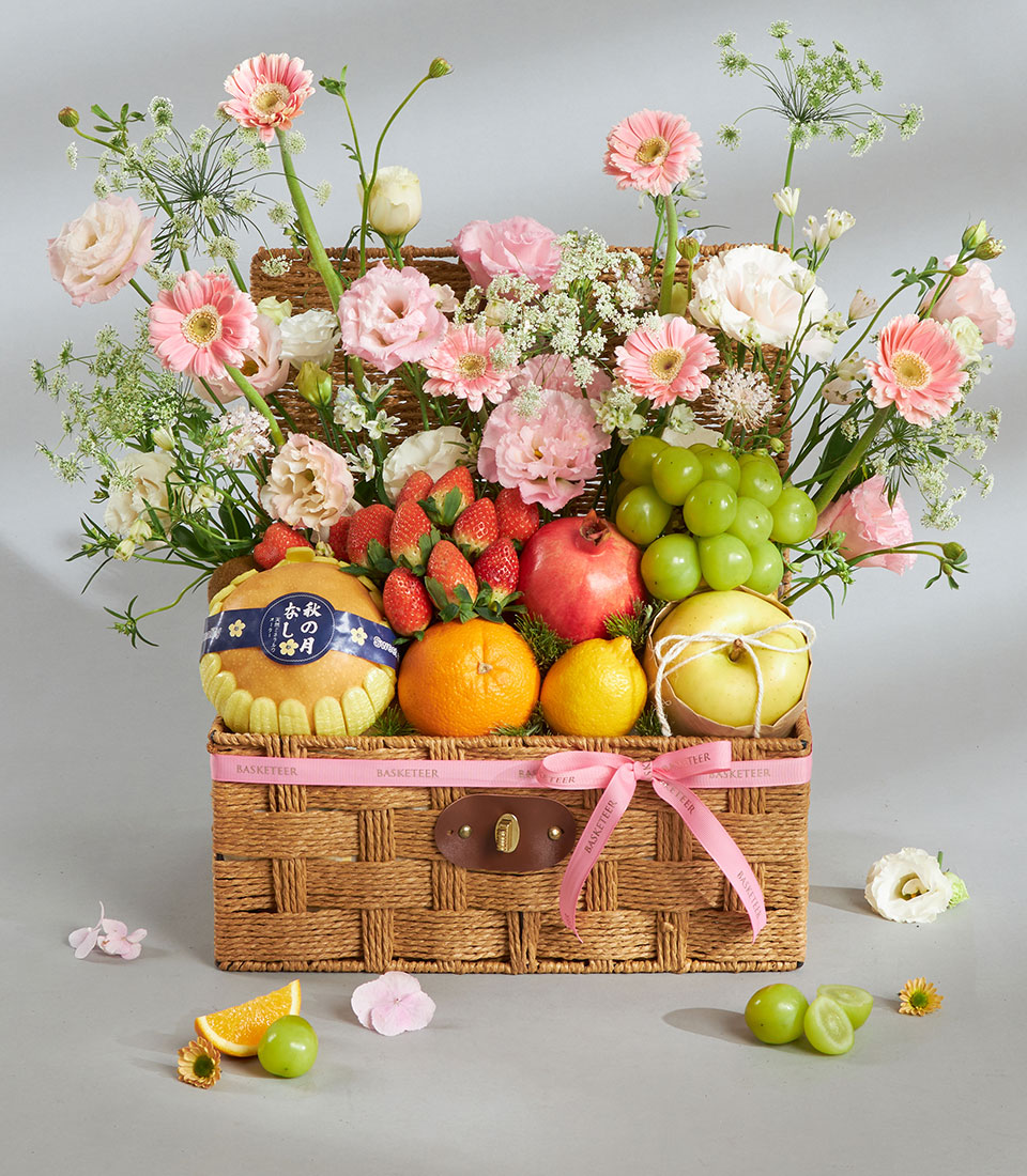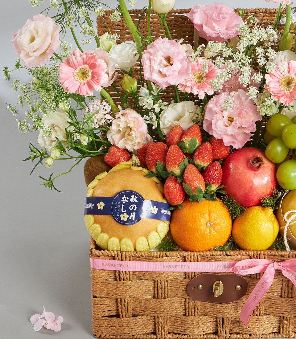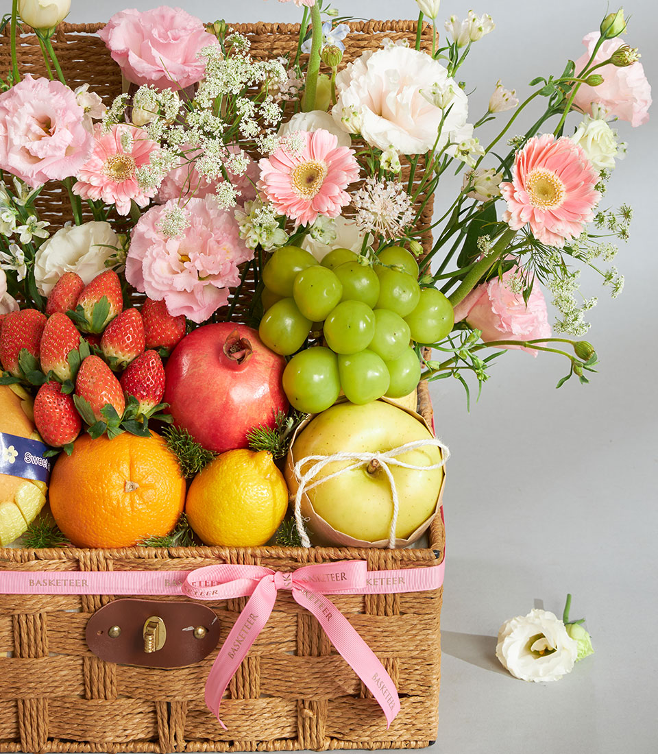 Premium Imported Fruit & Flower Basket – Romantic Pink Meadow Edition A romantic premium fruit and flower basket combining imported fruits from New Zealand, USA, Australia, South Africa, Korea, Japan and Chile with lush pink meadow-style florals. Arranged in a textured wooden basket with Basketeer’s signature pink ribbon, this charming piece captures sweetness, tenderness and refined elegance.