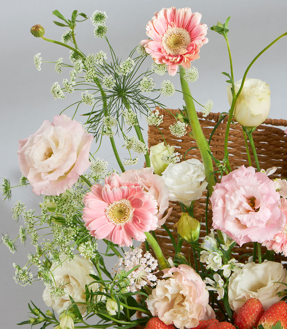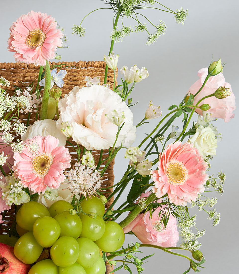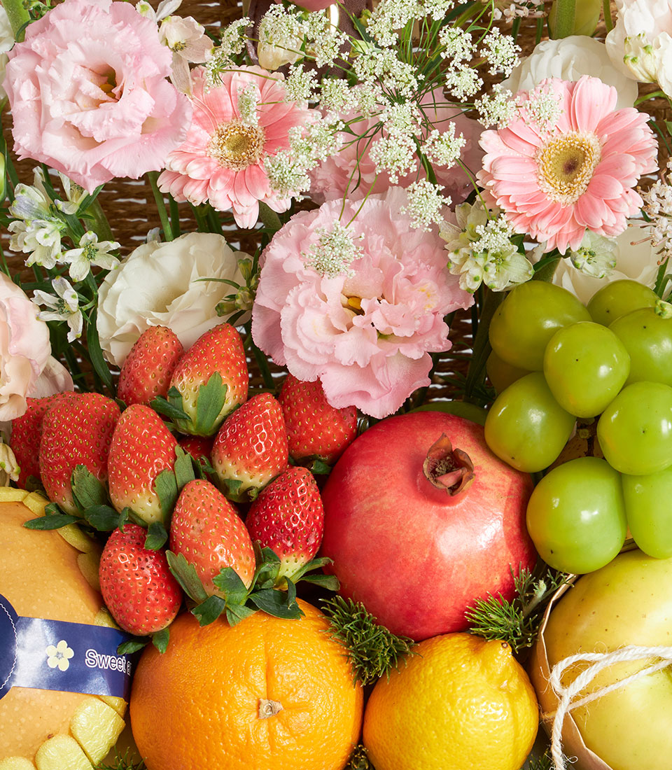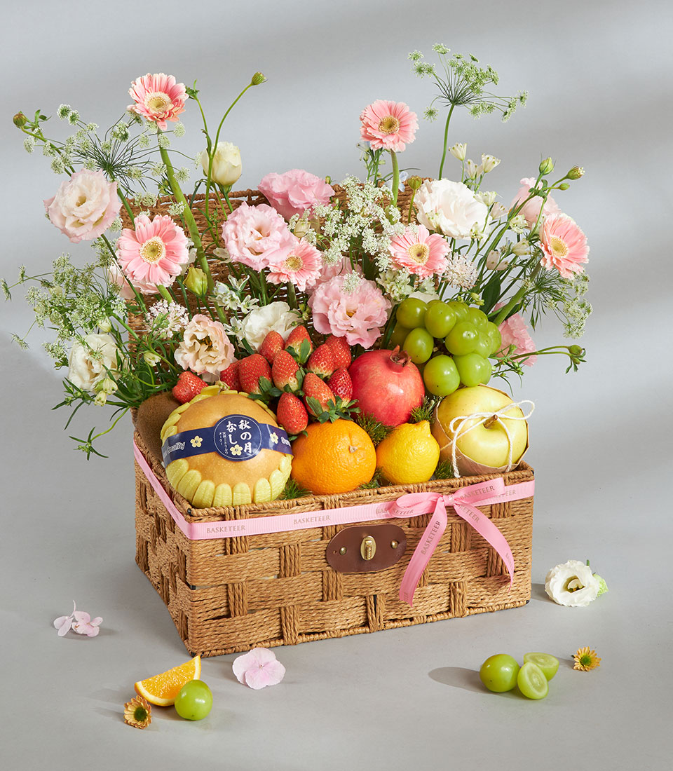 Premium Imported Fruit & Flower Basket – Romantic Pink Meadow Edition A romantic premium fruit and flower basket combining imported fruits from New Zealand, USA, Australia, South Africa, Korea, Japan and Chile with lush pink meadow-style florals. Arranged in a textured wooden basket with Basketeer’s signature pink ribbon, this charming piece captures sweetness, tenderness and refined elegance.