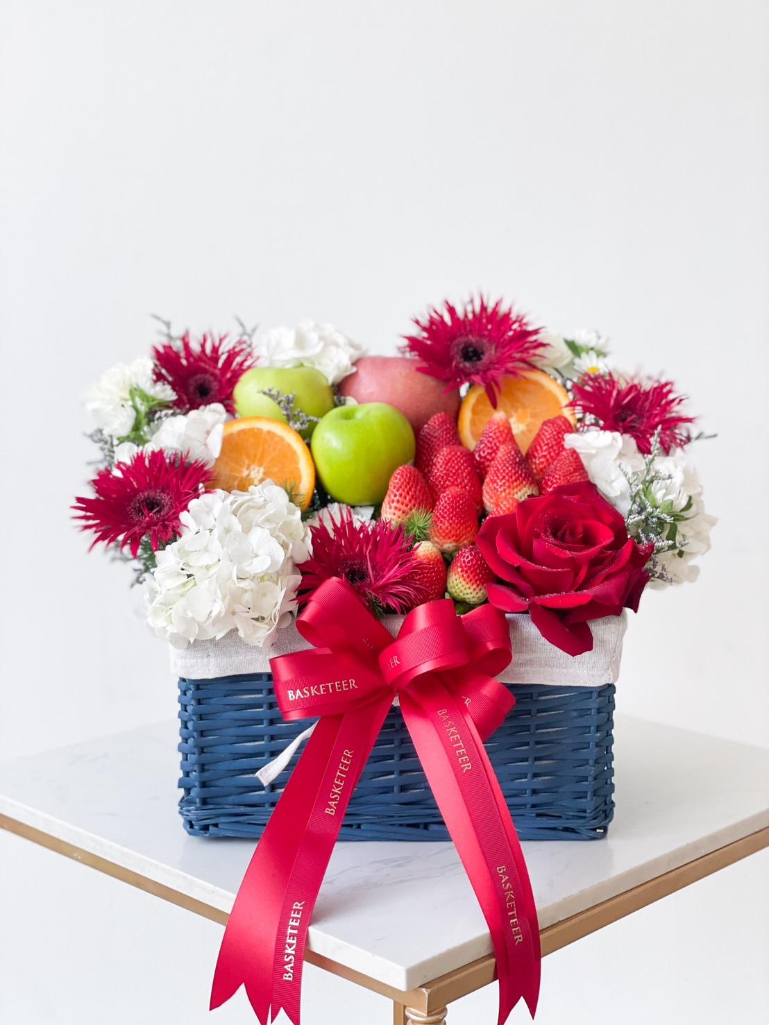 Ocean Breeze Fruit & Floral Basket Mother's day Complementing the fruit assortment are delicate blue hydrangeas, soft white carnations, and vibrant blue roses, all artfully arranged to add a touch of elegance and charm. Finished with a luxurious satin ribbon, this gift basket is perfect for expressing your gratitude, celebrating milestones, or simply bringing joy to someone's day.