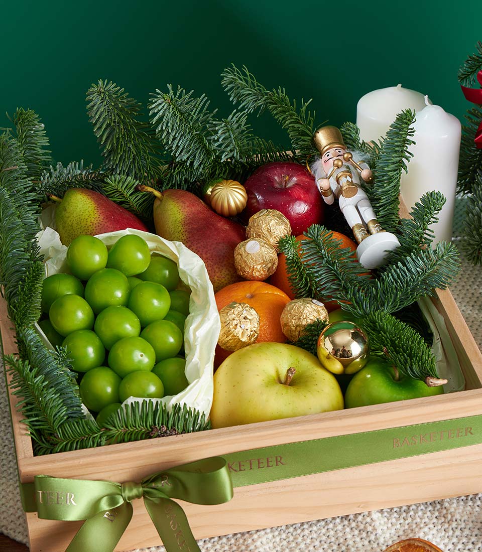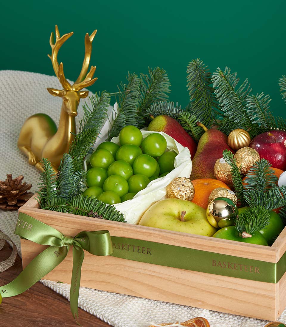Luxury Imported Fruit & Chocolate Tray – Refined Christmas Harmony Edition A refined Christmas fruit tray curated with a premium selection of imported fruits and fine chocolates, elegantly arranged in a natural wooden tray. Finished with classic Christmas décor and Basketeer’s signature festive presentation, this tasteful gift reflects balance, warmth, and understated holiday luxury.