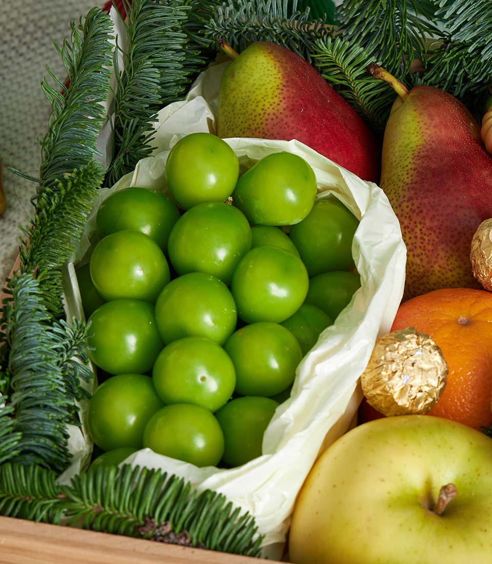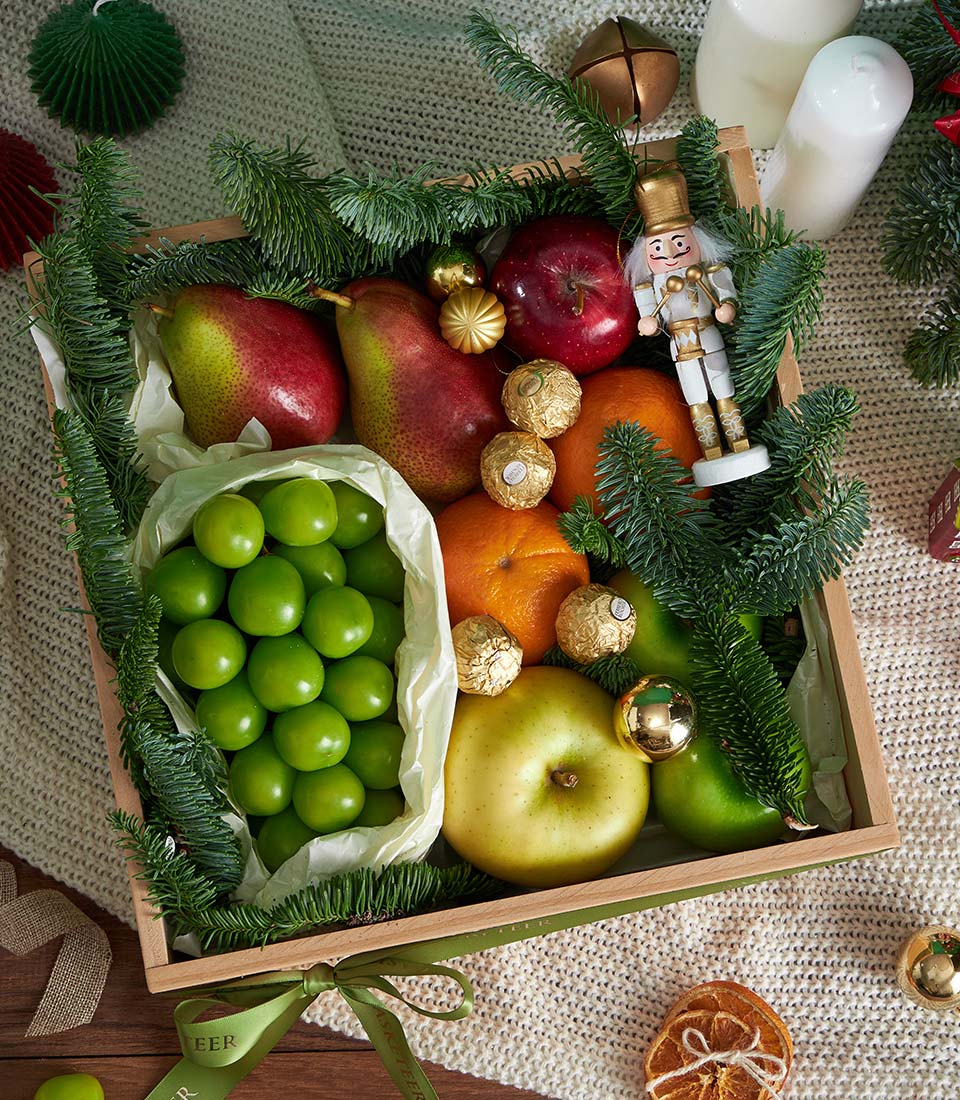 A refined festive fruit gift box featuring premium imported apples, pears, Shine Muscat grapes, Ferrero Rocher chocolates, and classic Christmas accents — elegantly arranged for seasonal gifting.