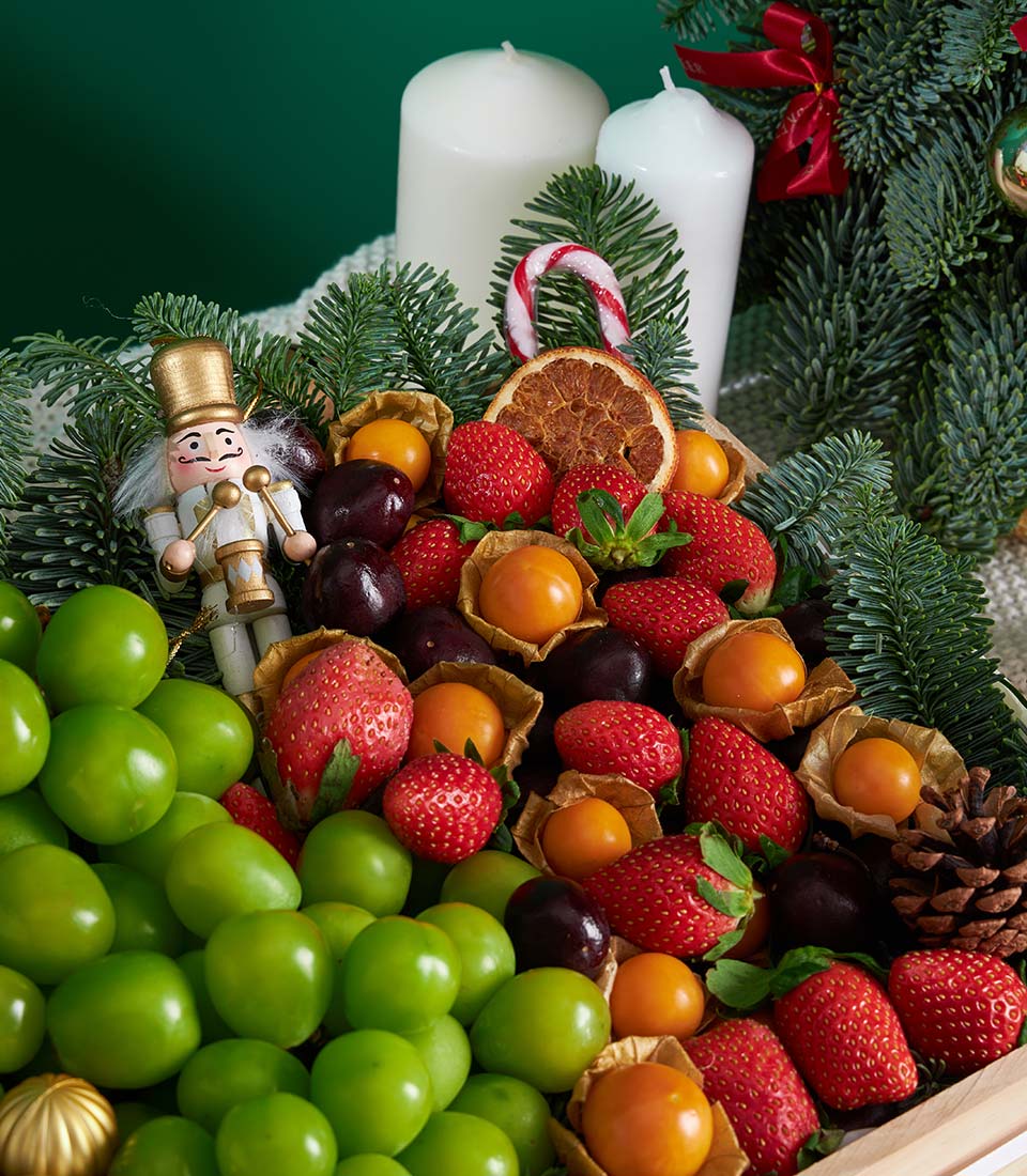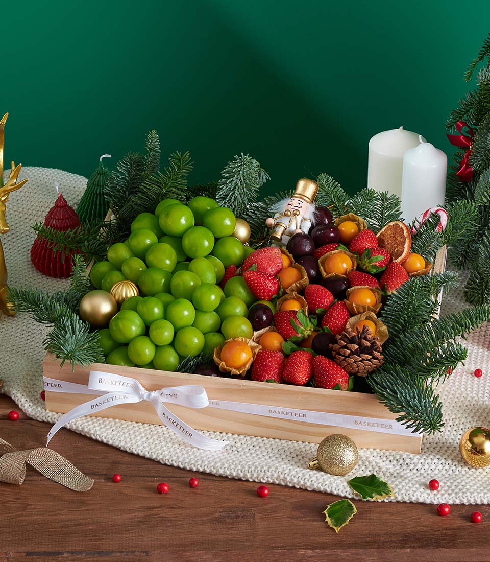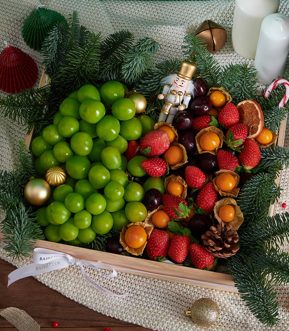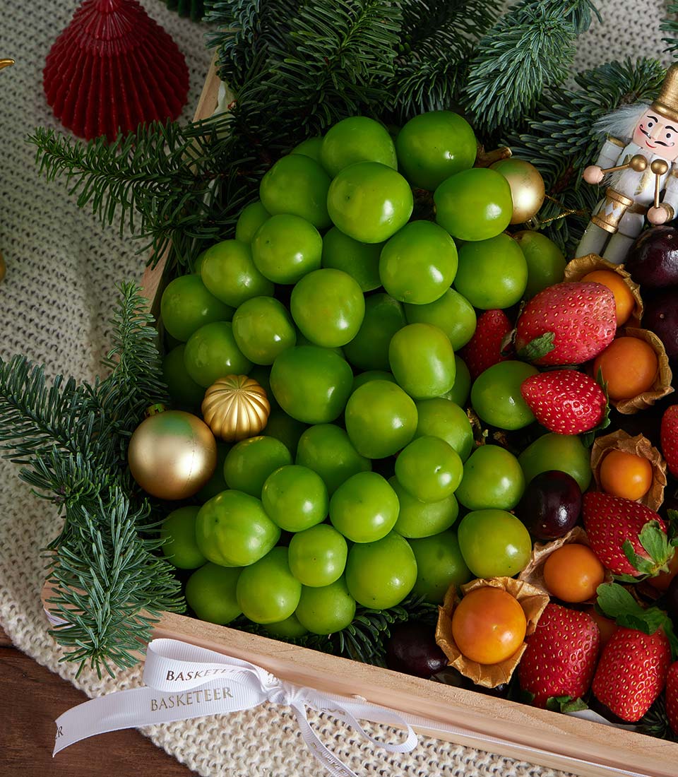 Premium Imported Fruit Christmas Tray – Shine Muscat & Berries Edition A refined Christmas fruit tray featuring premium imported fruits and berries, elegantly arranged in a natural wooden tray and accented with classic Christmas décor. A luxurious yet fresh gifting choice, designed to bring festive joy with Basketeer’s signature presentation.
