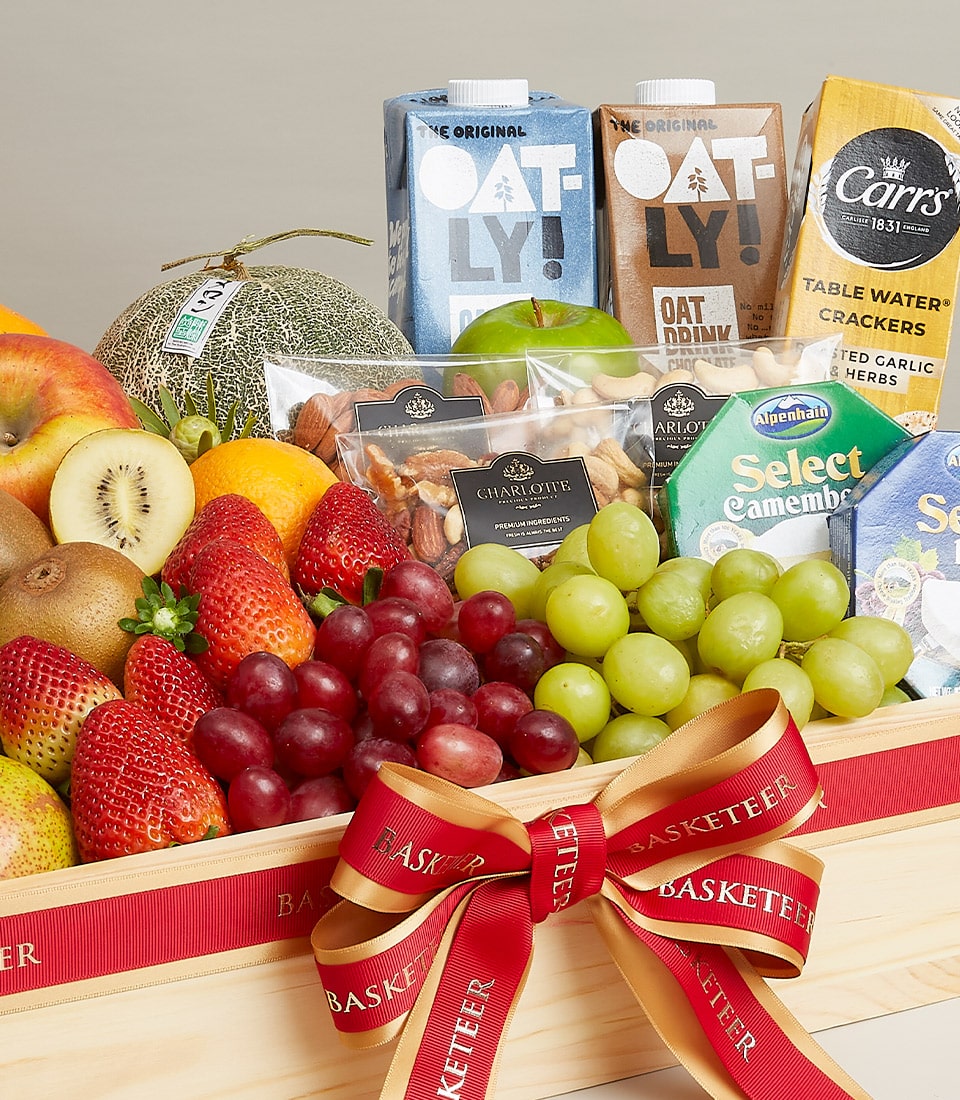 Elegant Fruit & Cheese Assortment Gift Experience pure indulgence with our opulent gift basket, brimming with the freshest fruits like crisp apples, juicy strawberries, and exotic kiwi. Paired with rich Camembert and Brie cheeses, plus premium Oatly oat drinks and Carr's table water crackers, this basket offers a delightful taste of luxury and sophistication. Perfect for any special occasion.