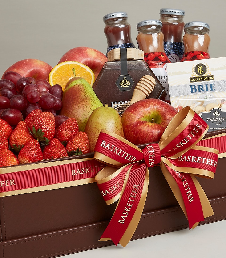 Send a deluxe fruit and gourmet box with wellness drink, honey, and fine cheeses — a luxurious and thoughtful gift for any occasion.