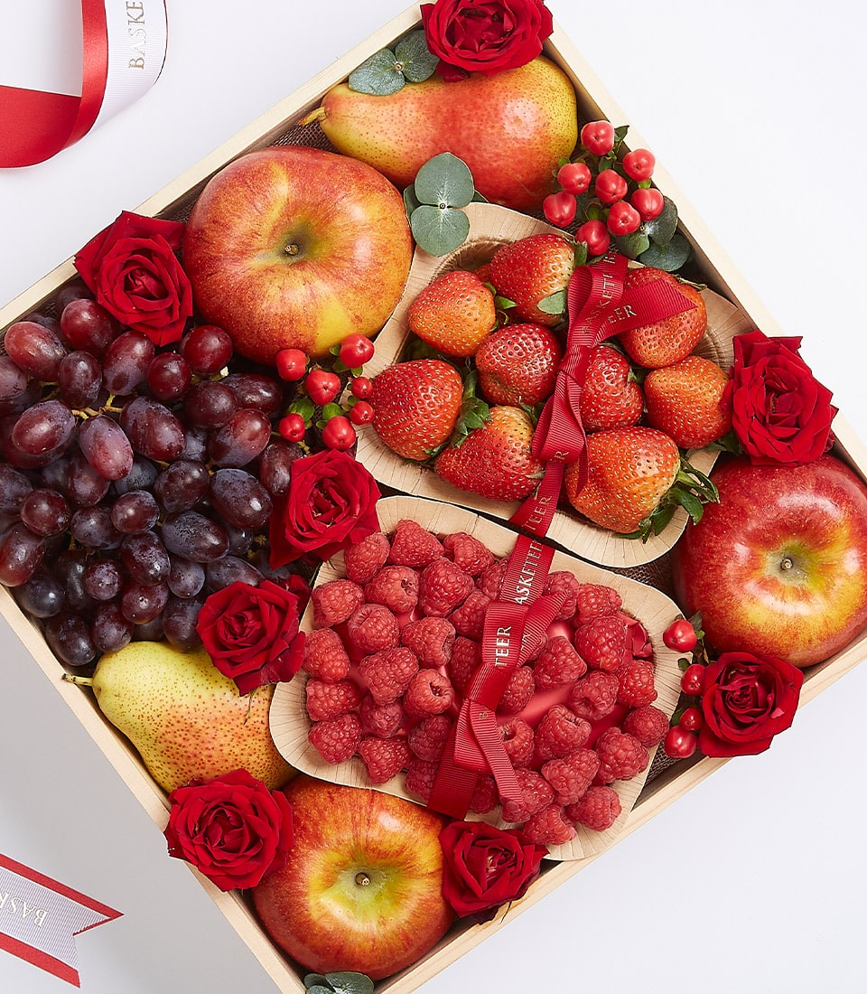 Premium Fruit Box Gift Surprise your loved one with a luxurious red fruit tray filled with sweet strawberries, raspberries, crisp red apples, juicy grapes, and premium pears. Elegantly styled with fresh red roses and berries, this gift is perfect for anniversaries, Valentine's Day, or simply saying "I love you." Beautifully presented in a wooden tray with Basketeer's signature ribbon – it’s a heartfelt gesture that speaks volumes.