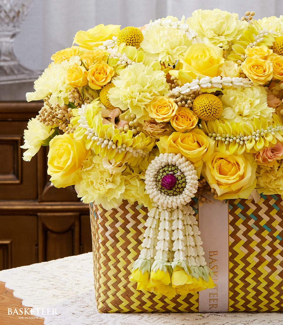 Yellow Thai Flowers Basket This Golden Bloom Floral Tribute Basket is a breathtaking arrangement of vibrant yellow roses, delicate carnations, and handcrafted jasmine garlands. Presented in an elegant woven basket, this floral masterpiece symbolizes joy, prosperity, and heartfelt blessings, making it ideal for celebrations, religious ceremonies, and special tributes.