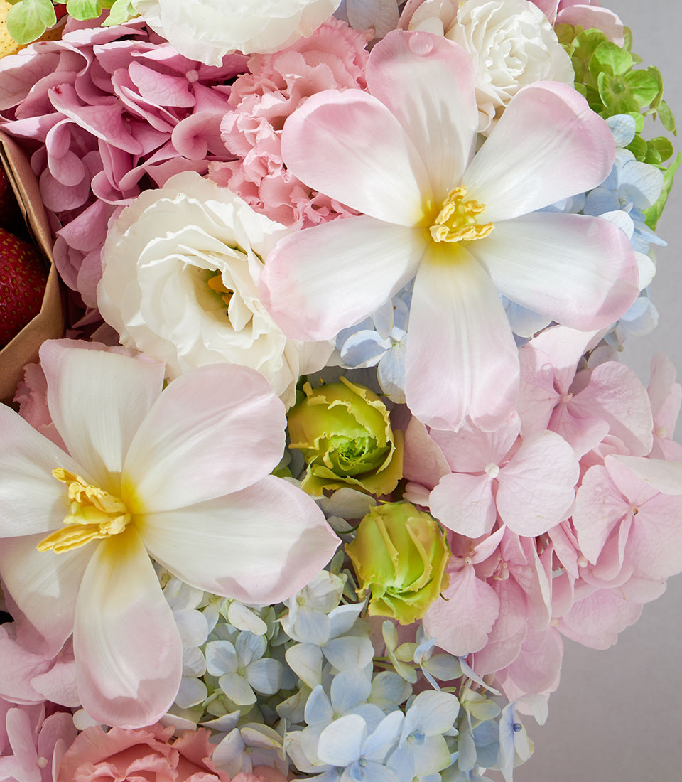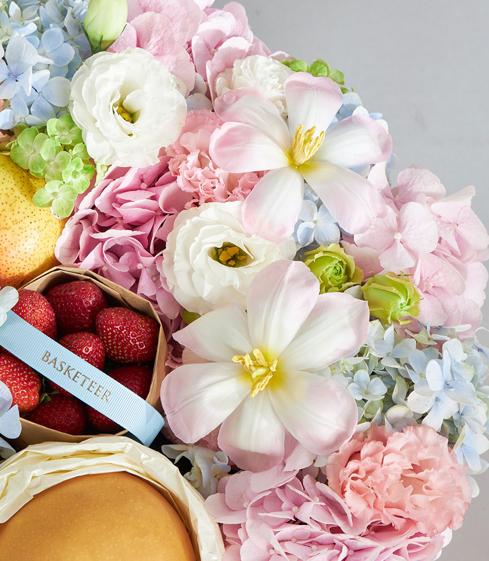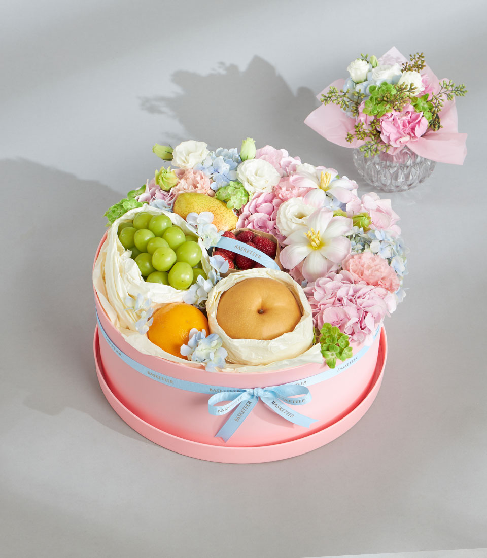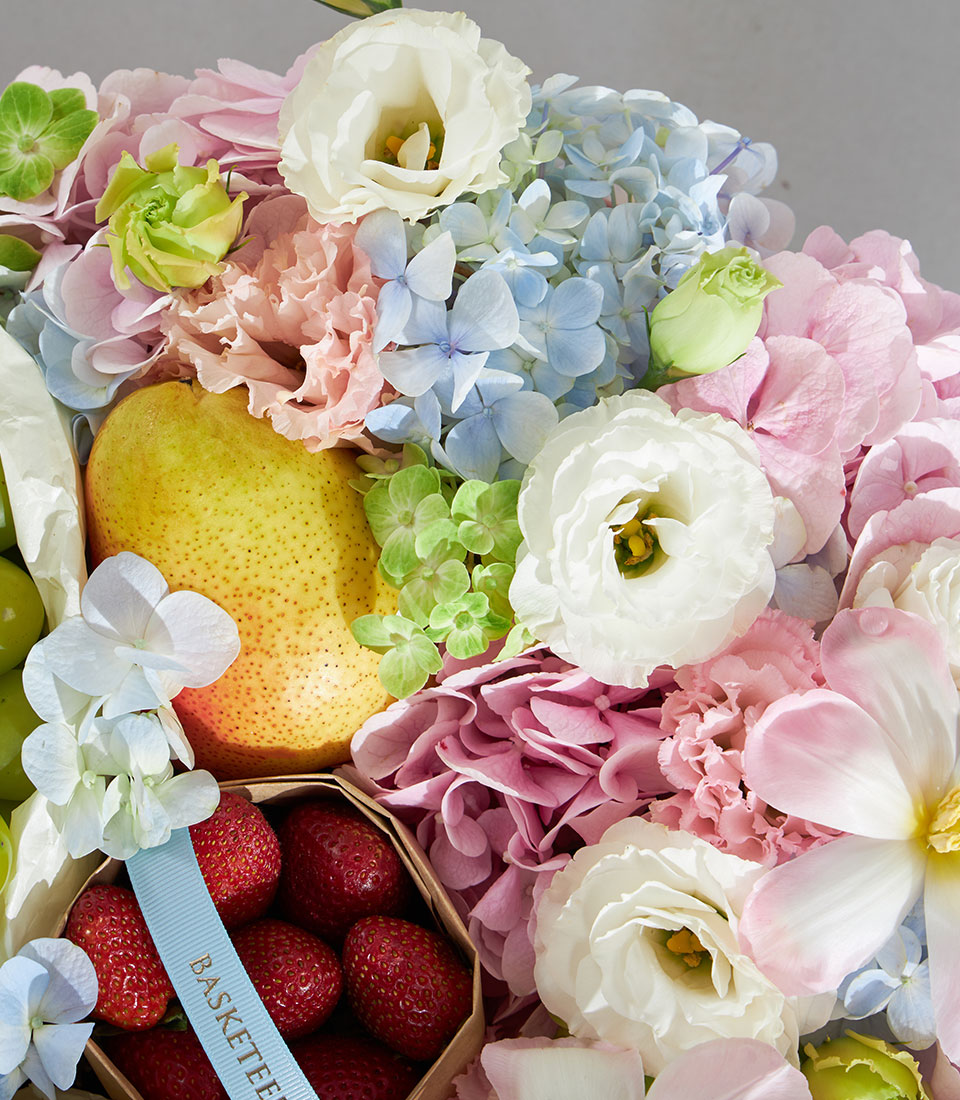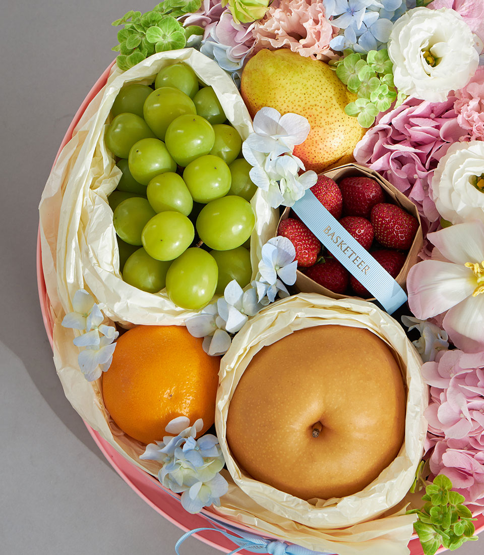 A soft and elegant round box arrangement featuring premium imported fruits — including Shine Muscat grapes, fresh strawberries, Korean pear, mixed pears, and Sunkist orange. Paired with a delicate pastel floral composition of hydrangeas, lisianthus, carnations, and seasonal blooms, this luxurious gift expresses heartfelt care, warmth, and refined beauty. Perfect for birthdays, appreciation, recovery wishes, and meaningful gifting with same-day delivery in Bangkok.