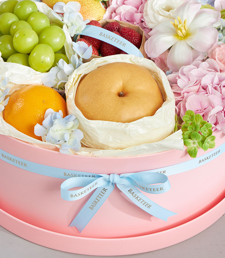 Pastel Round Imported Fruit & Flower Hat Box – Gentle Blessings Edition A delicate round hat box filled with premium imported pears, Shine Muscat grapes, strawberries and Sunkist Navel orange, arranged with soft pastel flowers in a modern compact style. This graceful design is perfect for sending warm blessings in a refined yet approachable way.