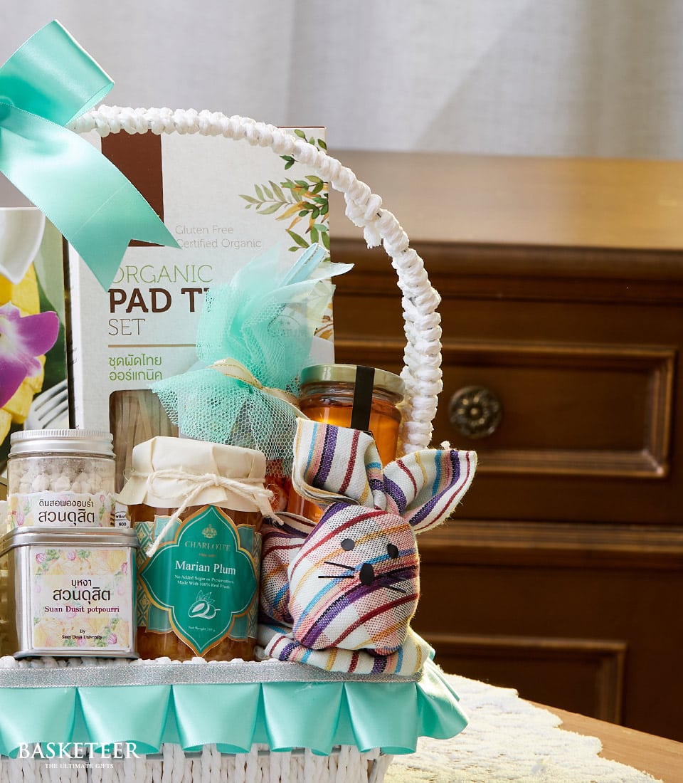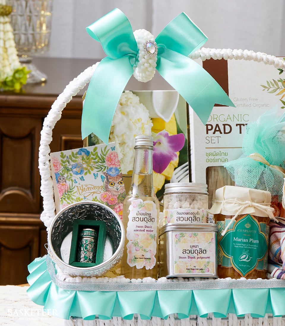 Thai Songkran Splendor Basket This Songkran Wellness & Blessing Gift Basket is a thoughtful Thai New Year present, filled with organic Thai delicacies, scented water, and herbal salts. Elegantly arranged with a decorative bow, this gift symbolizes purity, wellness, and festive blessings, making it perfect for honoring loved ones, elders, and business associates.