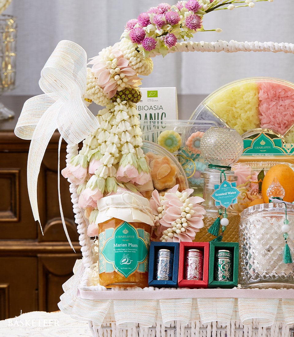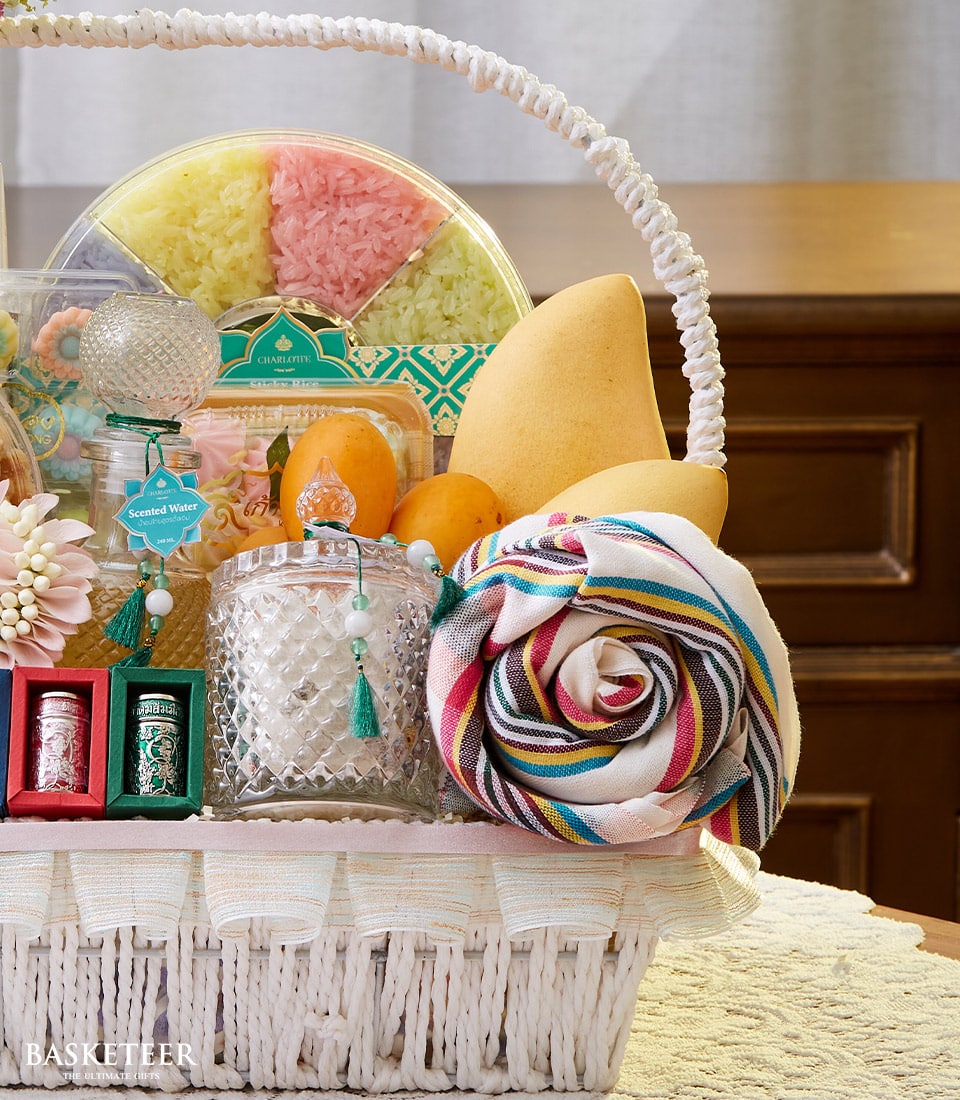 Songkran Joyful Traditions Basket This Songkran Deluxe Celebration Gift Basket is the perfect way to honor Thai New Year, featuring premium mangoes, traditional Thai sweets, scented water, and a stunning floral arrangement. Elegantly presented in a lace-trimmed wicker basket, it symbolizes abundance, gratitude, and blessings, making it an ideal gift for loved ones and esteemed recipients.