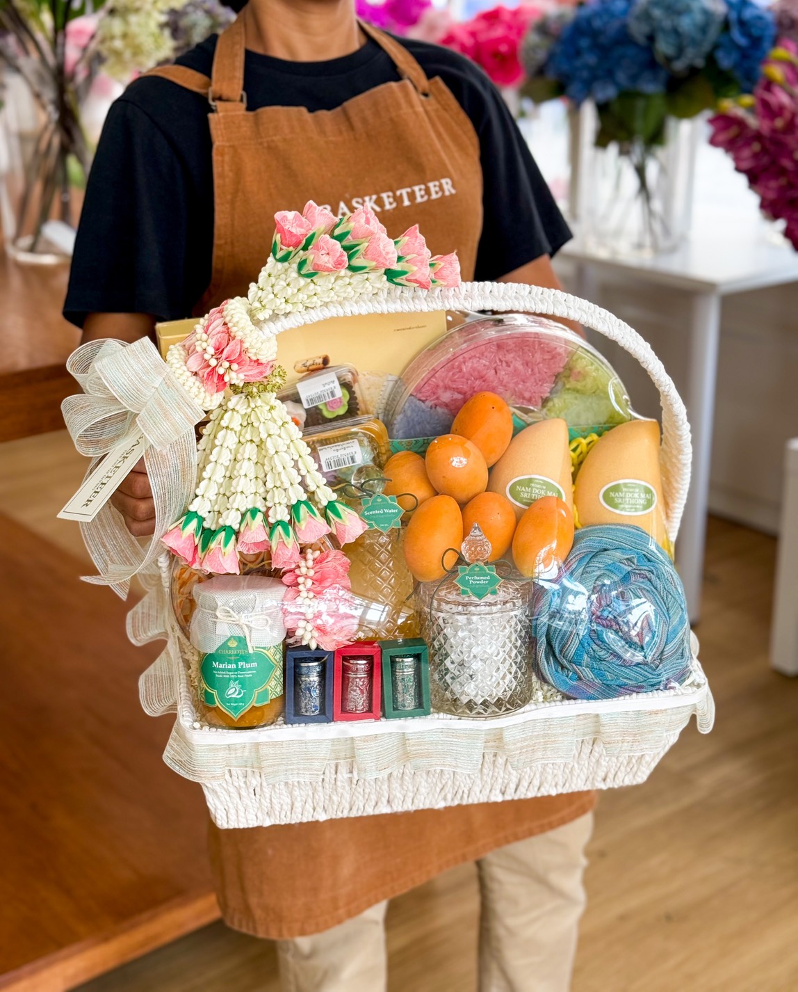 Celebrate Songkran with a premium gift basket featuring mangoes, Thai sweets, scented water, and floral garlands, symbolizing prosperity & joy.