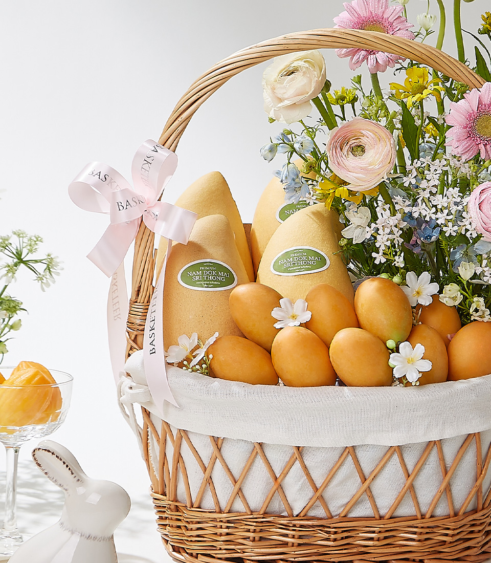 Delight in the vibrant Thai Fruit and Flower Basket, featuring sweet Mayongchids and Nam Dok Mai mangoes. Perfect for any occasion!