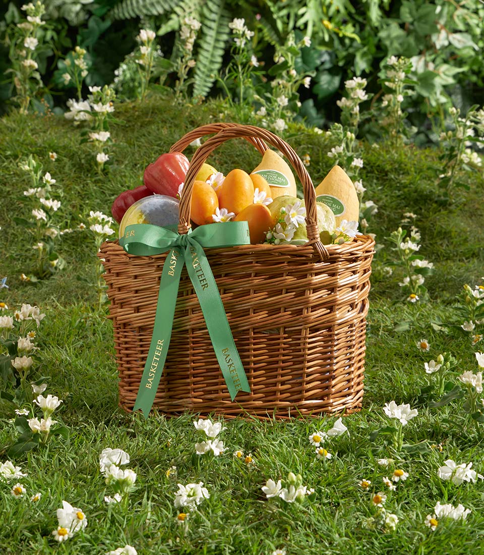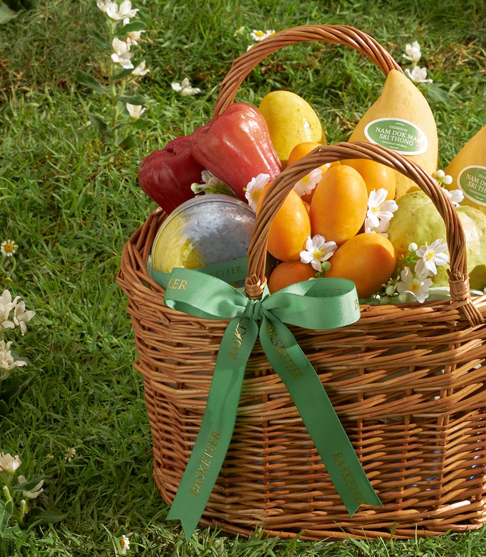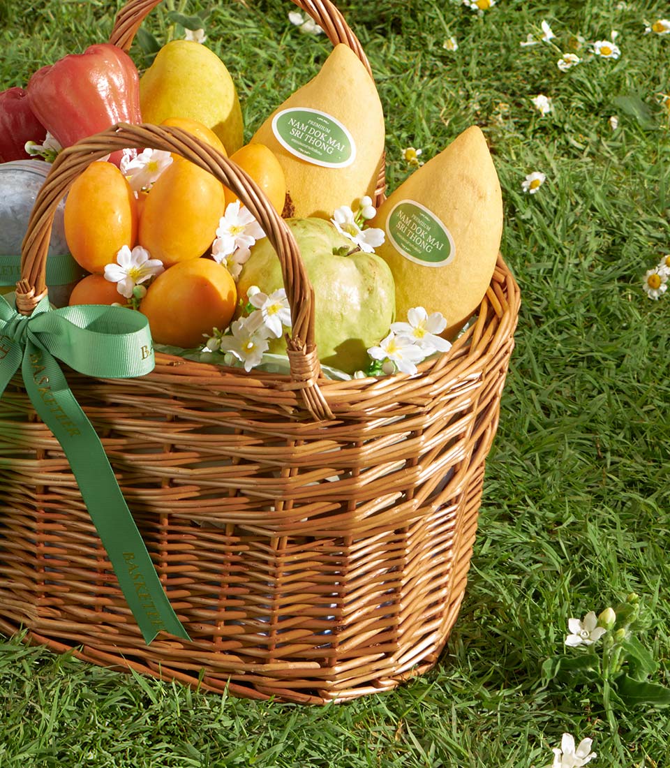 A thoughtfully arranged fruit basket featuring a selection of Thai mango varieties, including Nam Dok Mai See Thong and Khai Tuek mango from Chachoengsao, paired with premium mayongchid, fresh guava, rose apple, and rainbow herb sticky rice. Warm, inviting, and naturally sweet, this basket offers a well-balanced combination of tropical flavors in a refined presentation.