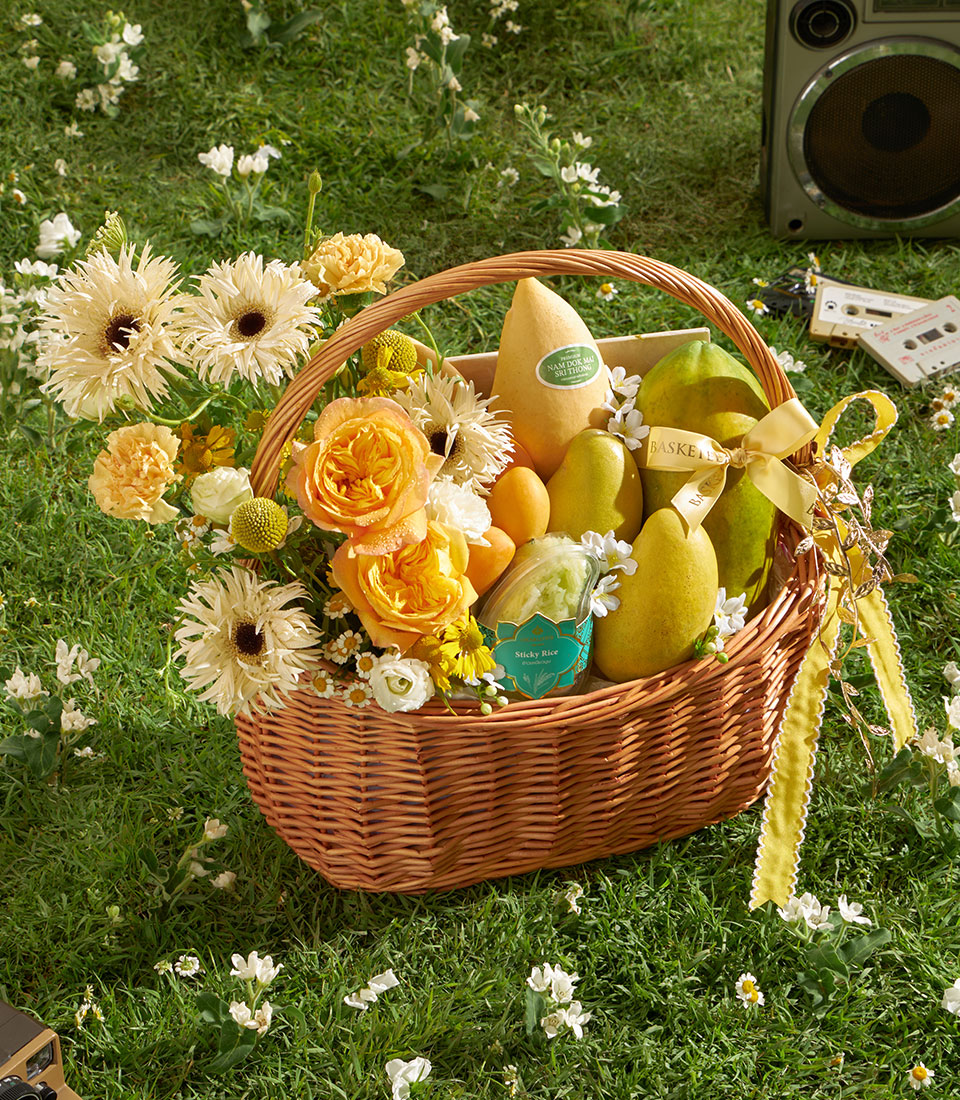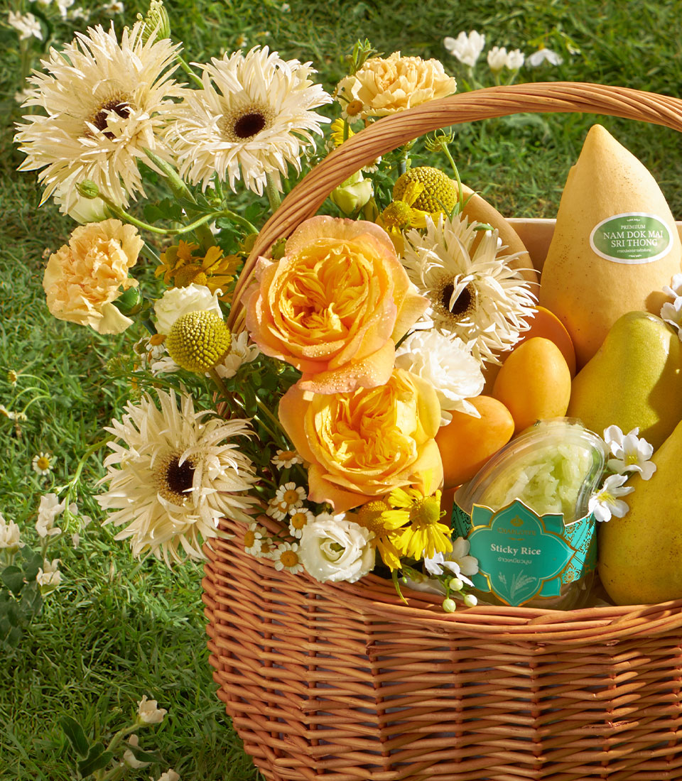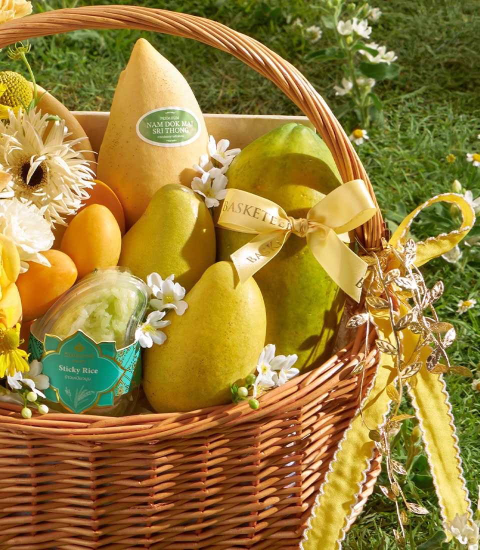 A refined selection of premium Thai seasonal fruits featuring Khai Tuek Padriew mango, Nam Dok Mai See Thong mango, Holland papaya, and sweet mayongchid, paired with rainbow herb sticky rice. Elegantly arranged with soft yellow floral accents, this basket offers a warm and sophisticated summer gifting experience.