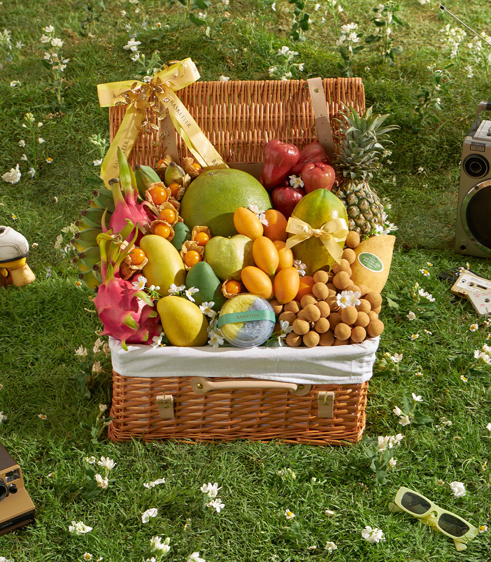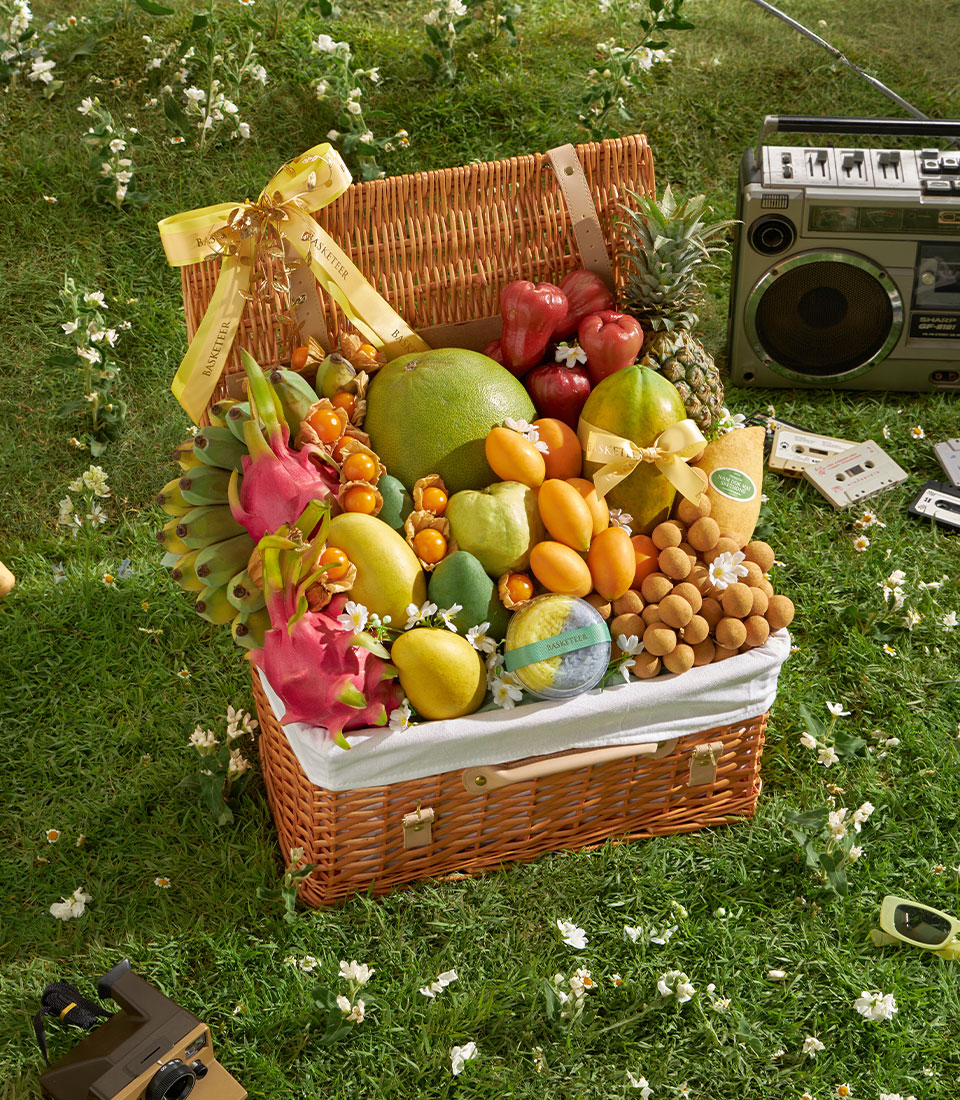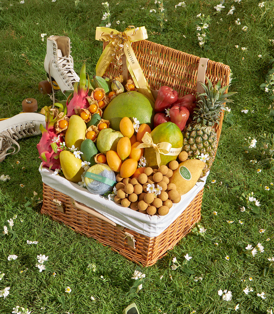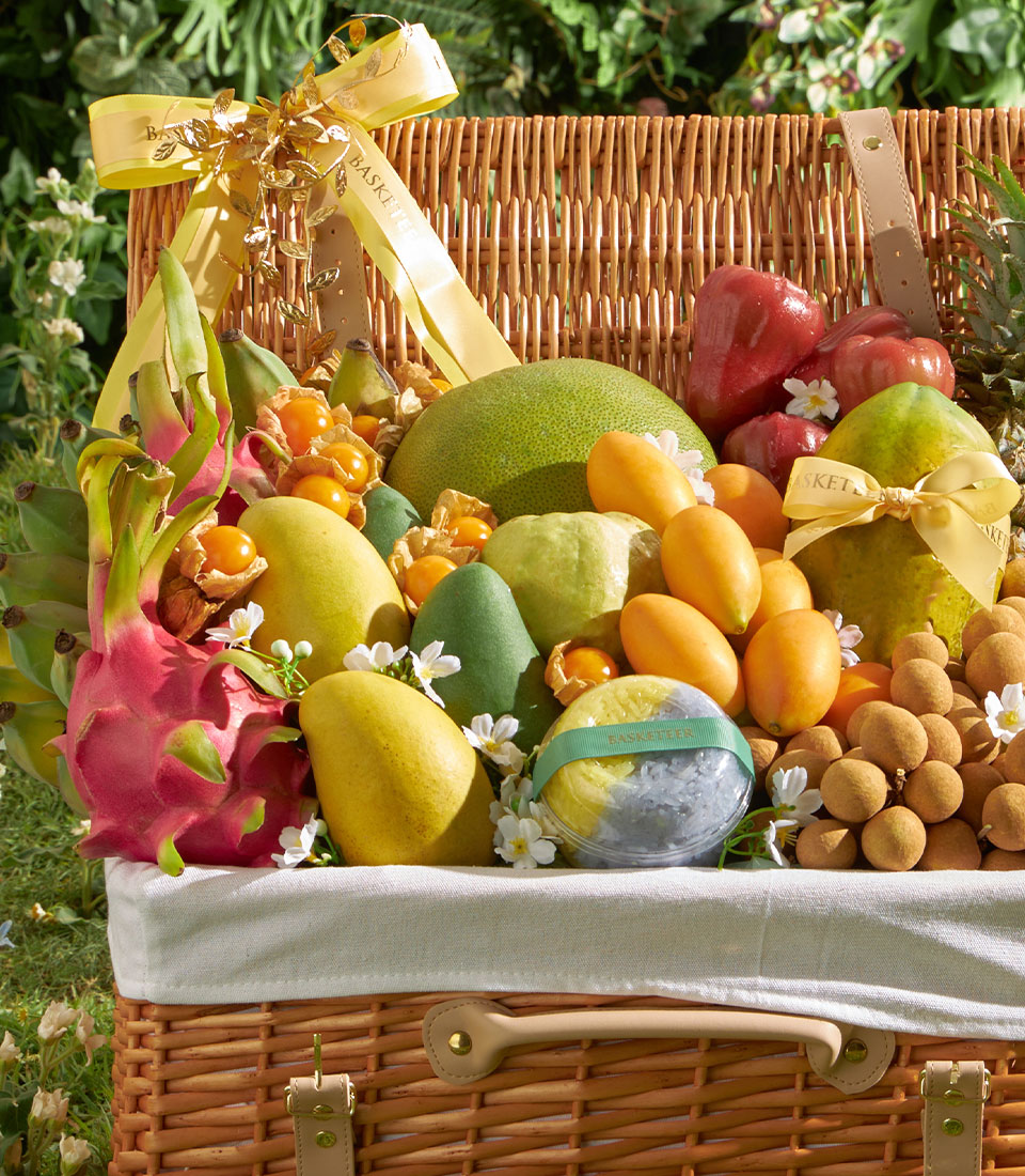 Premium Thai Summer Fruit Basket – Grand Tropical Selection with Mango & Mayongchid An abundant and richly curated Thai summer fruit basket showcasing a generous selection of premium mangoes, sweet mayongchids and a vibrant variety of tropical fruits. Complemented by traditional rainbow herb sticky rice, this grand arrangement delivers a refreshing, nourishing and luxurious gifting experience—perfect for making a lasting impression.
