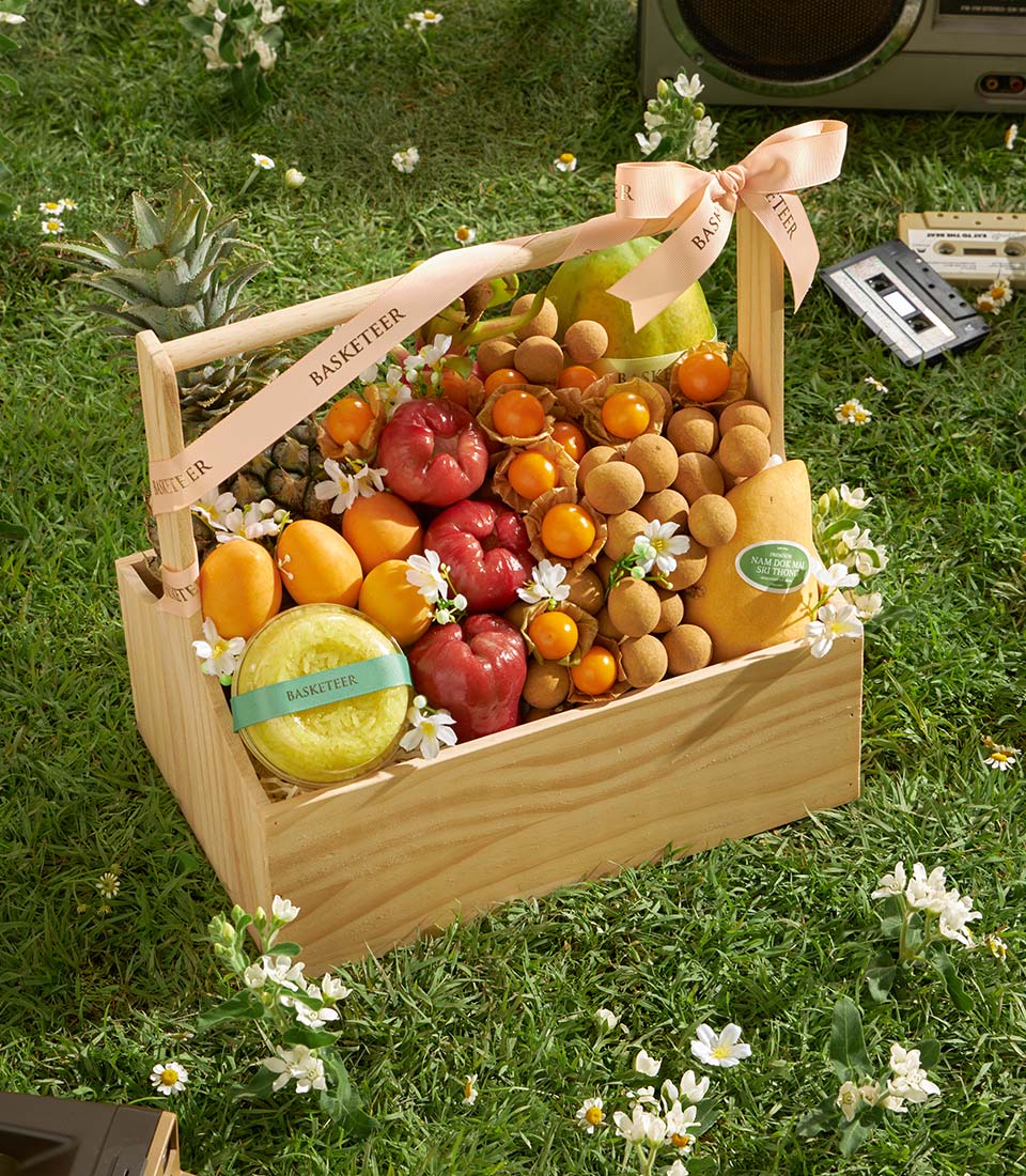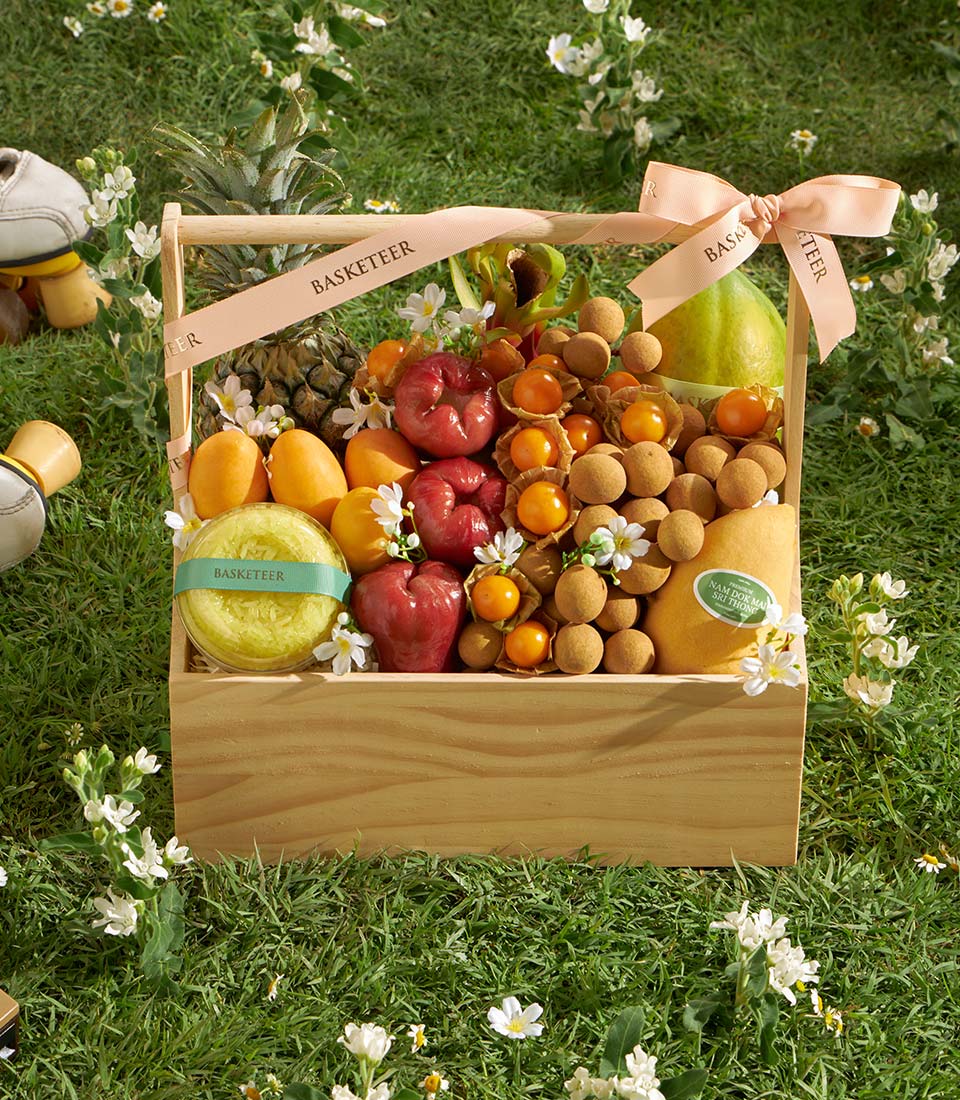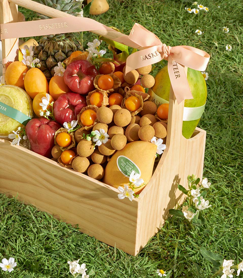 An abundant premium fruit basket featuring a rich selection of Thai tropical fruits, including Nam Dok Mai See Thong mango, premium mayongchid, longans, papaya, pineapple, rose apple, dragon fruit, and cape gooseberries, complemented by rainbow herb sticky rice. Generous, vibrant, and beautifully arranged - a grand gift for meaningful occasions with same-day delivery in Bangkok.
