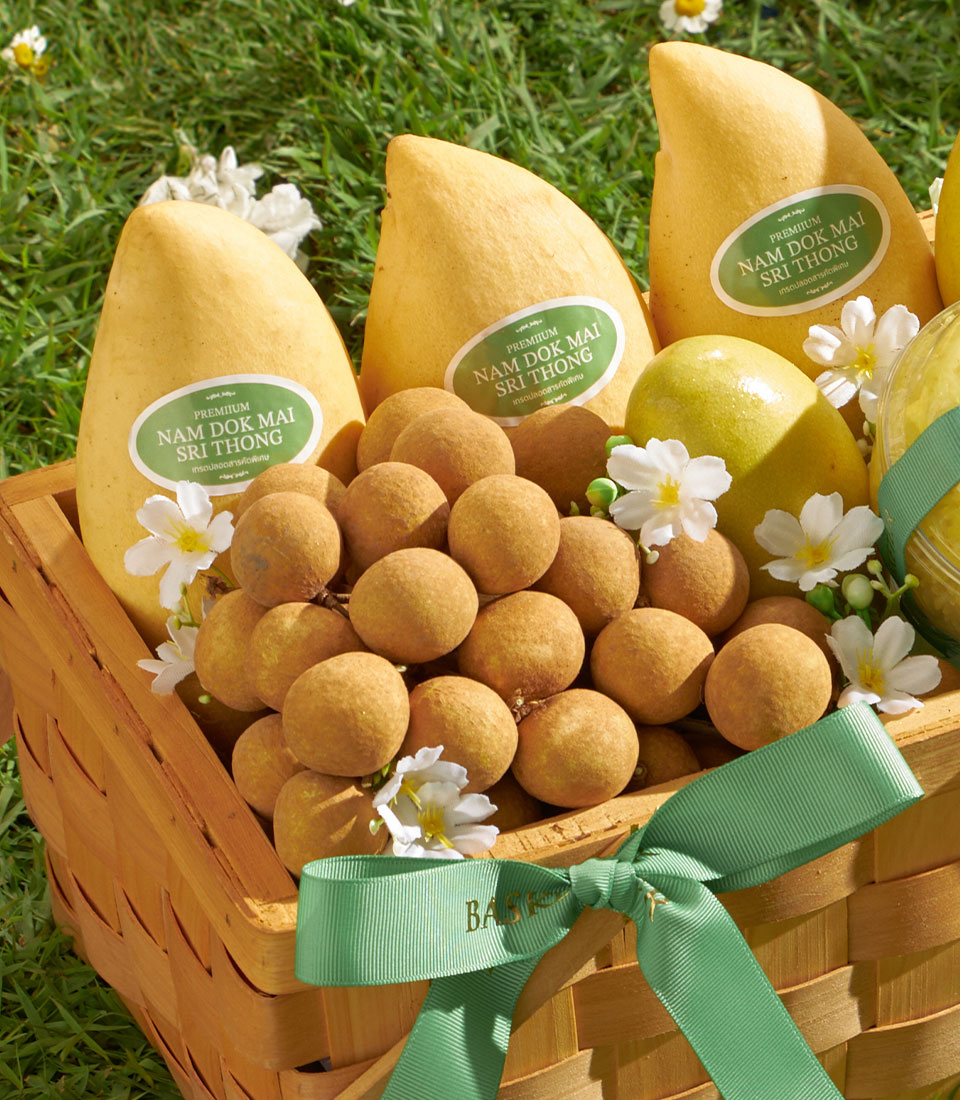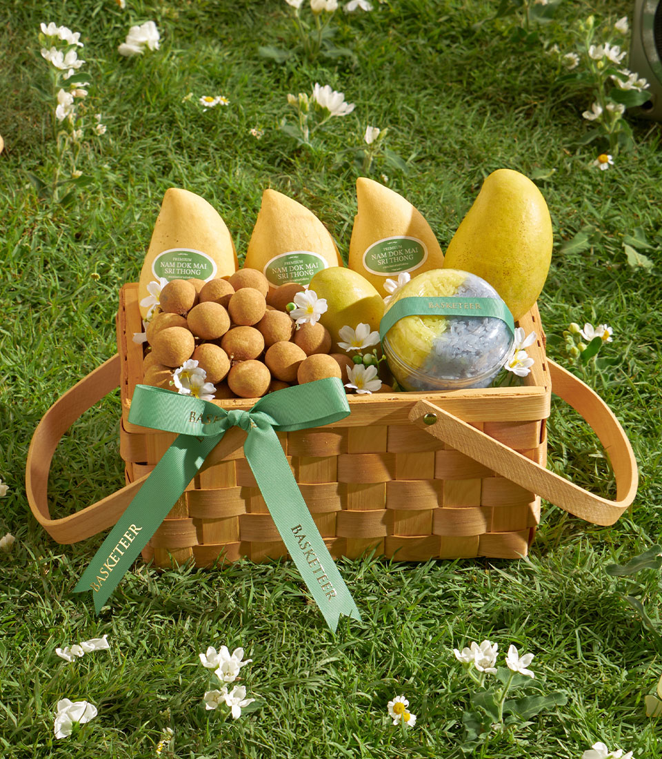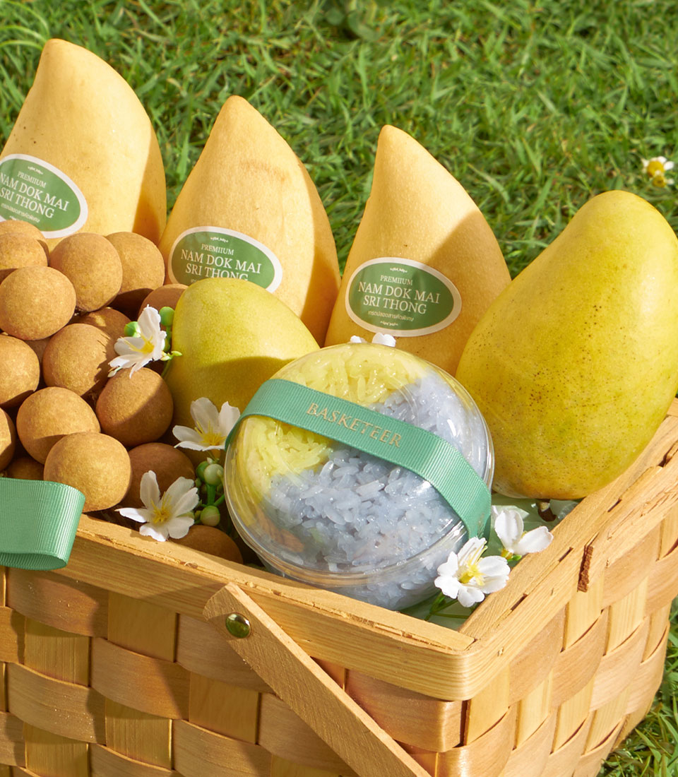 Premium Thai Summer Fruit Basket – Mango & Sticky Rice Classic Selection A rich and wholesome Thai summer fruit basket featuring a classic combination of golden mangoes and traditional sticky rice, complemented by fresh longans for a naturally sweet balance. Thoughtfully arranged in a refined wicker basket, this timeless pairing offers a comforting, nourishing and satisfying experience—perfect for meaningful and elegant seasonal gifting.
