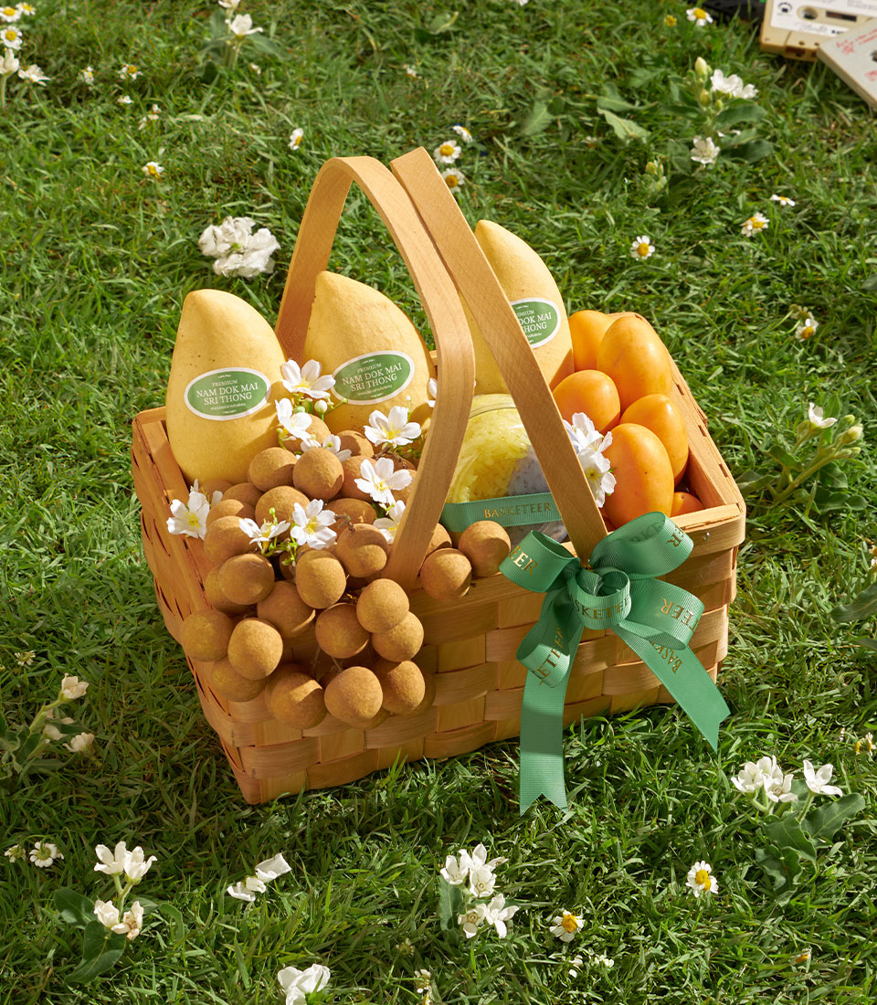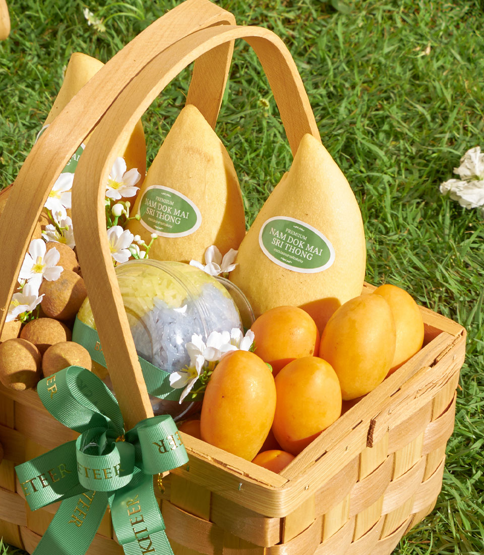 Premium Thai Summer Fruit Basket – Mango, Mayongchid & Longan Harmony A rich and wholesome Thai summer fruit basket featuring a naturally sweet harmony of golden mangoes, premium mayongchids and fresh longans. Paired with traditional rainbow herb sticky rice, this thoughtfully arranged basket delivers a comforting, nourishing and satisfying experience—perfect for sending warm, heartfelt and seasonal gifts.
