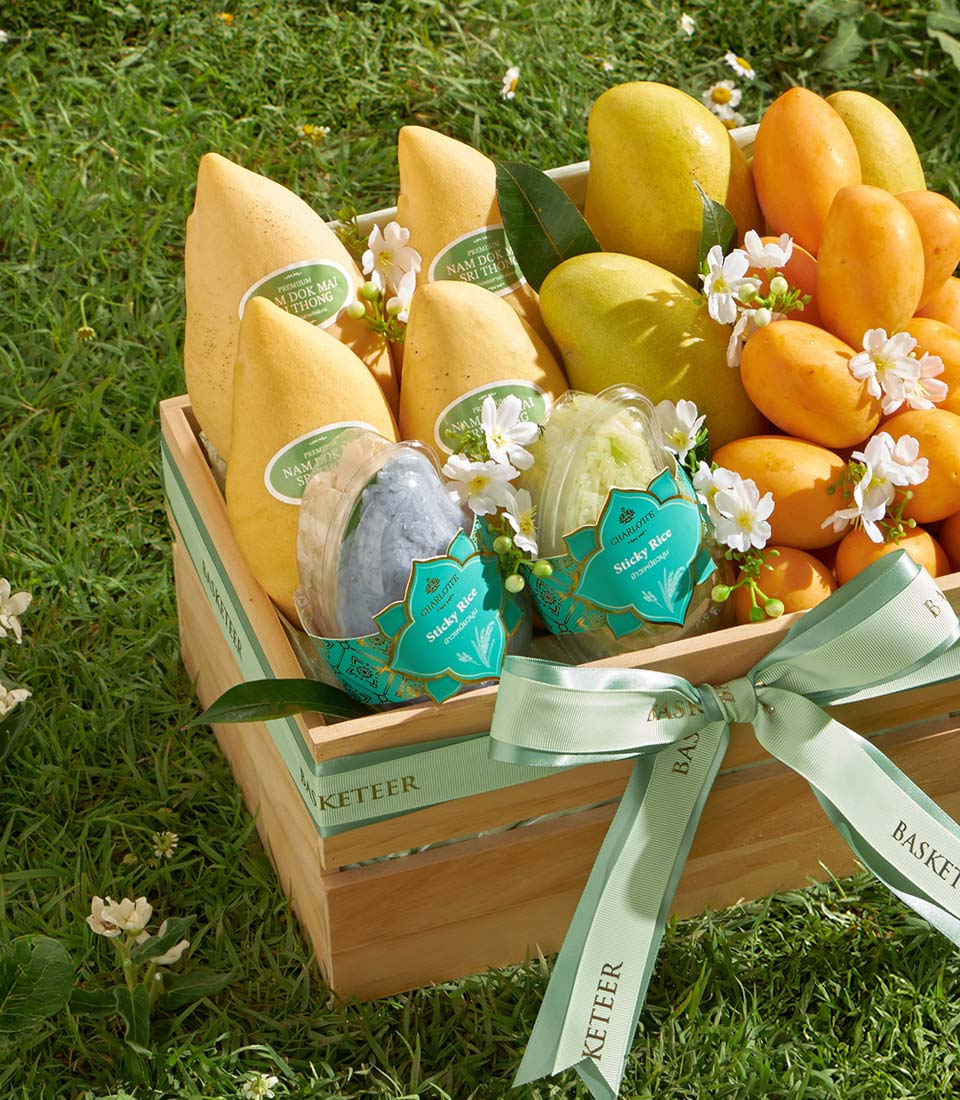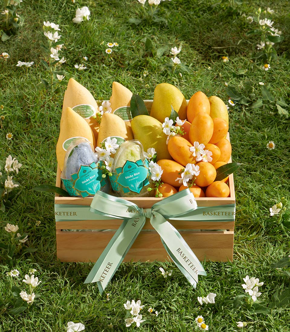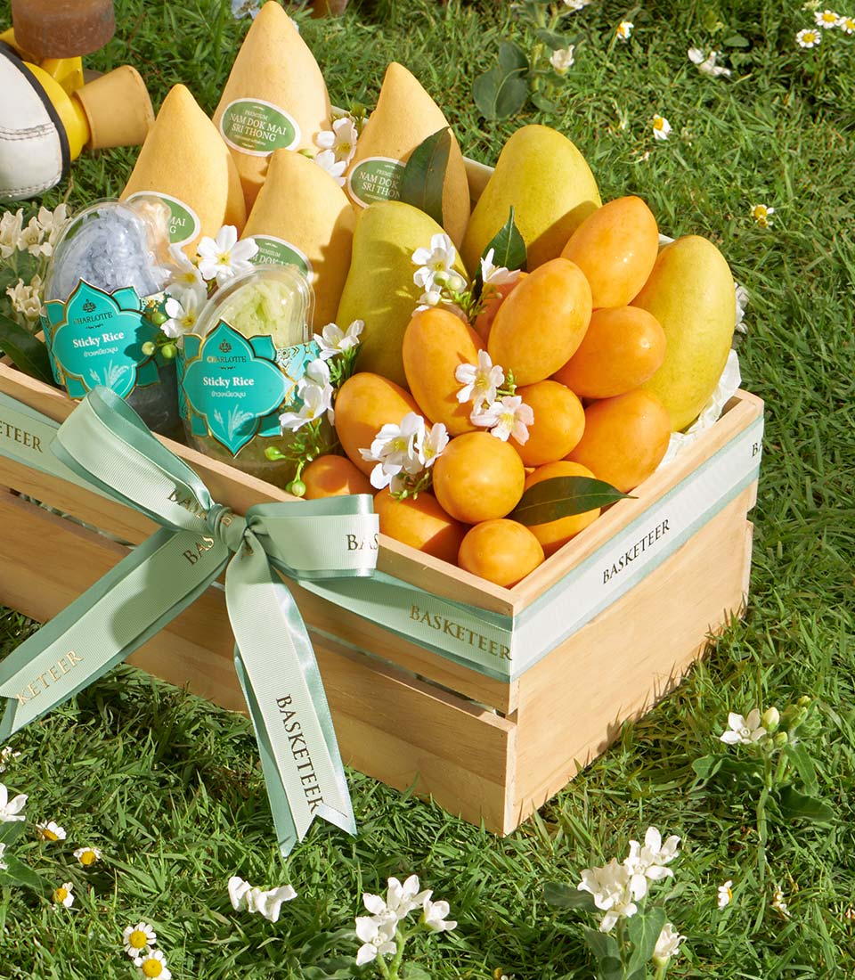 Premium Thai Summer Fruit Basket – Mango Selection, Mayongchid & Sticky Rice in Wooden Basket A well-balanced Thai summer fruit basket featuring a selection of Bang Khla mangoes, sweet mayongchids and rainbow herb sticky rice. Presented in a natural wooden basket with refined decoration, this thoughtfully curated set offers a harmonious blend of flavours and textures—perfect for elegant seasonal gifting.
