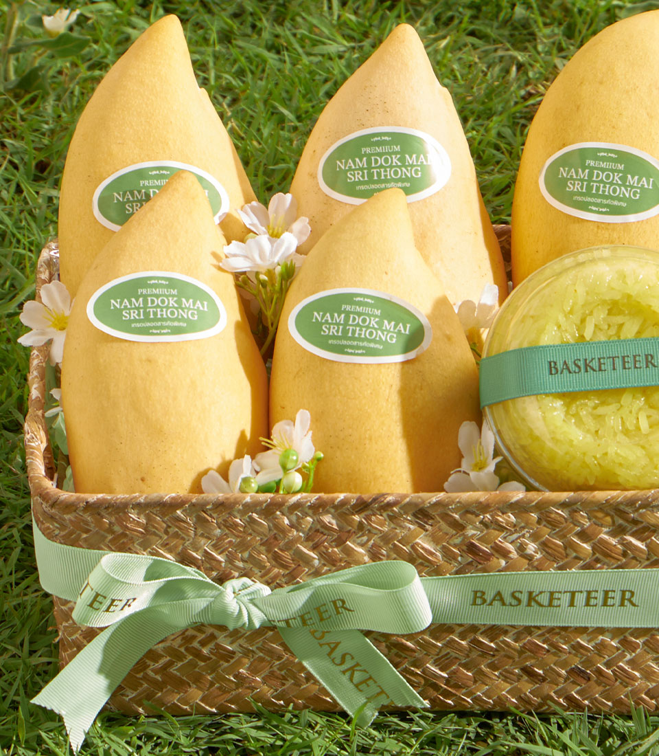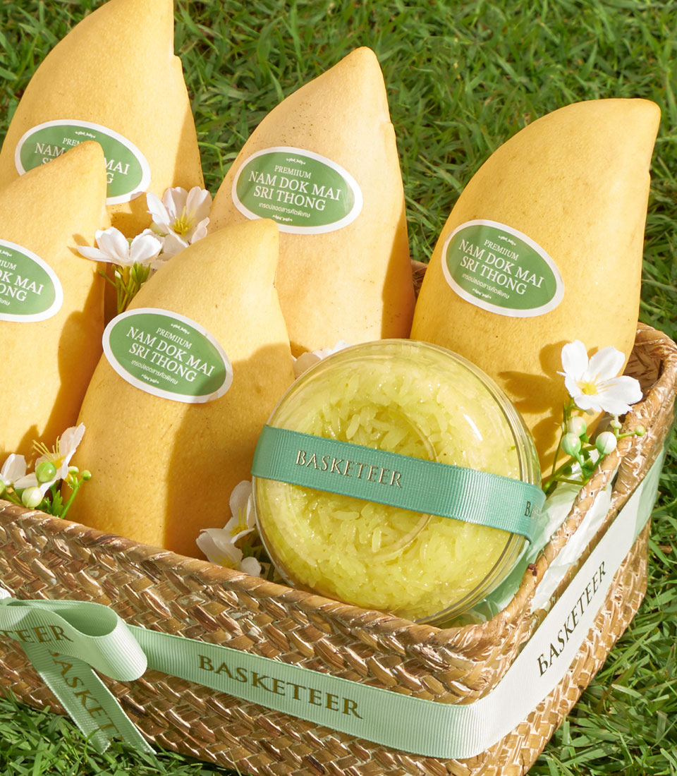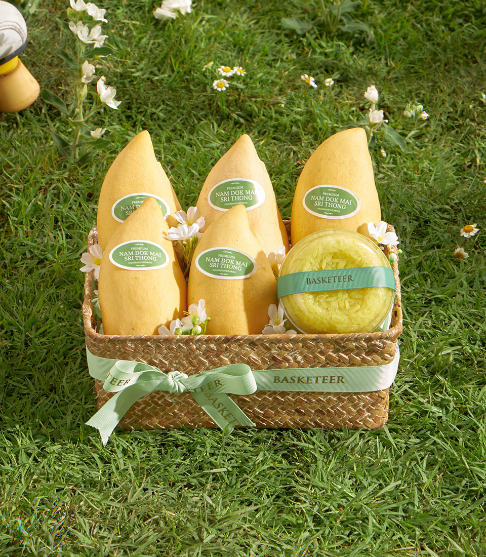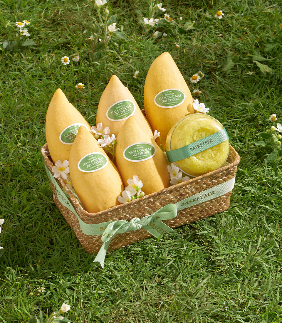 A beautifully curated premium fruit basket featuring Nam Dok Mai See Thong mango from Chachoengsao paired with rainbow herb sticky rice. Naturally sweet, fragrant, and elegantly arranged in a natural woven basket - a refined Thai summer gift with same-day delivery in Bangkok.