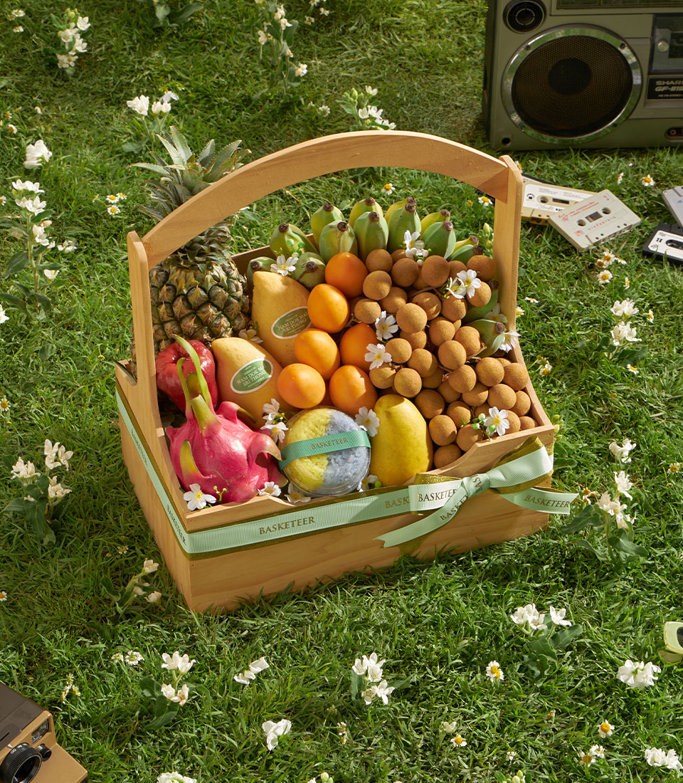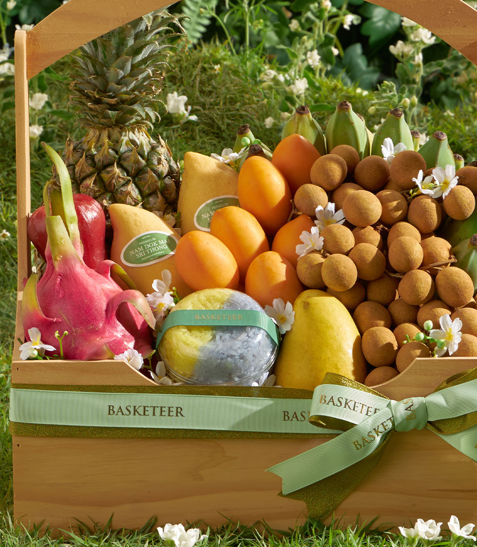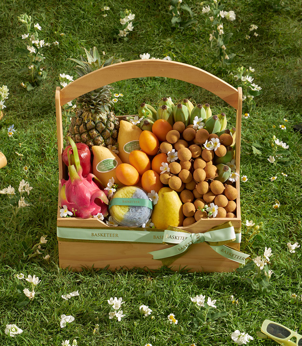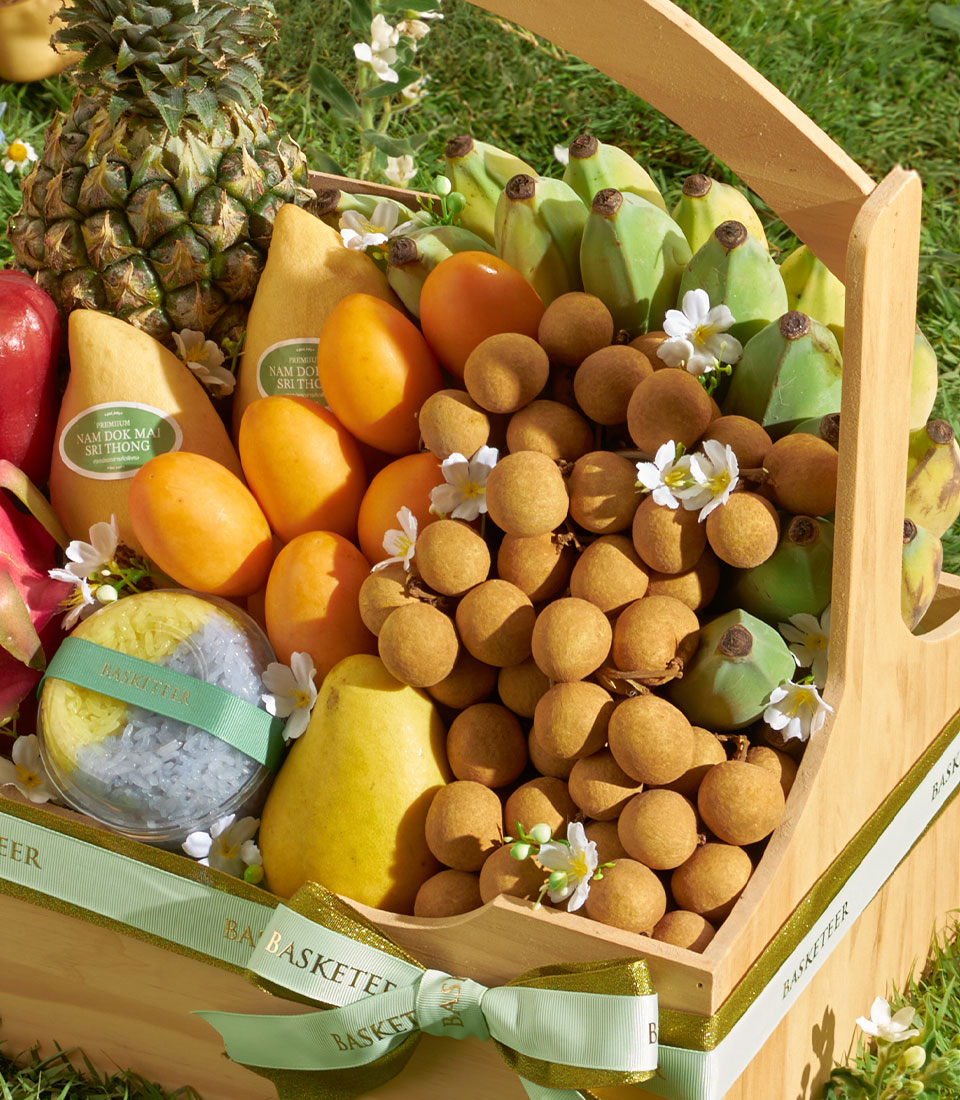 Premium Thai Summer Fruit Basket – Mango, Mayongchid & Abundant Tropical Harvest A rich and wholesome Thai summer fruit basket featuring an abundant selection of tropical favourites, from golden mangoes and sweet mayongchids to fresh longans, pineapple and vibrant seasonal fruits. Beautifully arranged in a spacious wooden basket, this nourishing assortment offers freshness, natural sweetness and a satisfying variety—perfect for generous and impressive seasonal gifting.