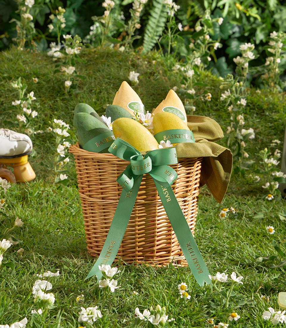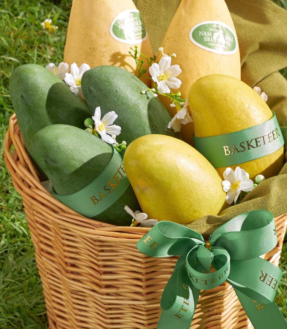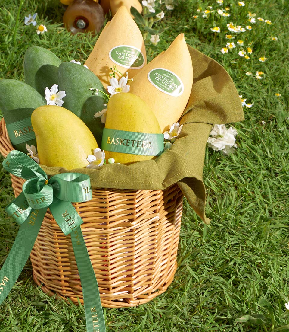 A beautifully curated premium fruit basket featuring a selection of Thai mango varieties including Keo Seowei green mango, Khai Tuek mango, and Nam Dok Mai See Thong mango from Chachoengsao, complemented by a stylish green kitchen towel. Fresh, vibrant, and thoughtfully arranged - a modern and practical summer gift with same-day delivery in Bangkok.