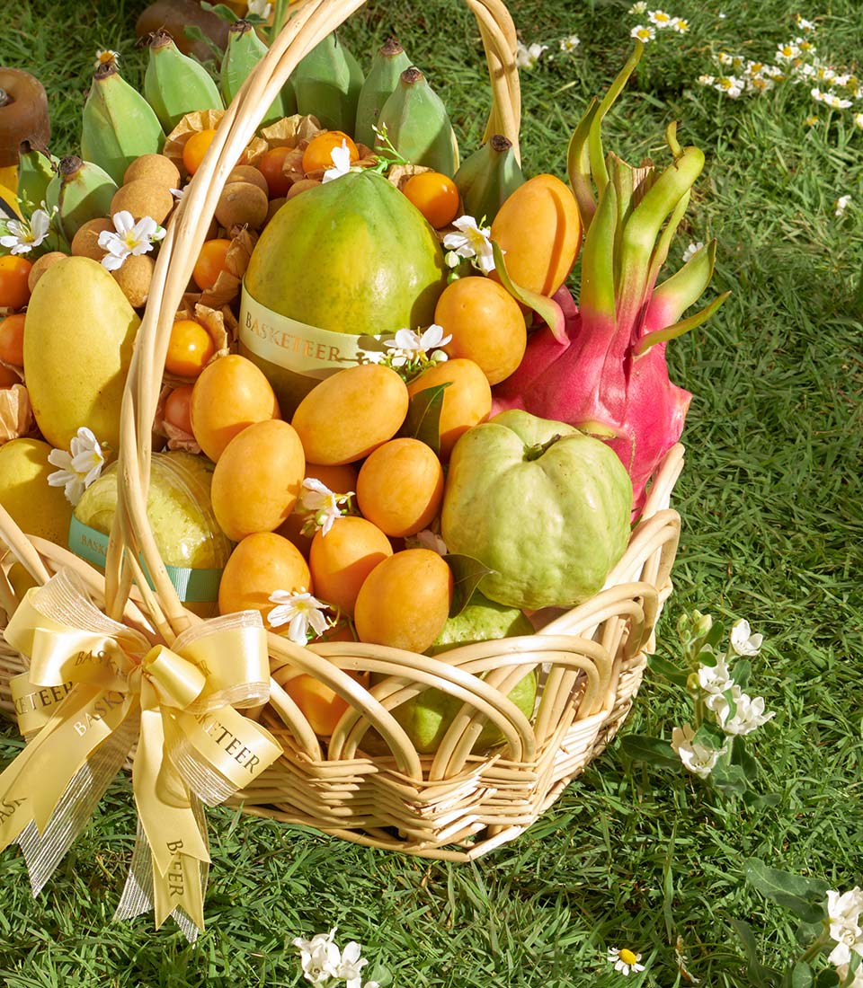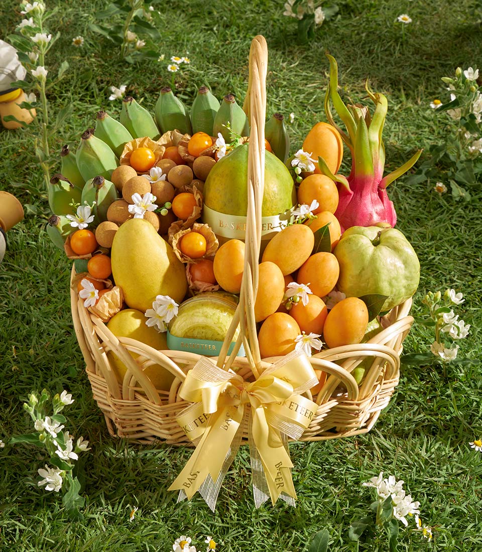 A beautifully curated premium fruit basket featuring a rich selection of Thai tropical fruits, including Khai Tuek mango from Chachoengsao, premium mayongchid (Toon Klaow variety), dragon fruit, papaya, guava, longans, cape gooseberries, and Ducasse bananas, complemented by rainbow herb sticky rice. Vibrant, abundant, and elegantly arranged - a premium Thai gift with same-day delivery in Bangkok.
