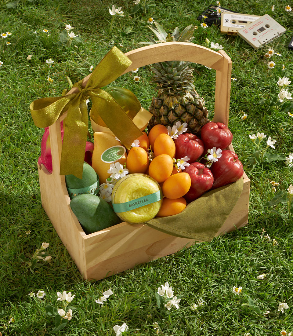 A vibrant selection of premium tropical fruits featuring Nam Dok Mai See Thong mango, green mango, pineapple, papaya, dragon fruit, rose apple, and sweet mayongchid, paired with rainbow herb sticky rice. Completed with a soft kitchen towel, this basket reflects richness in variety, seasonal freshness, and a refined gifting presentation.