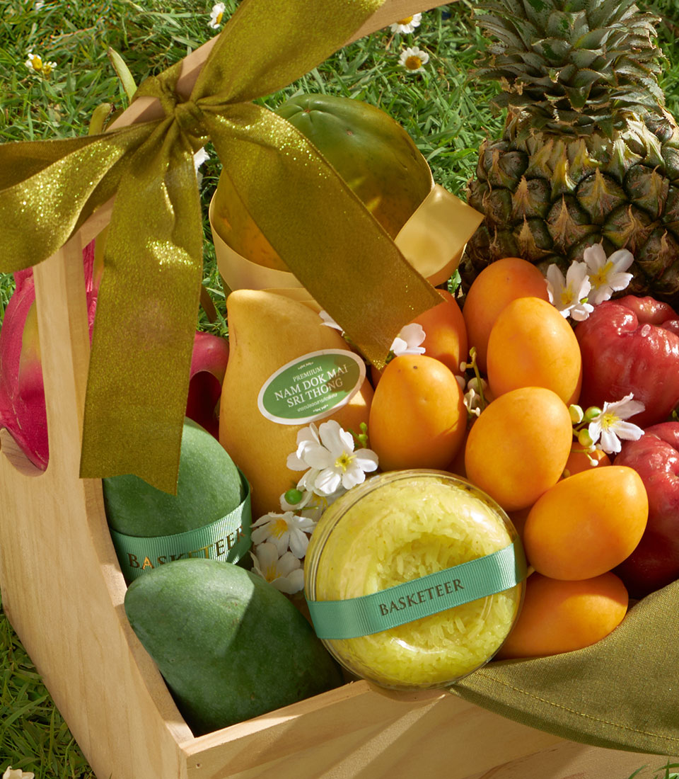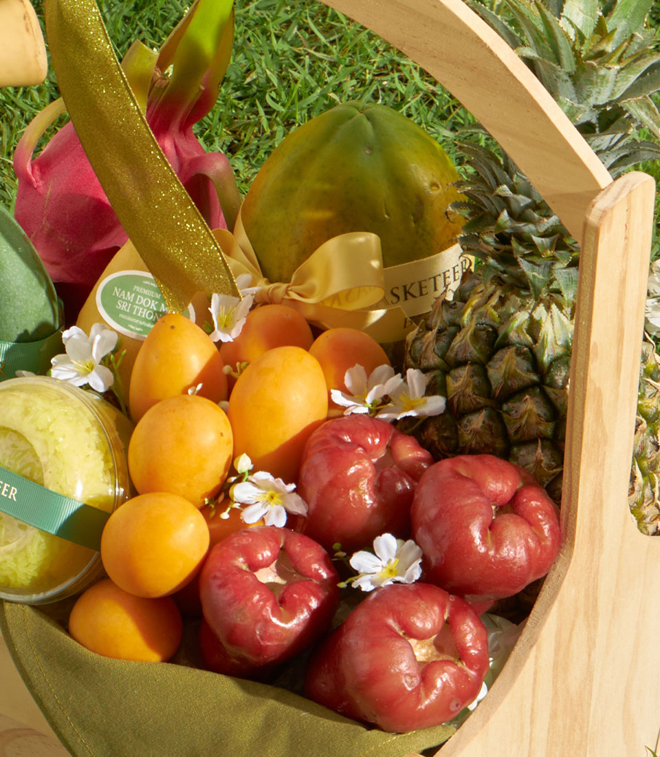 Premium Thai Summer Fruit Basket – Abundant Mango, Mayongchid & Tropical Selection A rich and wholesome Thai summer fruit basket filled with an abundant selection of premium mangoes, sweet mayongchids and a vibrant variety of tropical fruits. Enhanced with traditional rainbow herb sticky rice, this generously arranged basket offers a refreshing, nourishing and satisfying experience—perfect for sharing, celebrating and sending a truly impressive seasonal gift.