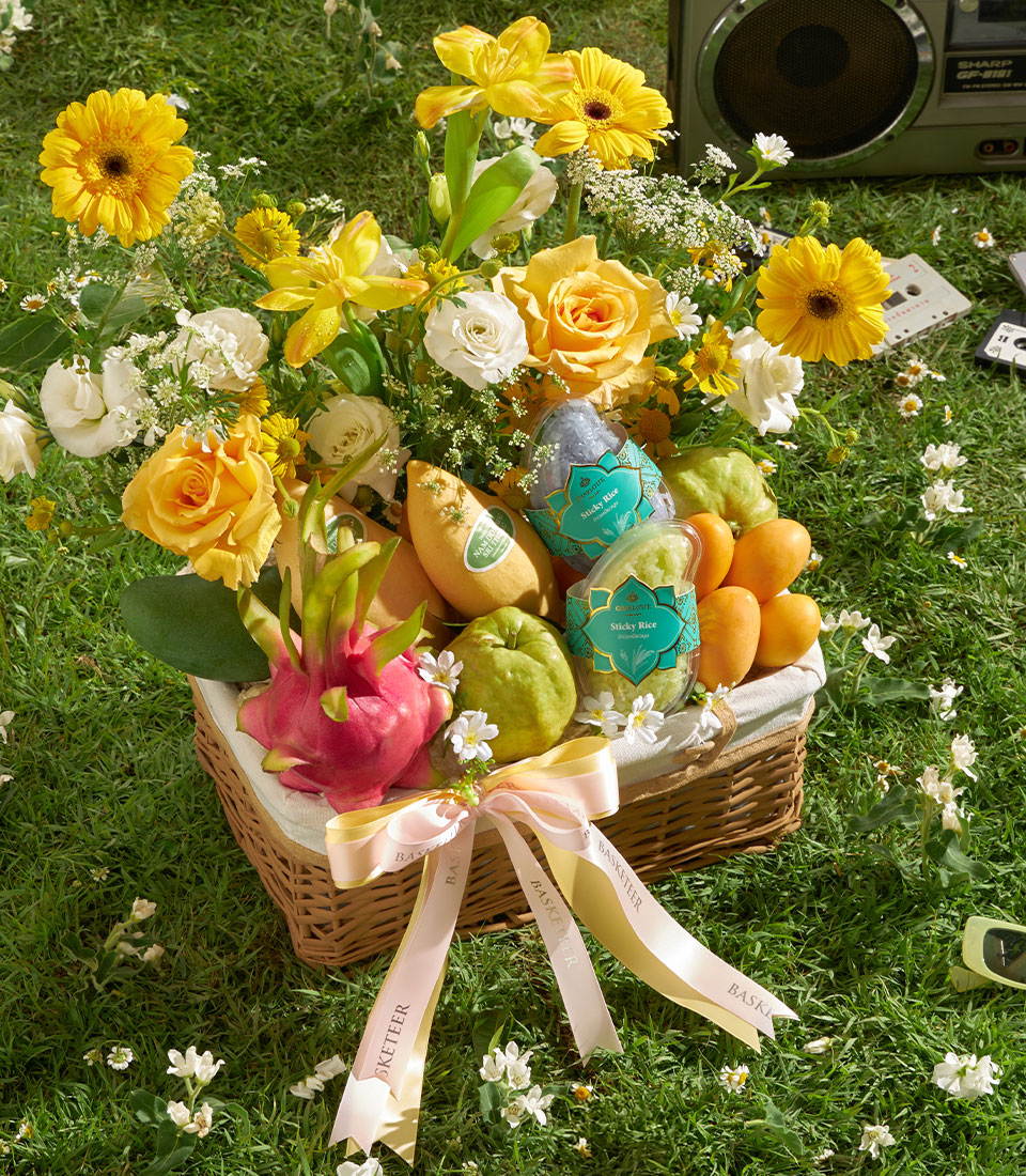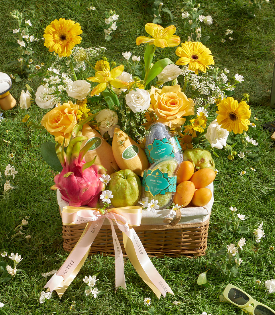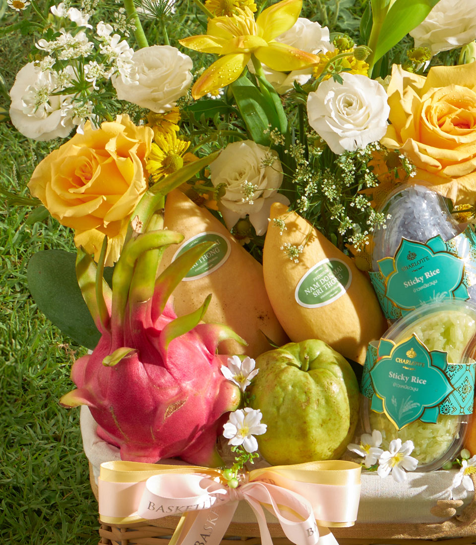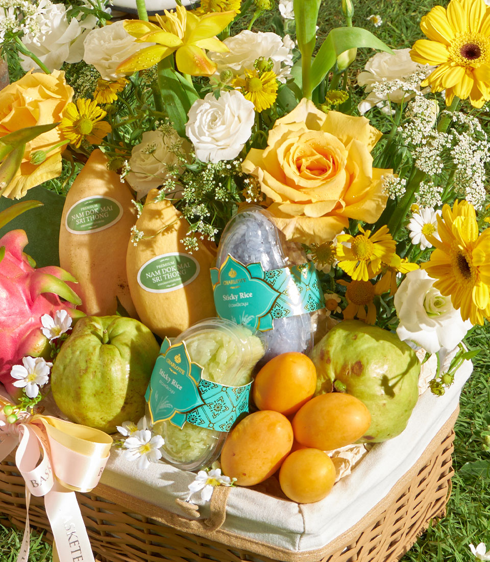 A vibrant selection of premium Thai seasonal fruits featuring Nam Dok Mai See Thong mango, green mango, guava, dragon fruit, and sweet mayongchid, paired with rainbow herb sticky rice. Complemented by bright yellow floral arrangements, this basket brings together freshness, color, and a joyful gifting expression.