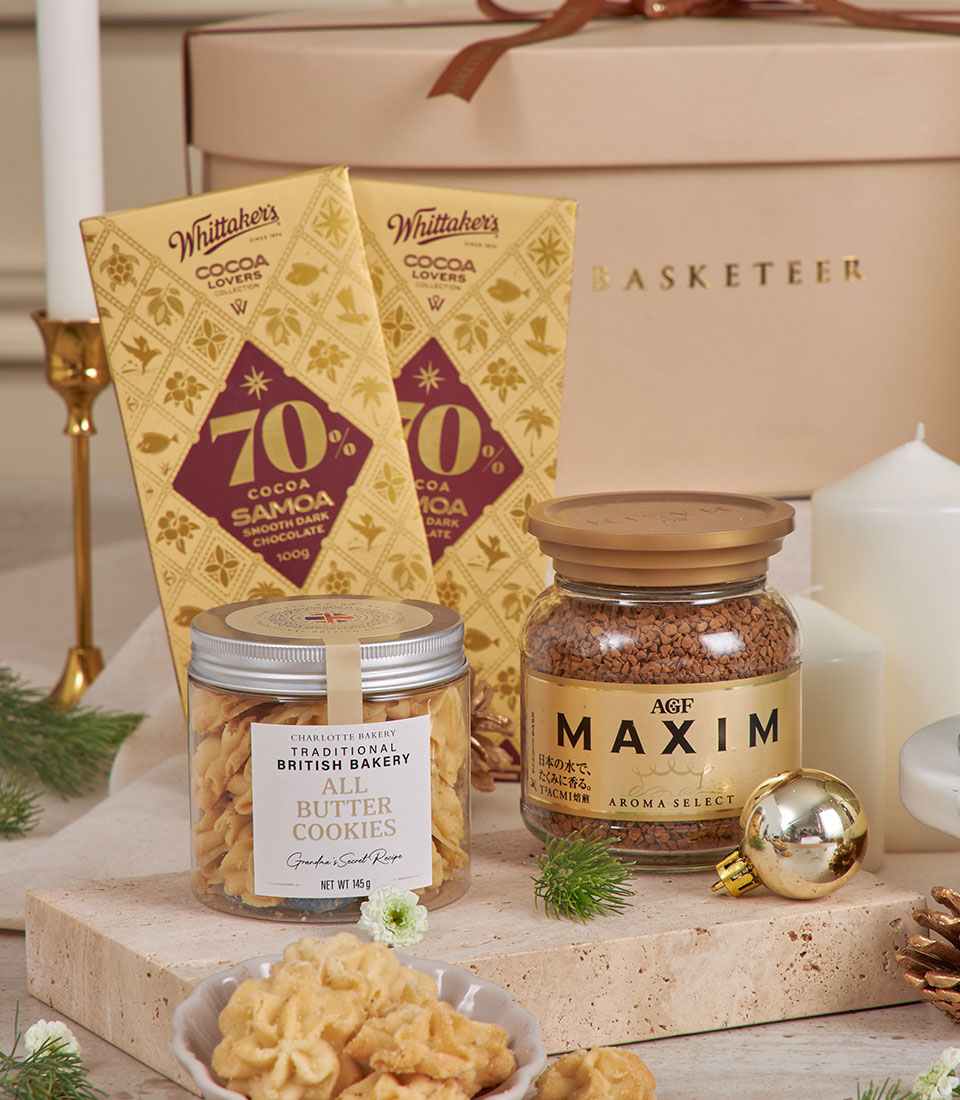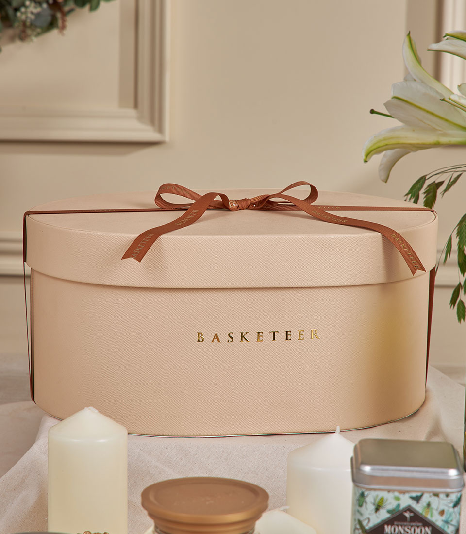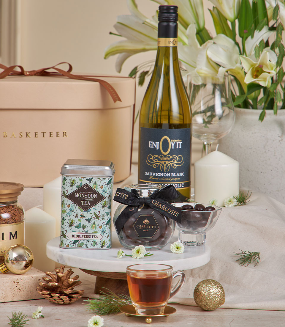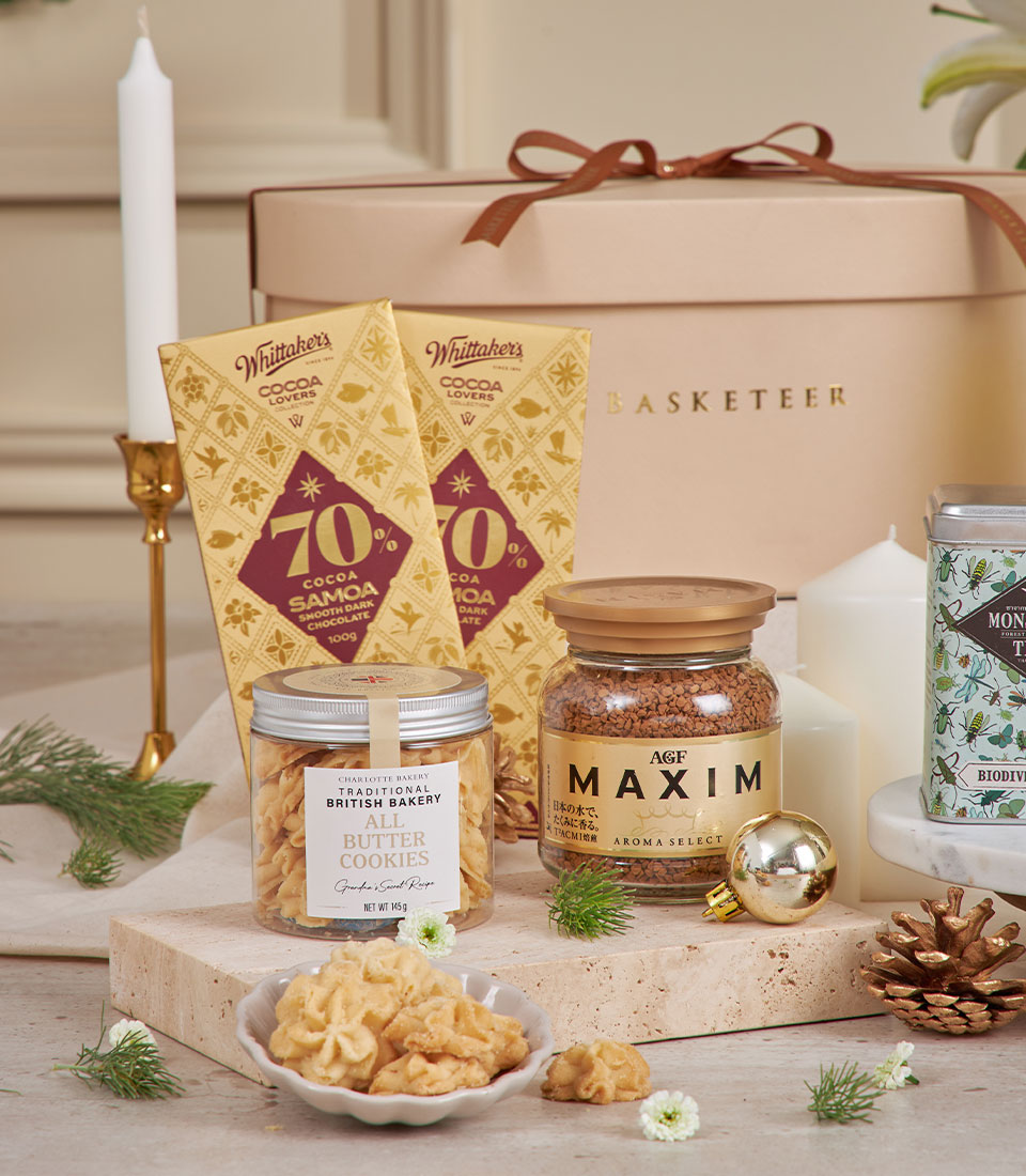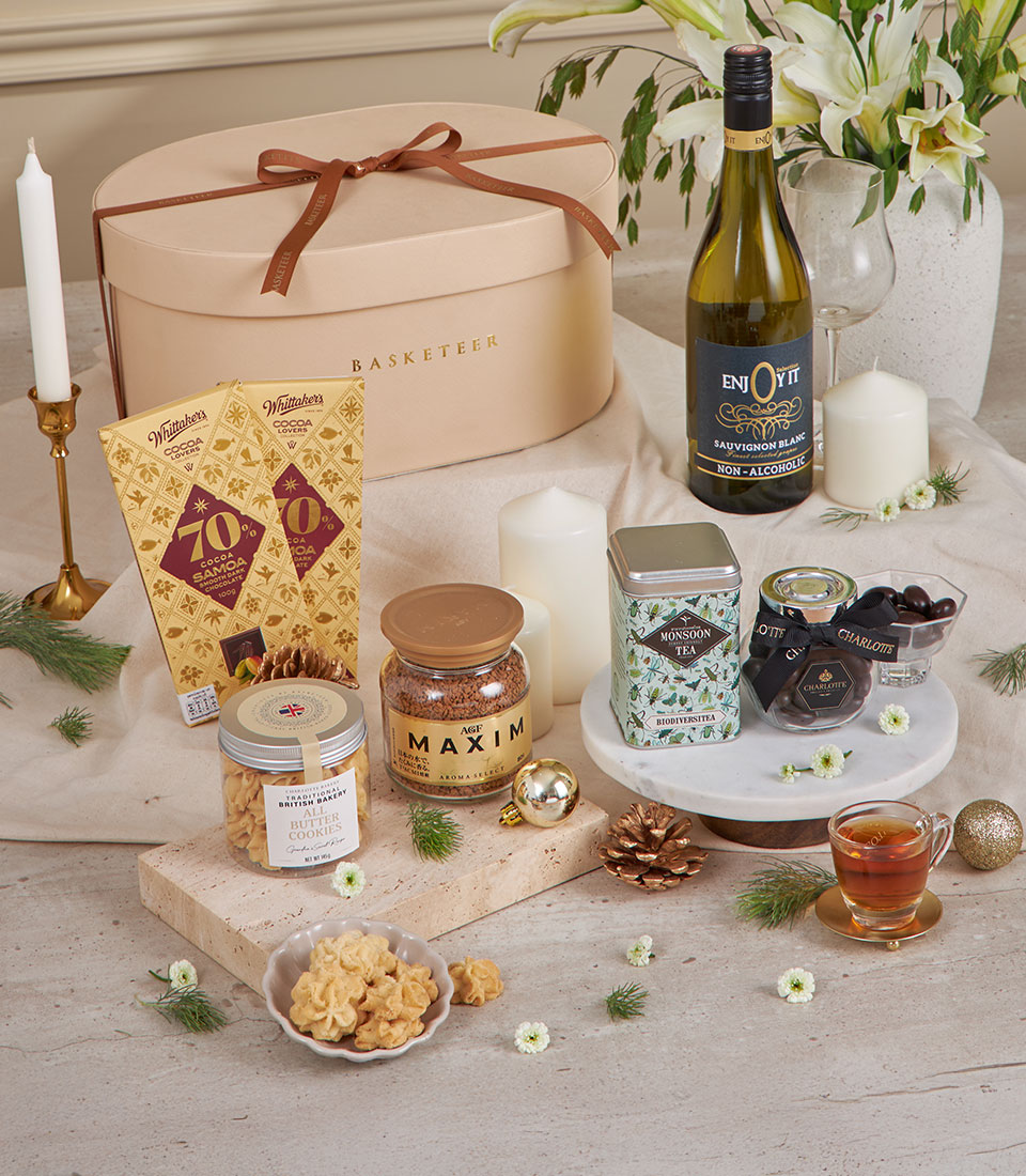 Champagne Gold Celebration Hatbox A refined champagne-gold gourmet hatbox curated with premium dark chocolate, artisan cookies, fine tea and a non-alcoholic Cabernet Sauvignon. Styled in Basketeer’s elegant signature look, this luxurious hamper delivers sophistication, warmth and modern festive charm — perfect for New Year gifting, executive appreciation and premium corporate hampers in Bangkok.