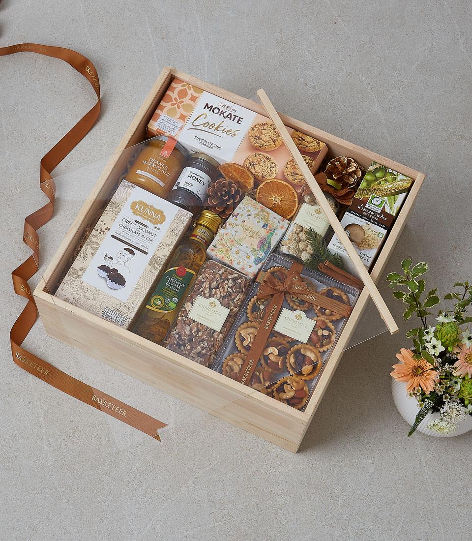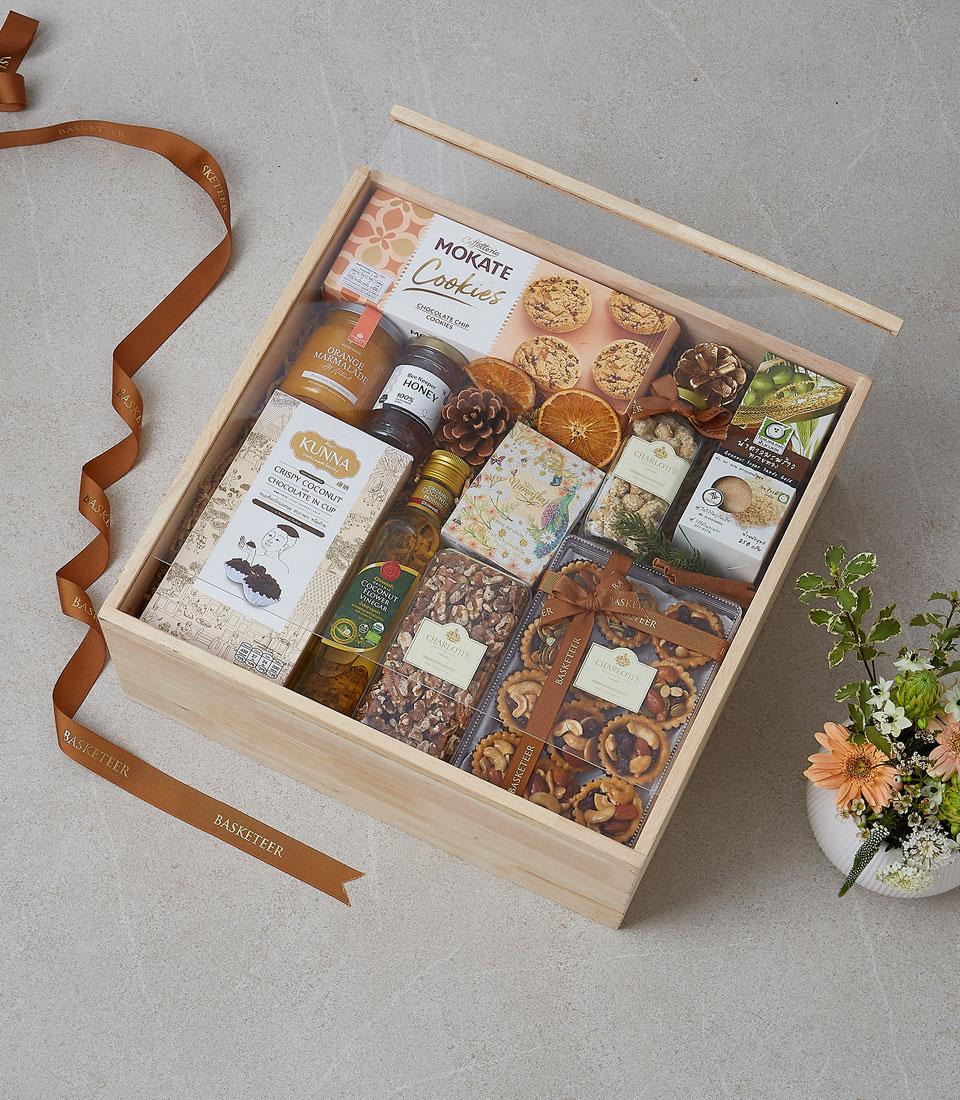 Celebrate life's simple pleasures with this heartwarming gift basket, filled with delicious snacks and cozy treats and delectable contents.