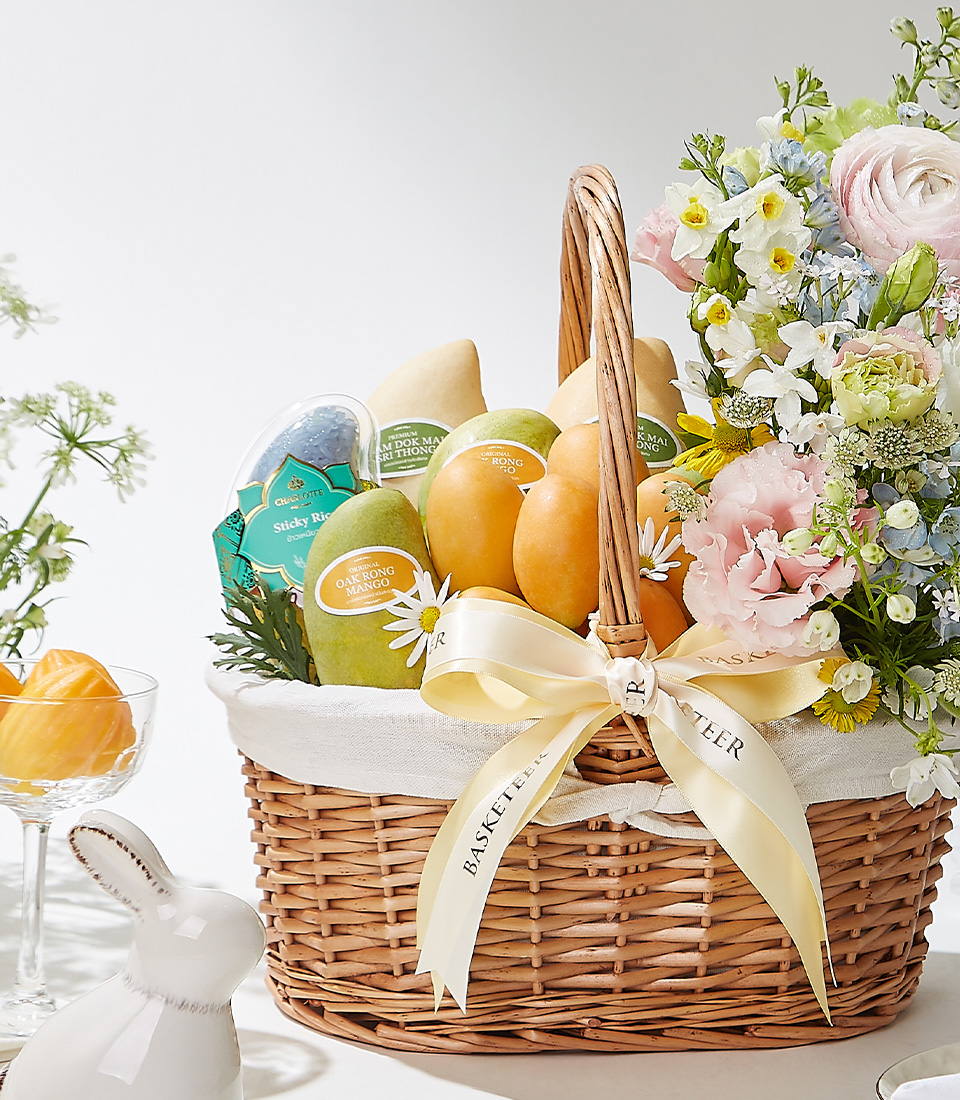 Fresh Thai Fruit Basket with Blooms The Thai Summer Fruit Basket is a luxurious gift filled with Thailand's finest fruits, including fragrant Mayongchids, Nam Dok Mai, and sweet Ok-Rong mangoes. Perfectly paired with Fairy Dust Sticky Rice and vibrant fresh flowers, this elegant basket offers a refreshing taste of Thai summer and is ideal for any occasion.