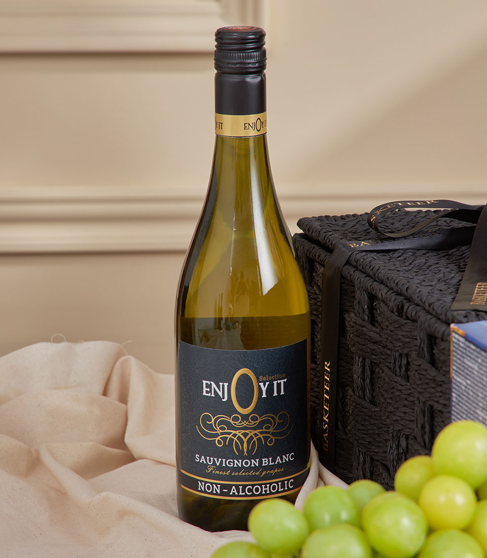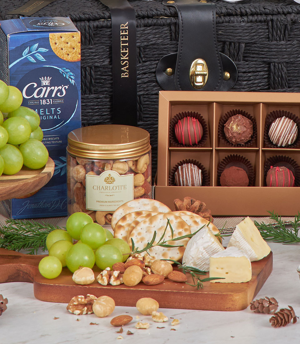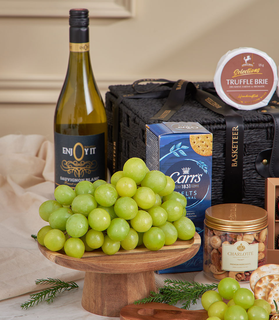 Non-Alcoholic Cabernet & Truffle Brie Celebration Hamper A luxurious black-themed cheese and wine-style hamper featuring Enjoy It non-alcoholic Cabernet, a trio of Unicorn speciality cheeses, imported green seedless grapes, artisan crackers, deluxe mixed nuts, praline chocolates, olives and rich chutneys. Perfectly styled in Basketeer’s signature black hamper, this elegant set is ideal for sophisticated entertaining, VIP gifting and New Year celebrations in Bangkok.