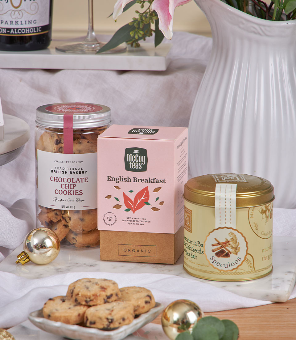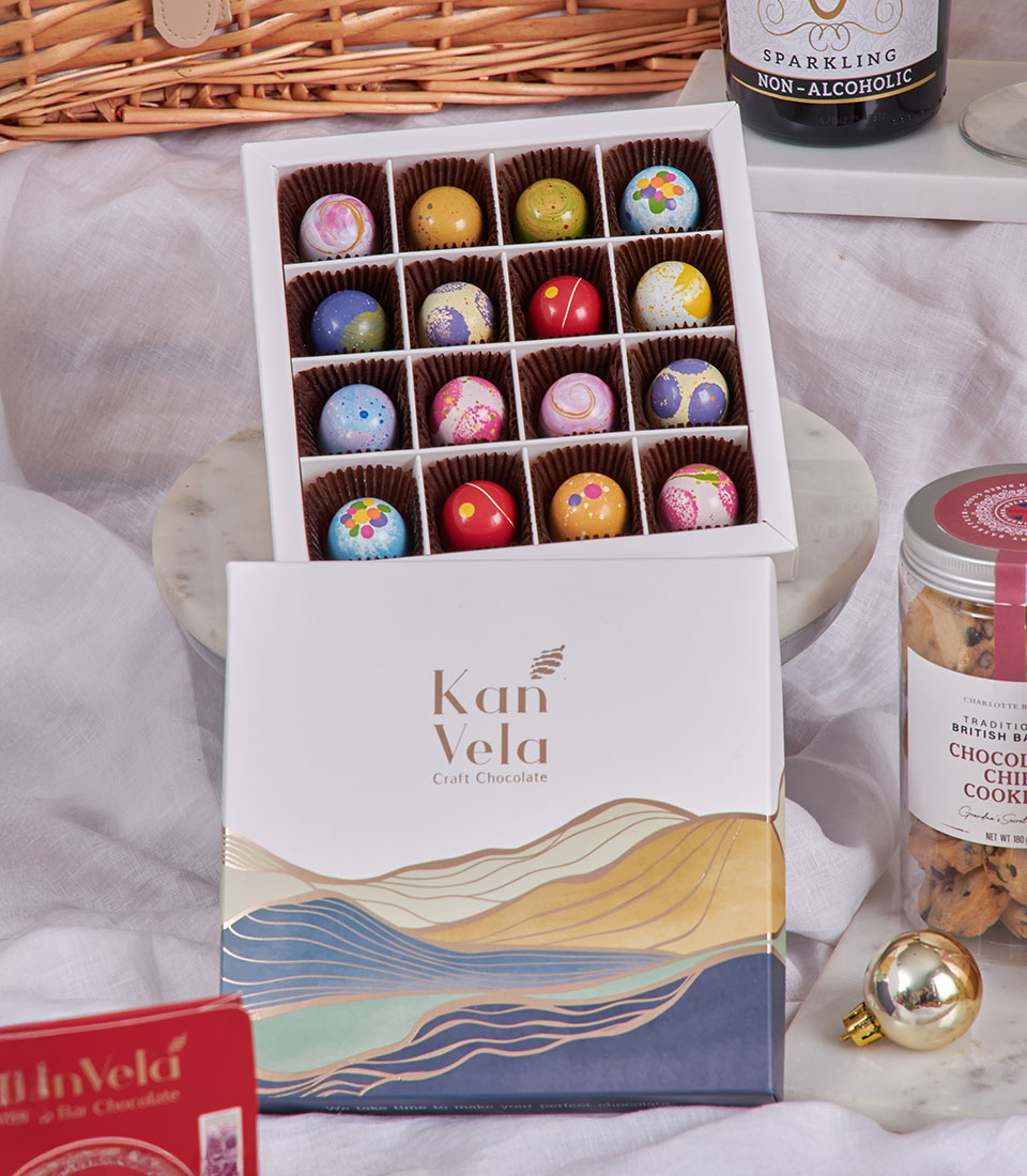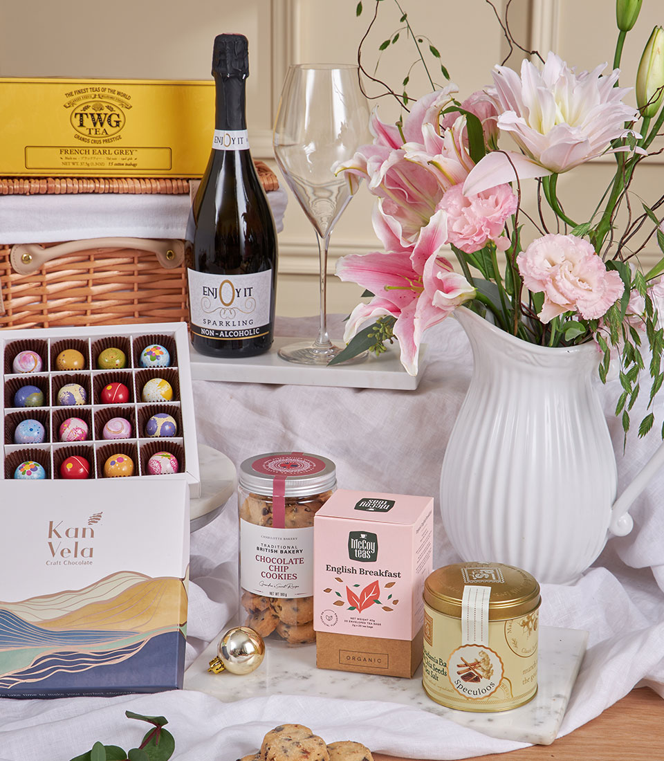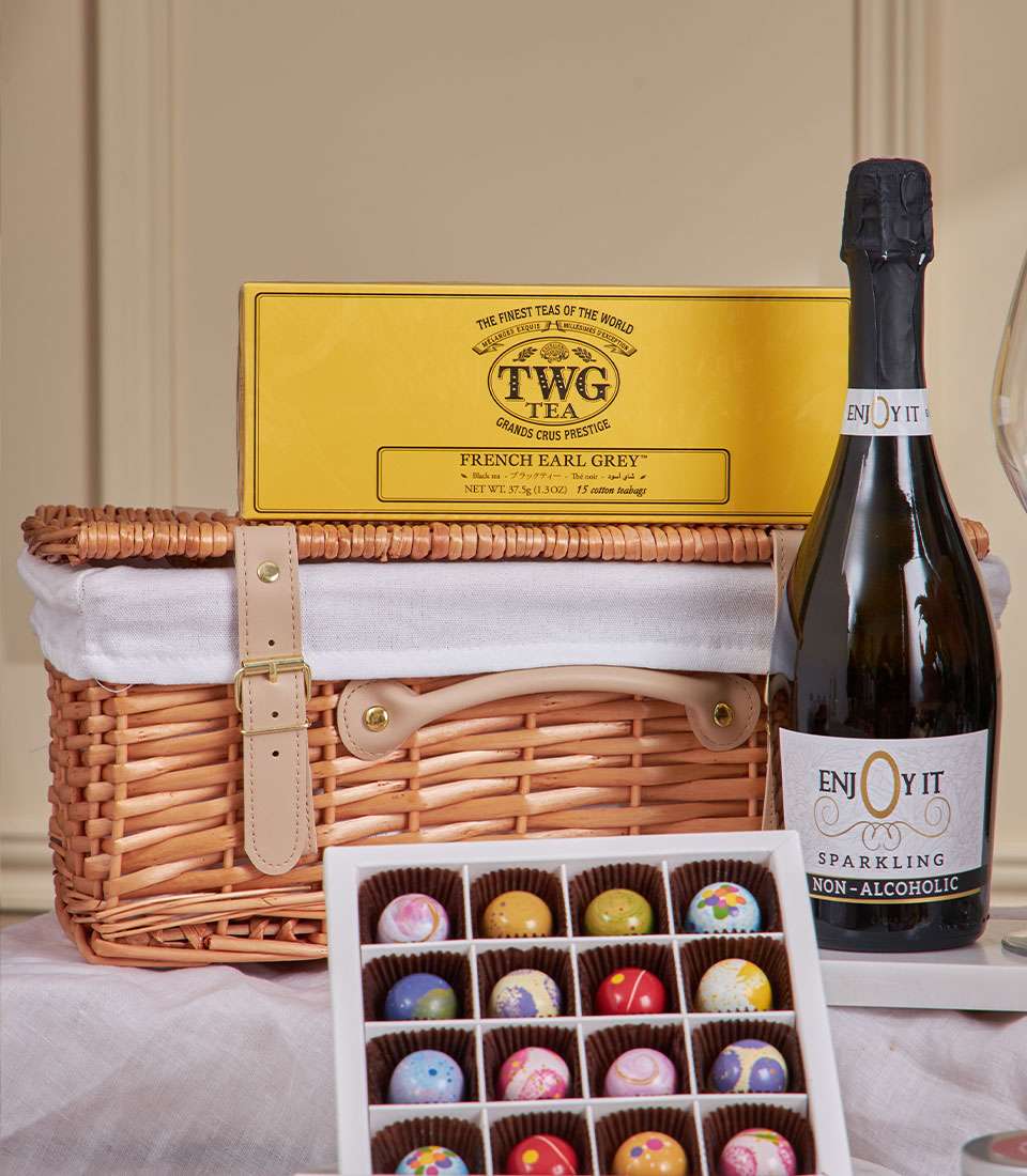 Champagne & Chocolate Celebration Set A romantic celebration hamper pairing fine non-alcoholic sparkling, artisan chocolates, tea and cookies — perfect for marking special occasions with style.