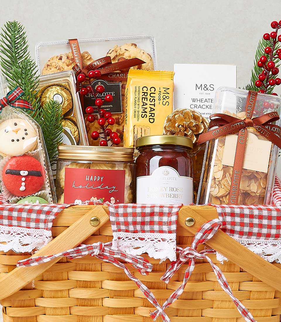 Christmas basket filled with gourmet snacks, sweet treats, and festive decorations, making it the ideal holiday gift for loved ones.