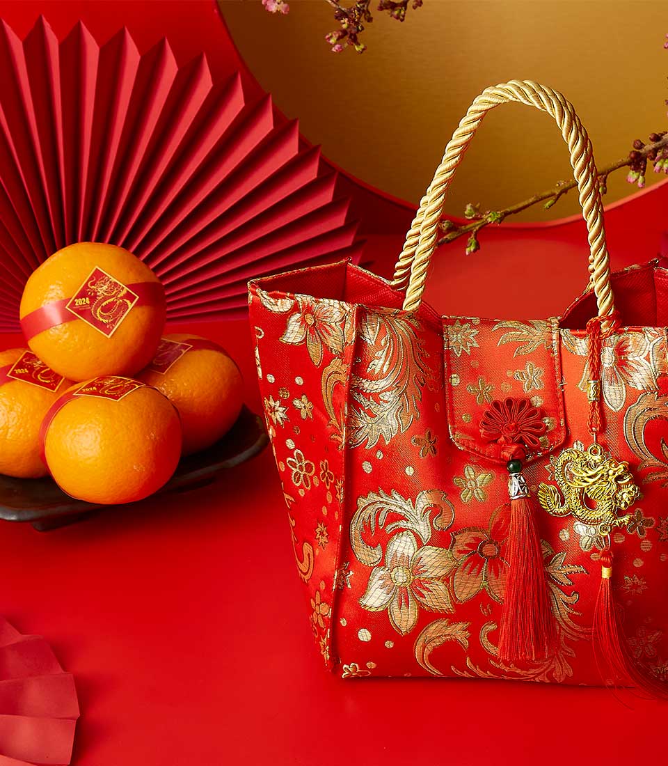 CNY : Mandarin Citrus Gift Bag Make this Lunar New Year unforgettable with our Golden Tassel Red Gift Tote. This exquisite tote bag, decorated with intricate gold floral patterns and traditional tassels, holds fresh mandarins to symbolize good luck and prosperity. A perfect choice for heartfelt gifting and festive celebrations.