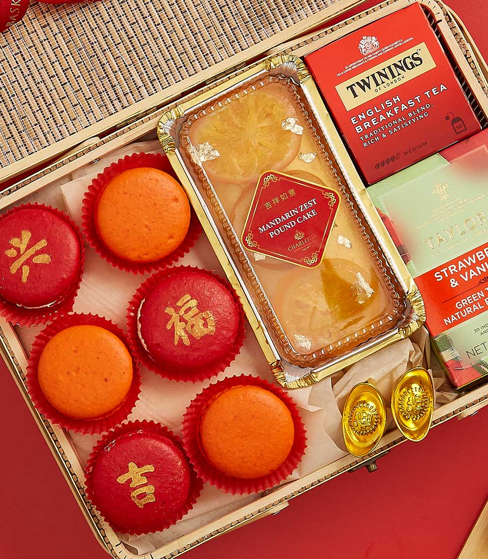 CNY : Chinese New Year Sweets Treat Delight Basket Celebrate Chinese New Year with this luxurious gift set featuring a rich Mandarin pound cake festive macarons and an exquisite selection of fine teas. Perfect for sharing joy and creating memorable moments with loved ones during any festive occasion. This thoughtful gift set blends traditional flavors with a touch of elegance.