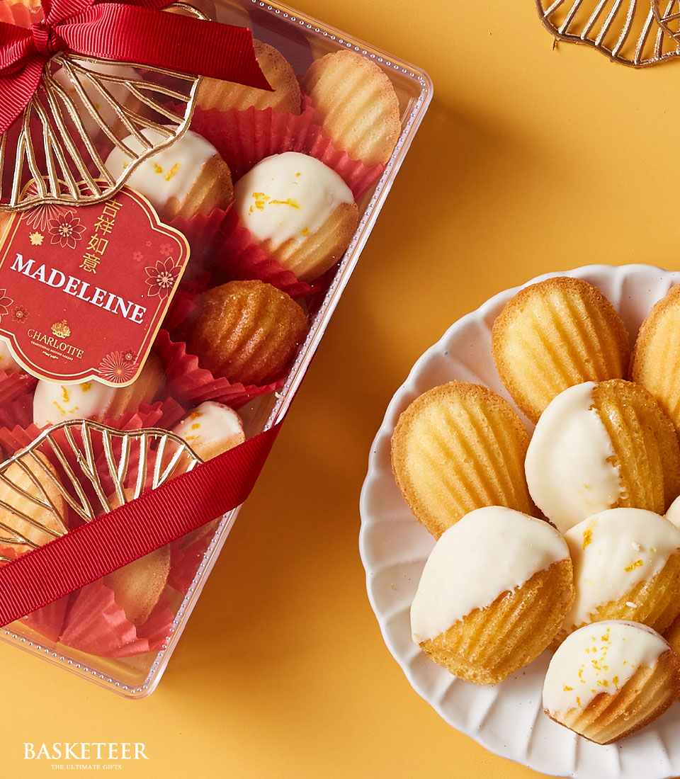 Mandarin Dream Blossom Madeleines Assortment Gift Delight in soft, buttery madeleines infused with the refreshing flavor of mandarin zest, with select pieces dipped in creamy white chocolate for a touch of sweetness. Beautifully presented in a ribbon-adorned gift box, this elegant treat is perfect for holidays, corporate gifting, or sharing with loved ones.
