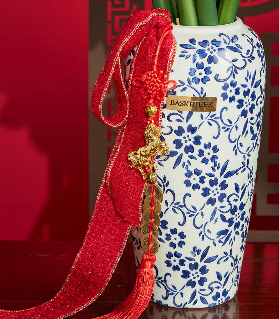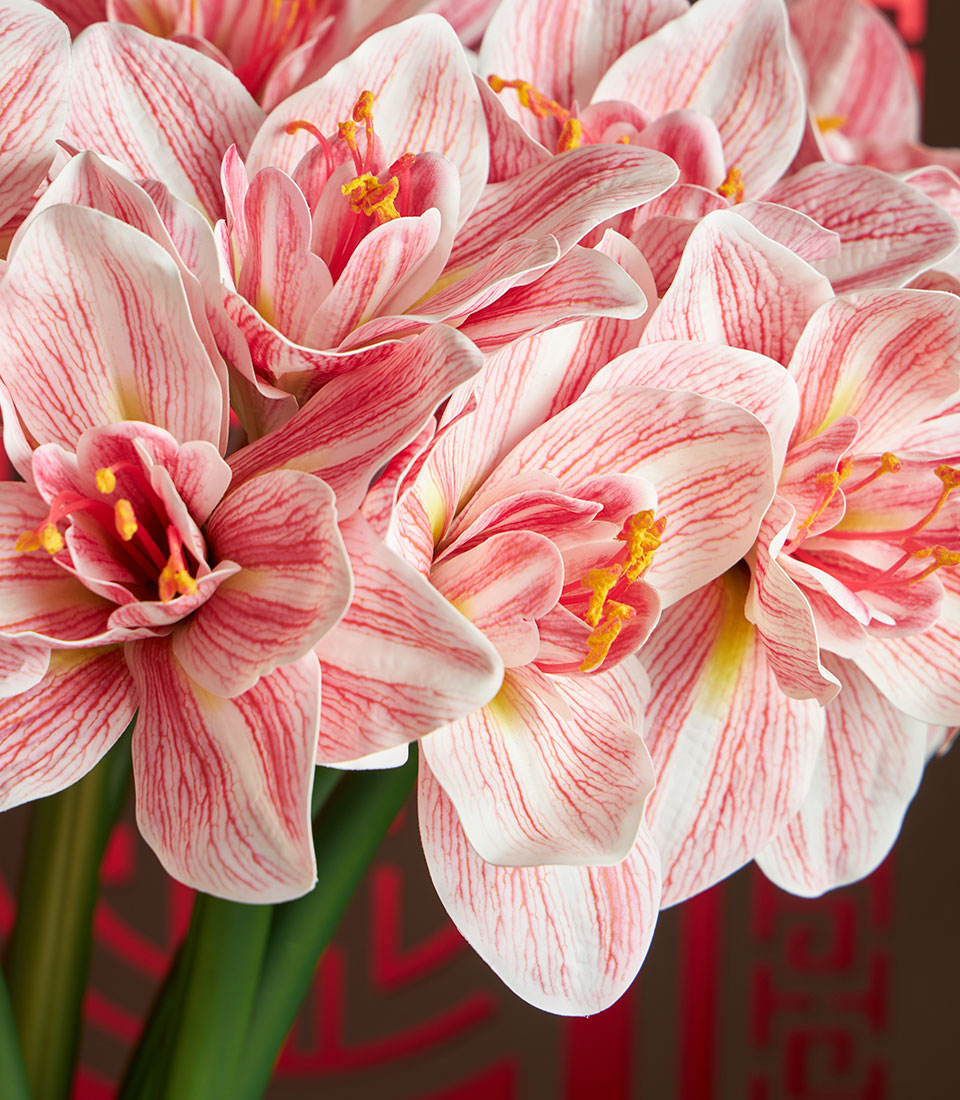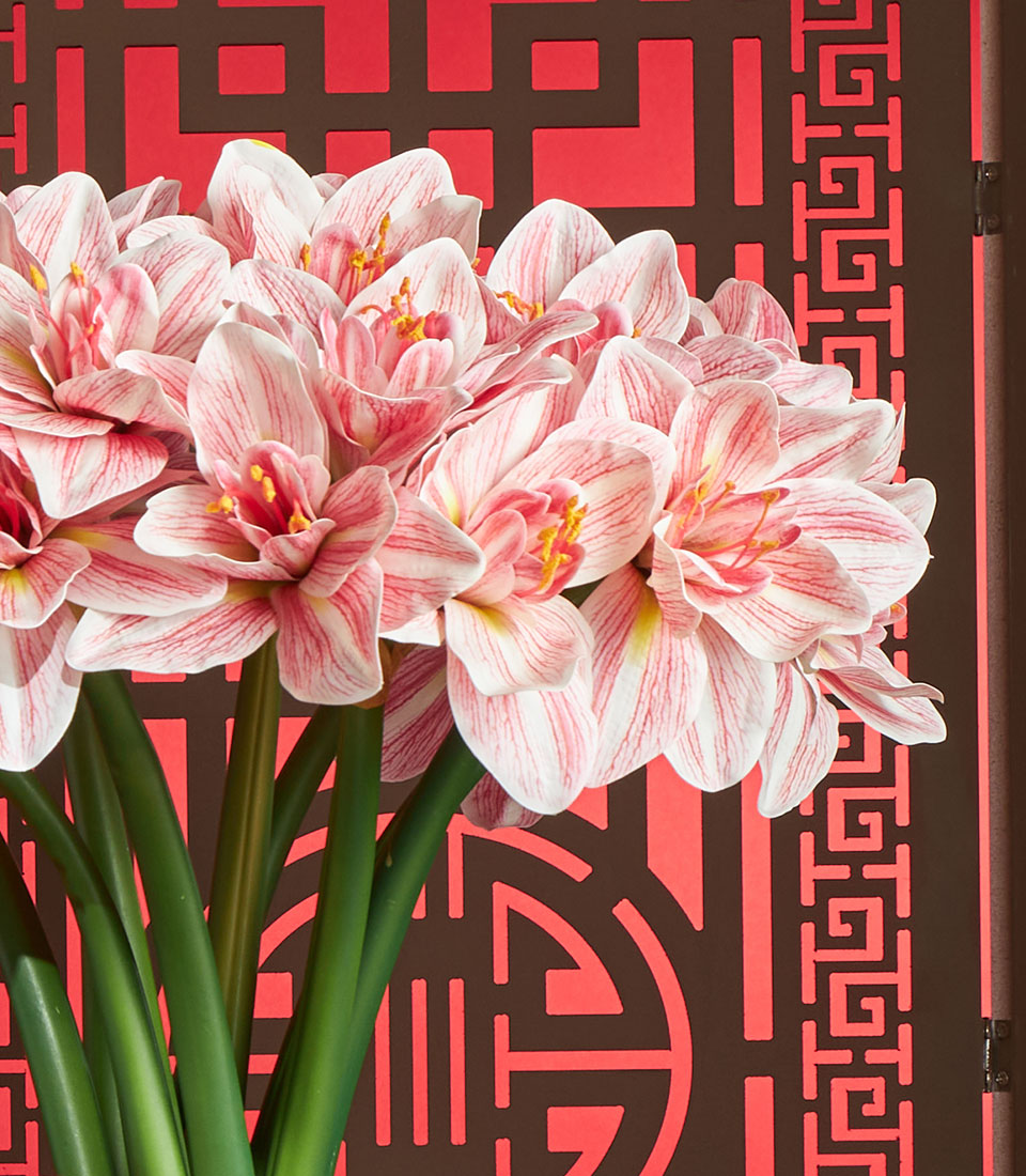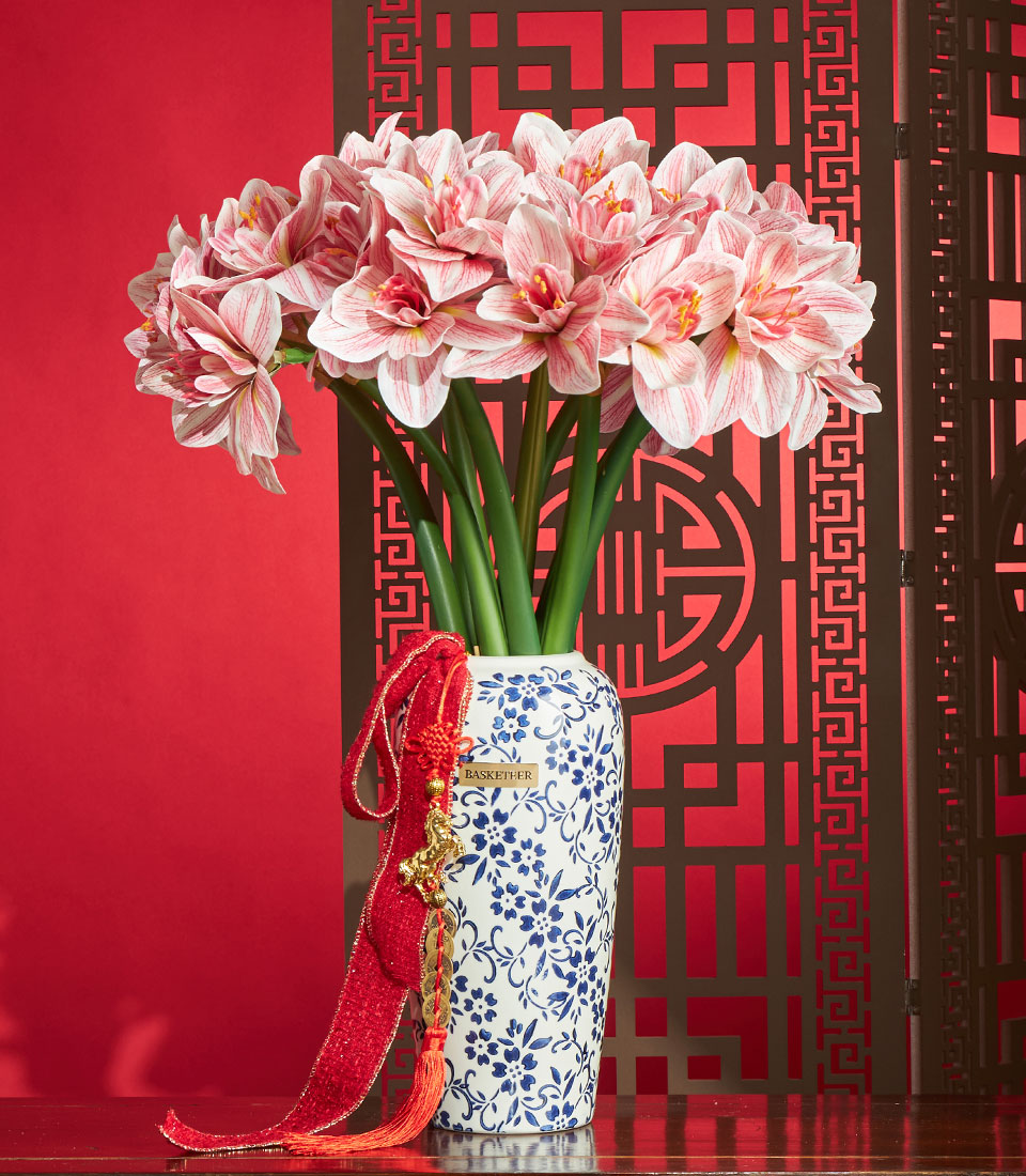 An elegant Chinese New Year decorative arrangement featuring artificial amaryllis flowers in soft pink tones, styled in a classic porcelain-pattern vase and finished with festive red accents. A refined décor piece symbolising renewal, prosperity, and graceful celebration for Lunar New Year settings.