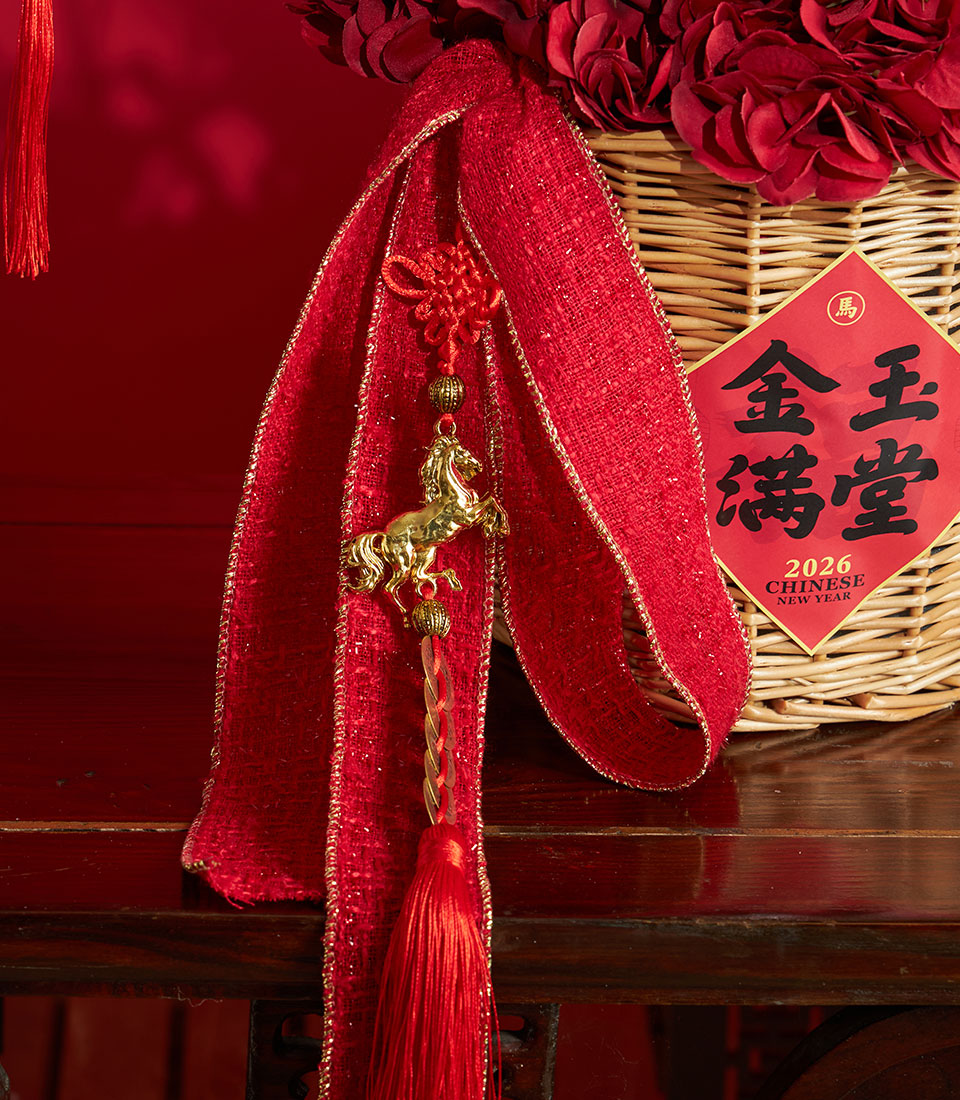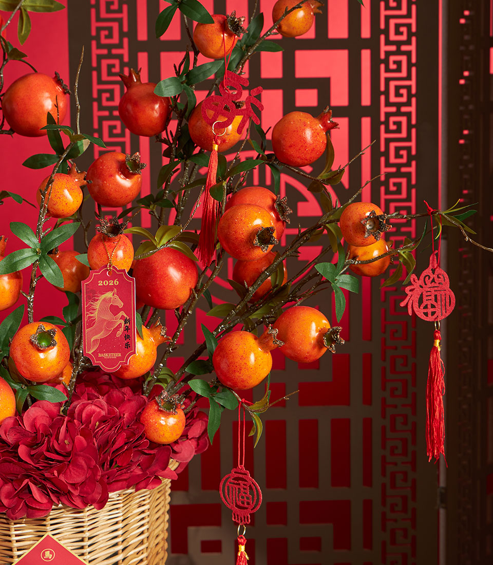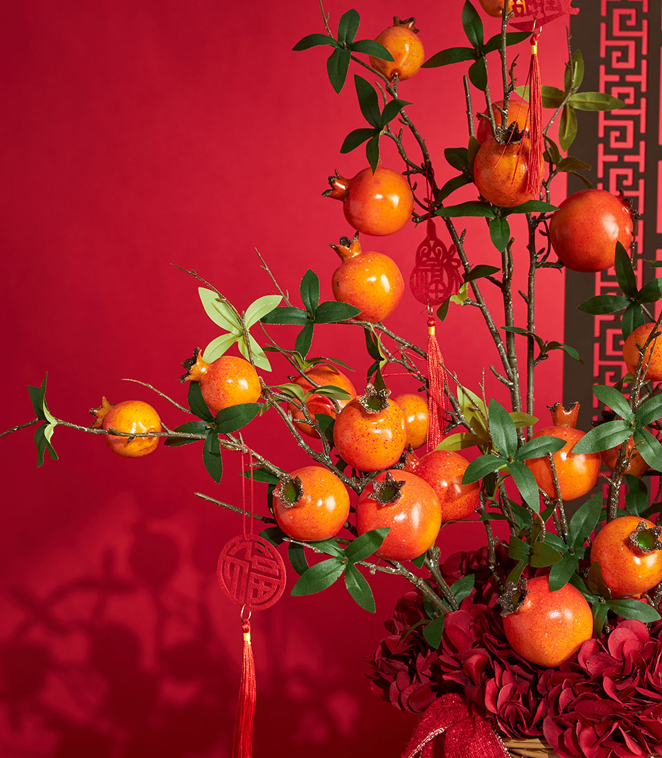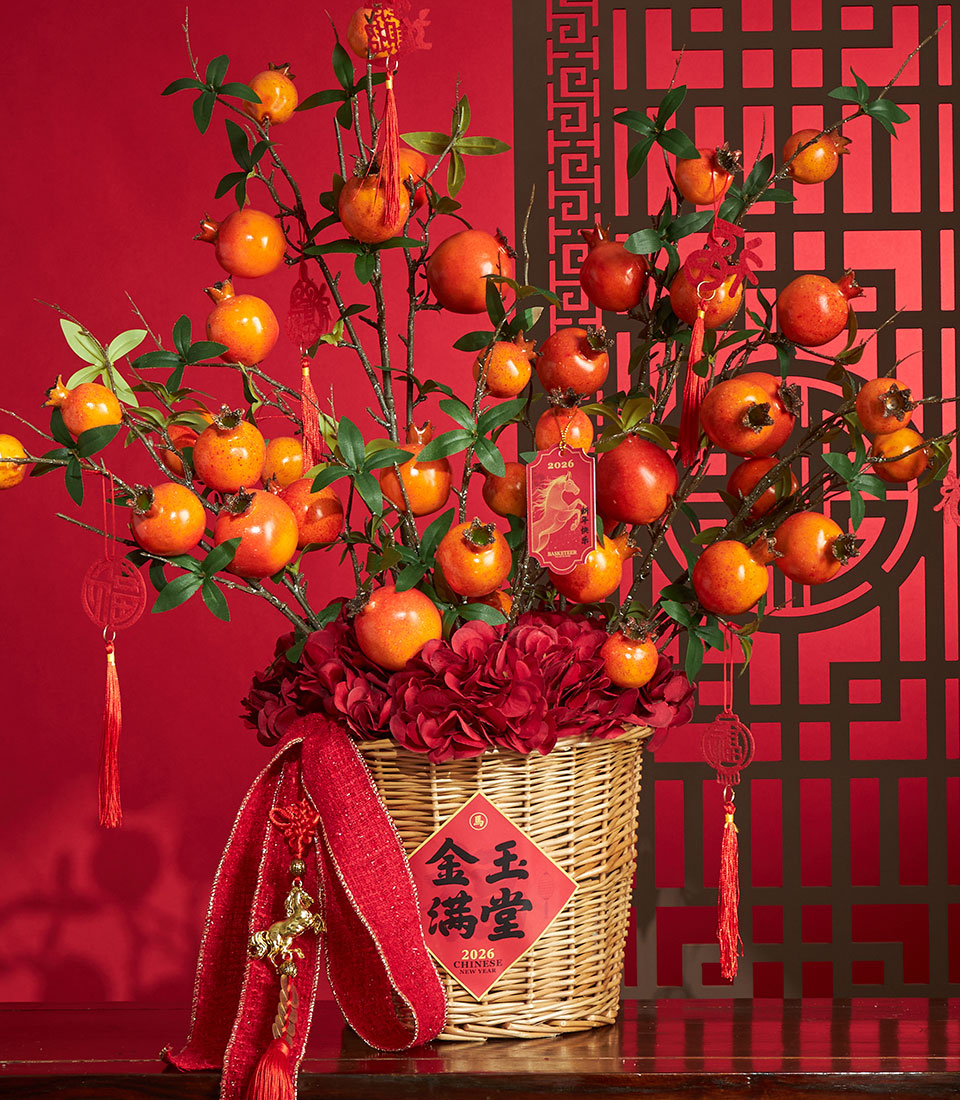 A vibrant Chinese New Year artificial arrangement featuring lifelike pomegranate branches paired with rich red hydrangea blooms. Finished with festive lucky tags and presented in a woven basket, this design brings prosperity symbolism and bold seasonal elegance to any space.