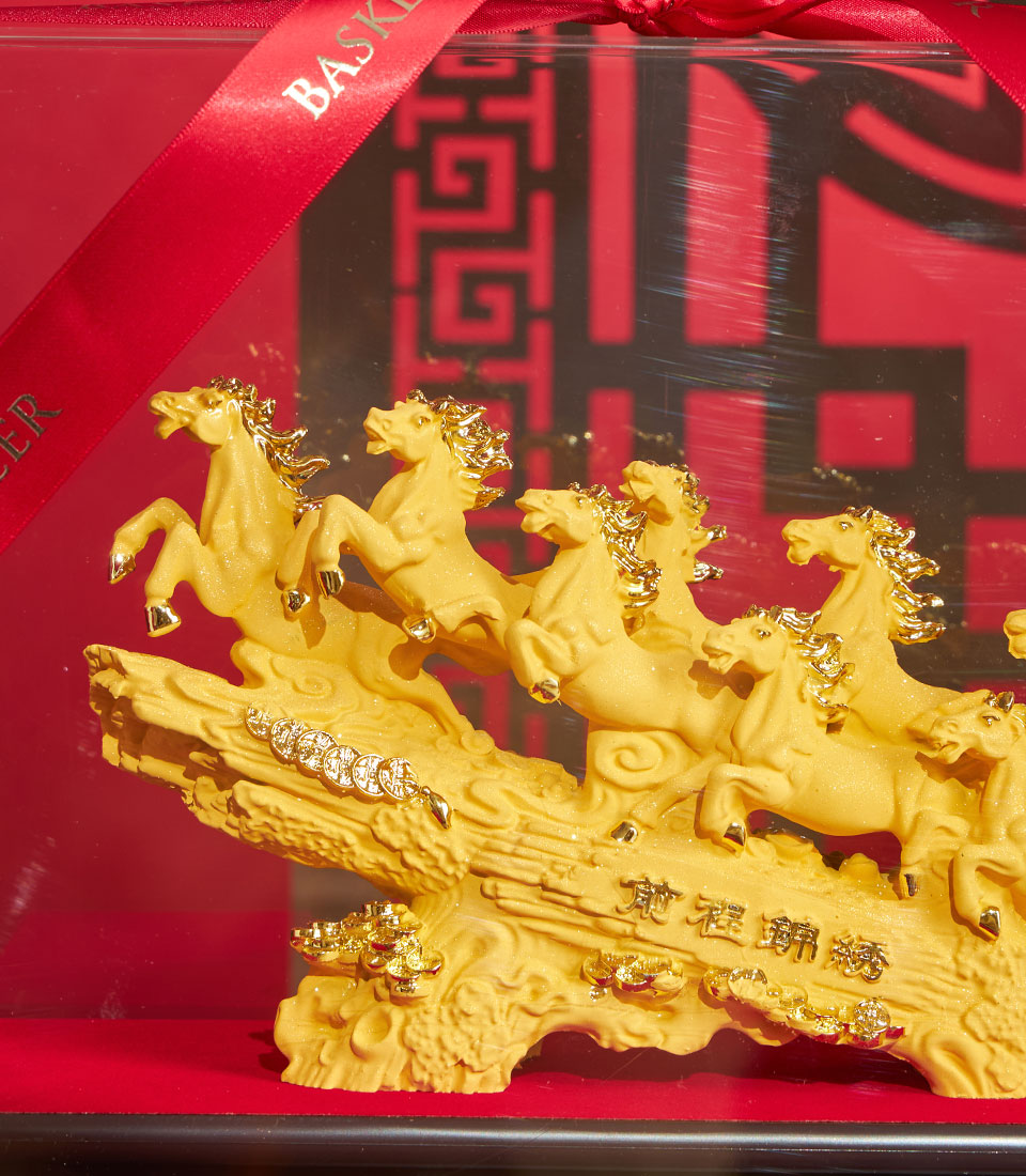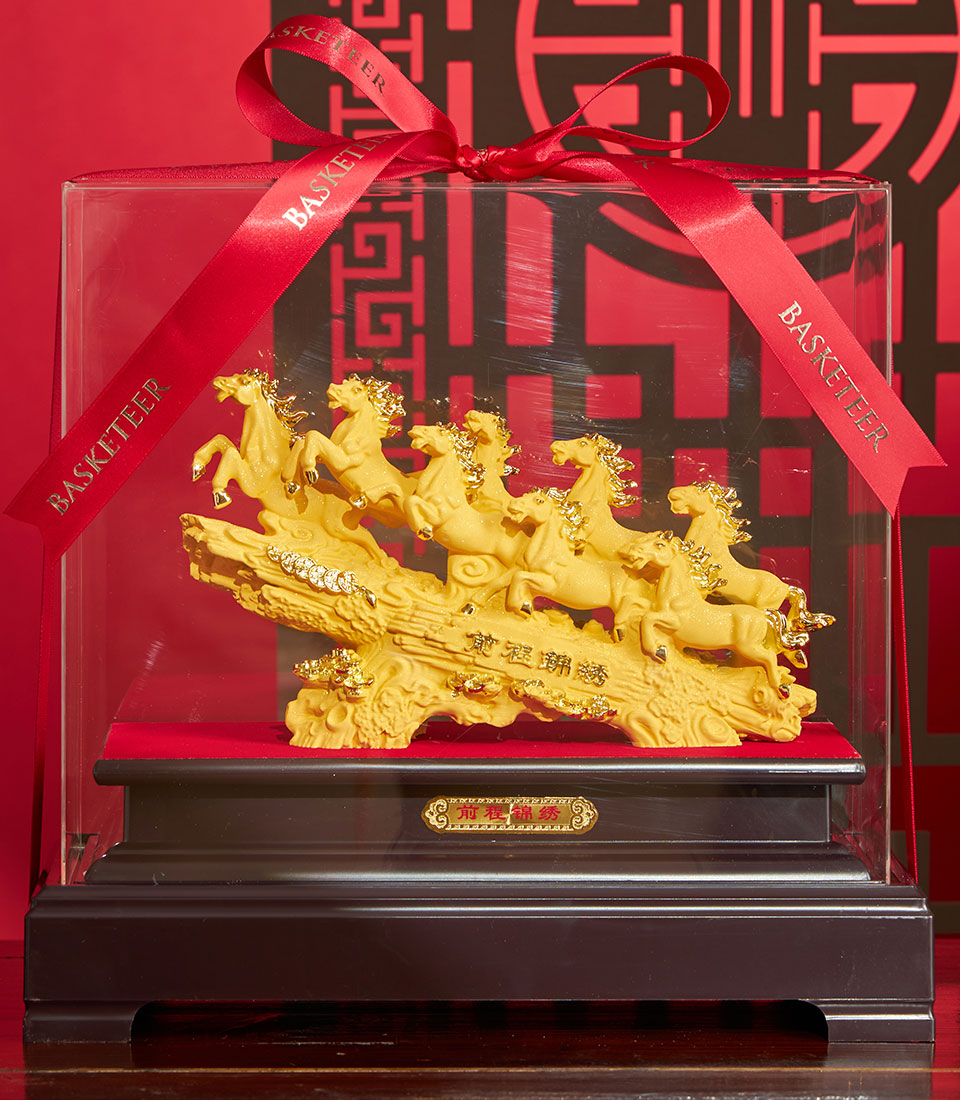 An elegant Chinese New Year decorative sculpture featuring eight golden horses in dynamic motion, symbolising ambition, achievement, and collective success. Presented in a clear display case with refined red ribbon accents, this piece is ideal for festive home décor, offices, and auspicious corporate gifting.