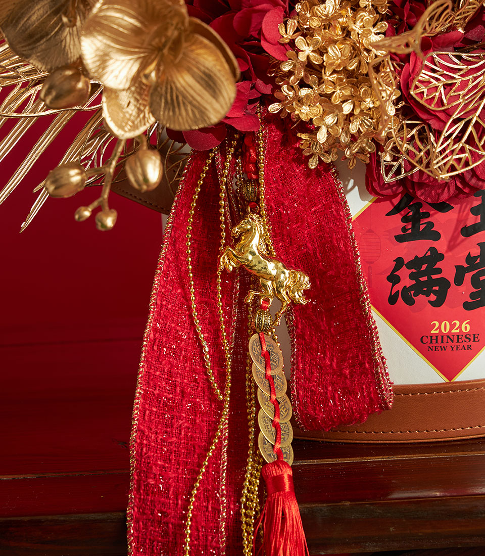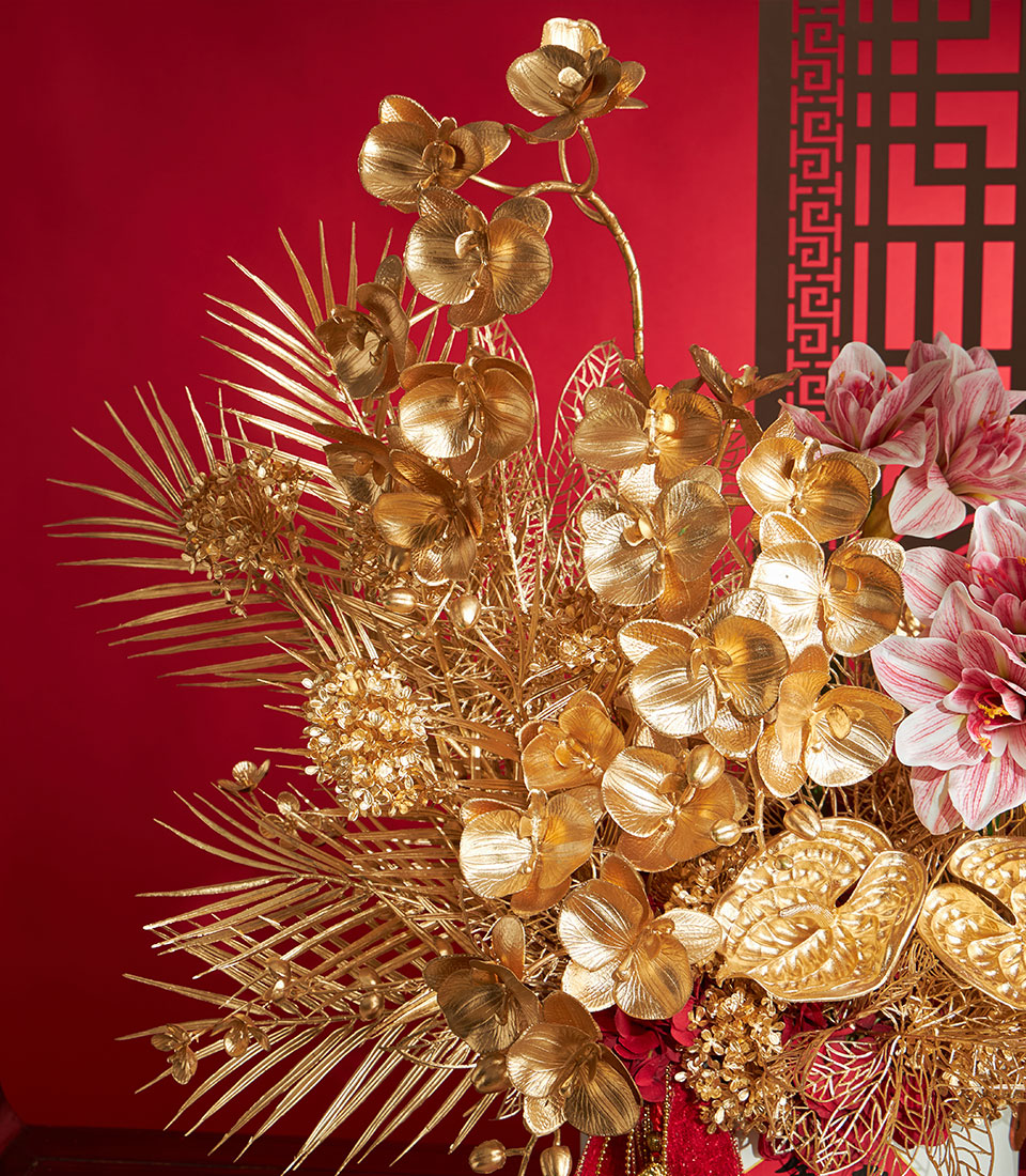 A luxurious Chinese New Year floral decoration featuring radiant gold artificial flowers paired with elegant amaryllis blooms. Designed in a rich festive palette with refined gold accents, this statement arrangement symbolises prosperity, elegance, and auspicious new beginnings for home or corporate décor.