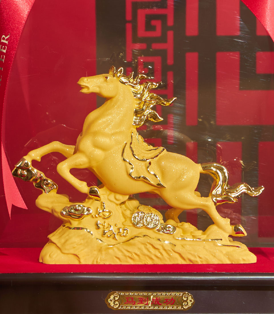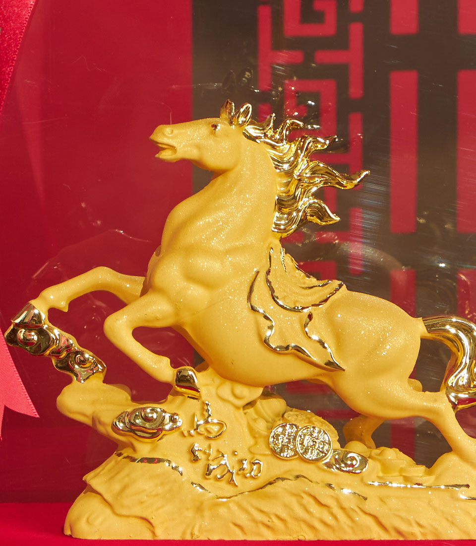 A striking Chinese New Year decorative sculpture featuring a golden success horse displayed in a clear presentation case with an elegant red ribbon. Symbolising strength, achievement, and forward momentum, this piece is ideal for festive home décor, offices, and auspicious gifting.