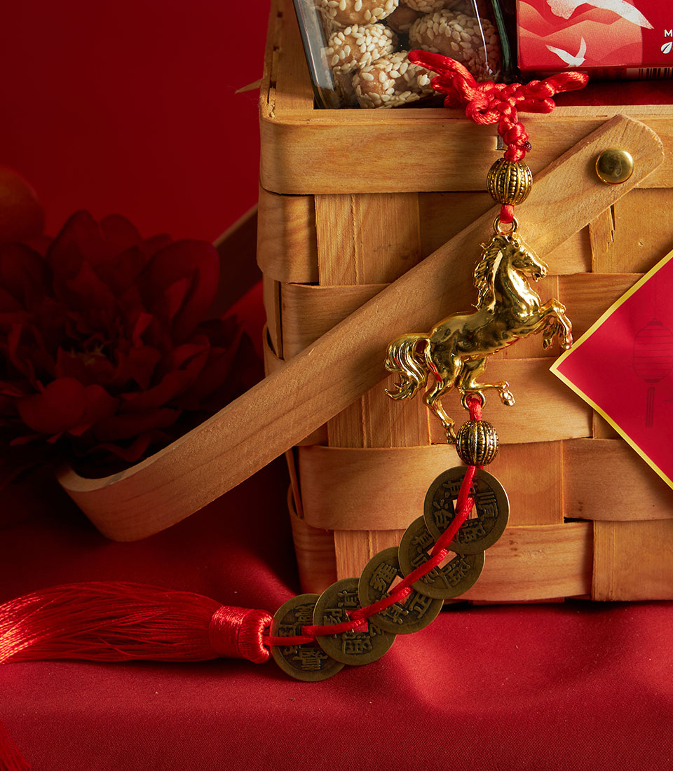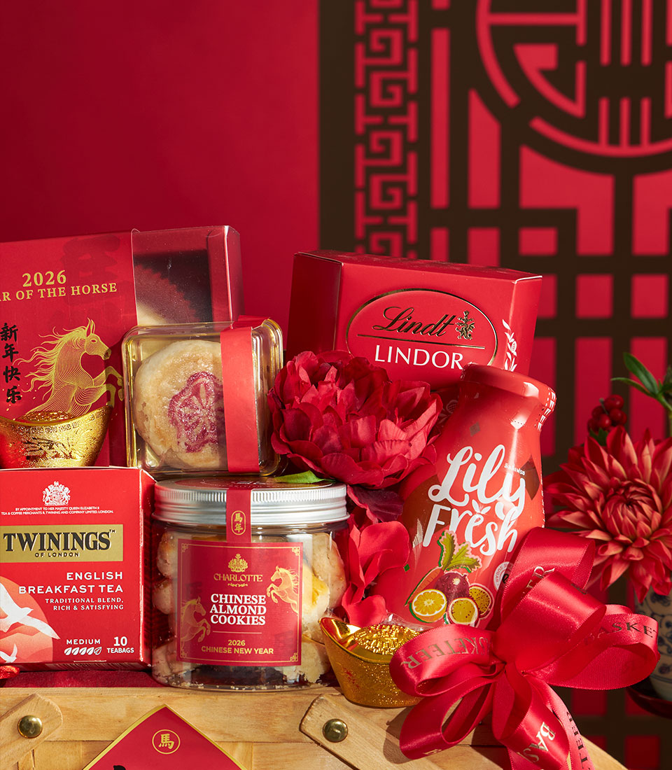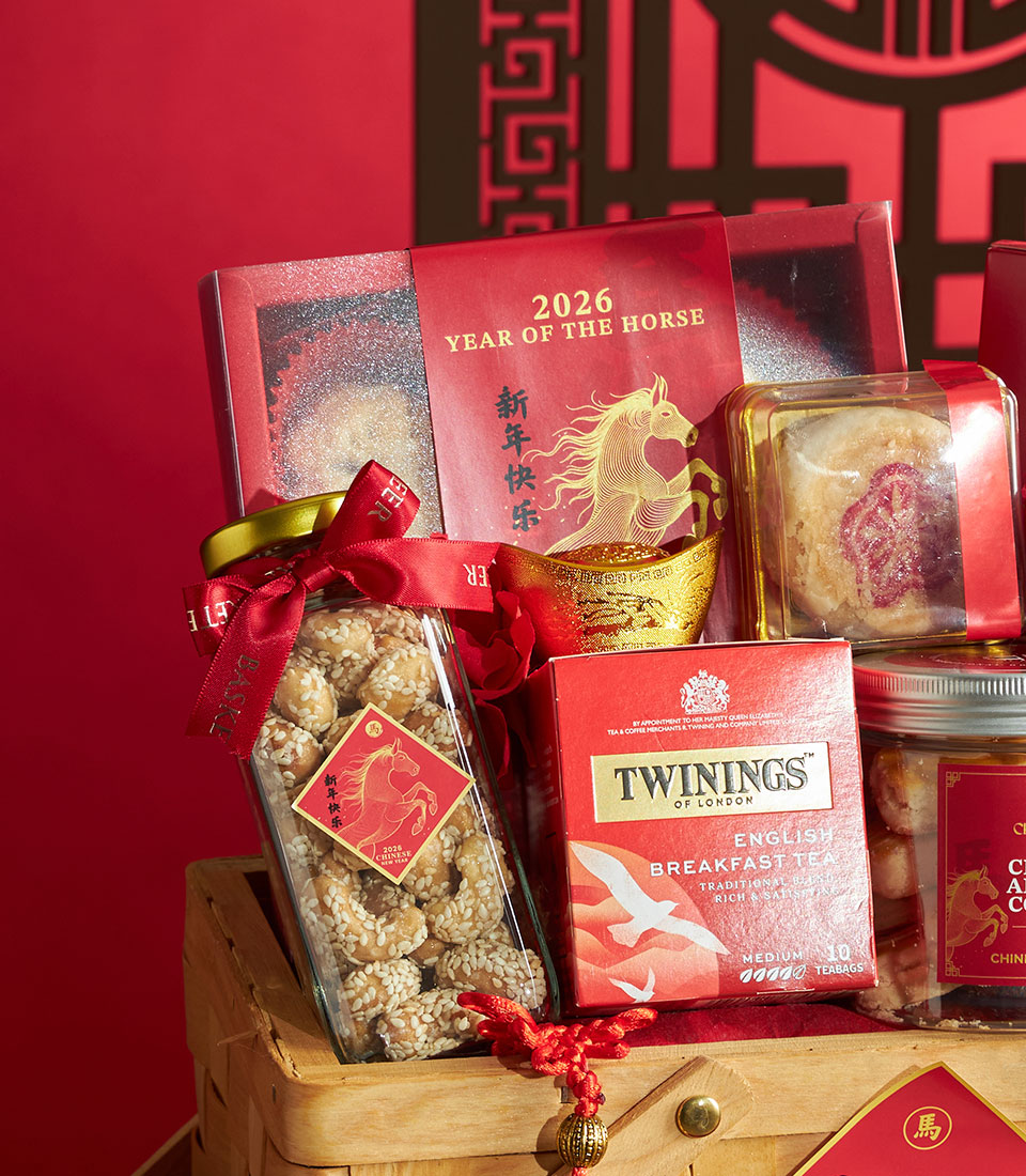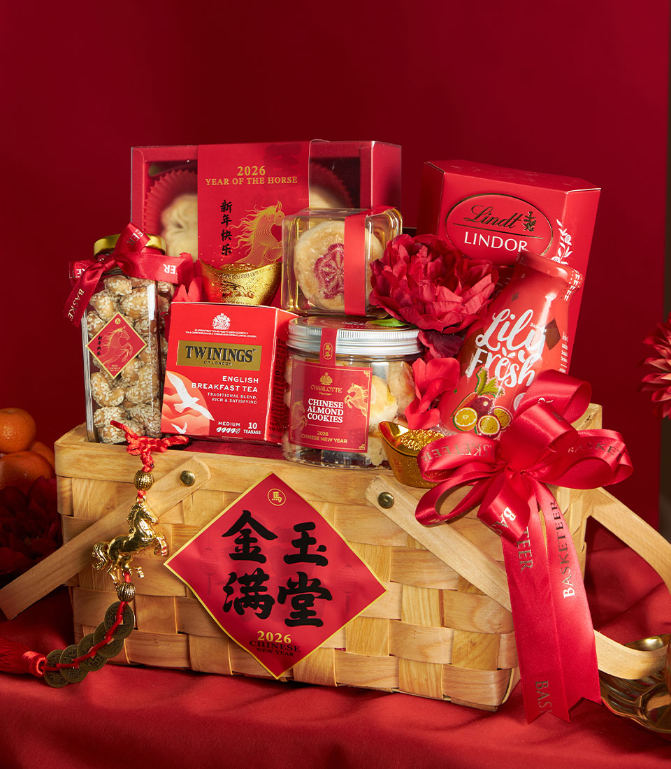 A thoughtfully curated Chinese New Year gourmet gift basket featuring a selection of premium bakery treats, sweets, tea, and festive delicacies. Elegantly presented in a wooden-style basket with auspicious red accents and floral decoration, this basket symbolises prosperity, joy, and appreciationideal for Lunar New Year gifting to family, friends, and business partners.